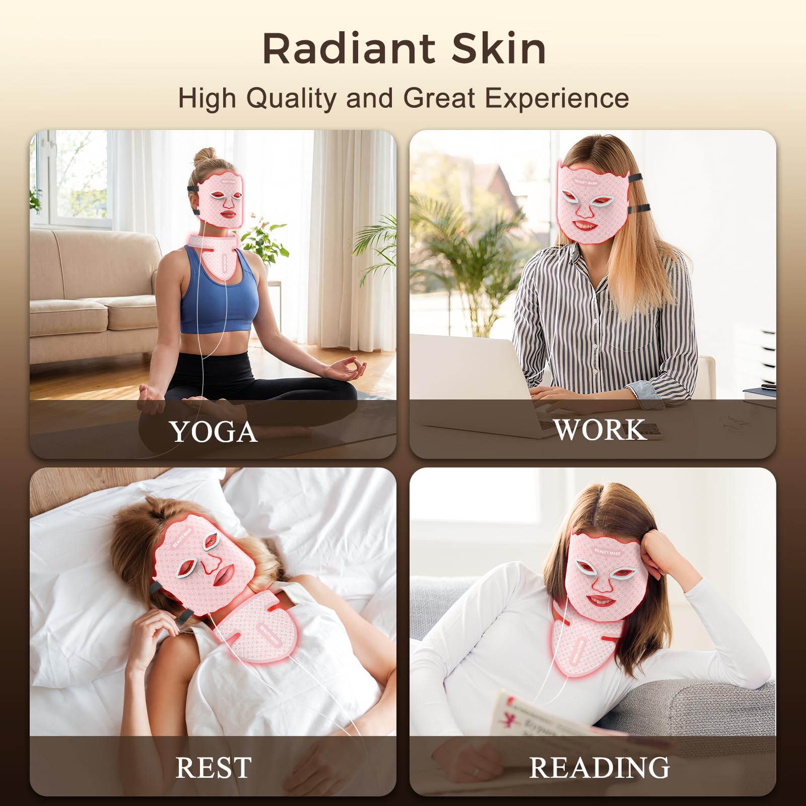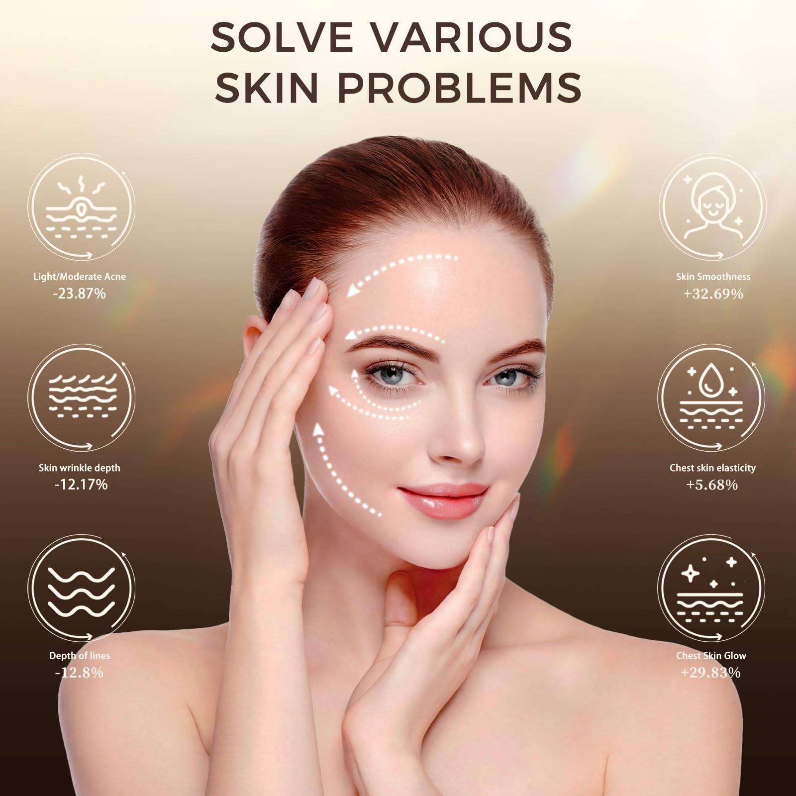 Red Light Therapy for Face & Neck: Red light 660 nm and near-infrared 850 nm are the best combination wavelengths for light therapy. With dedicated LED panels for each zone, the system targets common concerns like uneven skin tone, lack of firmness, and dullness across the face, neck. The light can cover the entire skin layer, penetrate the skin deeper than other lights, solve various skin problems, reduce wrinkles, keeping your skin elastic and youthful.