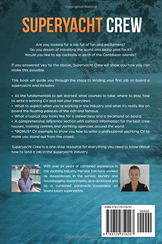 Are you looking to begin your career in the superyacht industry? Are you ready to swap the boring 9-5 for a job full of fun and excitement? Have you been dreaming of a job that lets you work and travel at the same time? If you answered ‘Yes’ to the above, Superyacht Crew will show you how you can make this happen. Discover all the knowledge you need to take the leap and secure your first job. Let Superyacht Crew steer you through the ins and outs of this exciting industry by explaining how it all works, and what steps you need to take to get your foot in the door. Superyacht Crew is packed with high quality content and will show you: What courses you are required to take, as well the optional ones available. How to write a standout CV and nail your interviews. The details of the best crew houses, training centres and yachting agencies in the major yachting ports throughout the world. The best tips and checklists summarised for easy reference. This book will answer questions such as: Where should I start looking for a yacht job? What does a stew or deckhand actually do on board? How much can I earn? What kind of contract should I be given and what should it contain? What is it really like to work on board a superyacht? In this book, you'll benefit from the authors’ 6+ years of experience on the high seas, catering to the demands of the rich and famous. Both Mel and Erin have helped numerous friends start their new careers, and they want to help you too! They tell it like it really is, in order to give you the best chance of succeeding in the industry. Don’t rely on misleading or inaccurate information about the yachting industry circulating around the web. You need concrete, proven information from people who know what it’s really like when you’re starting out in the superyacht industry. Erin and Mel have complied all their knowledge into one simple and straightforward guide that anyone can follow. They share their best tips and strategies and provide step-by-step guidance on how to land a great, first job. Becoming a yachtie is one of the most challenging, rewarding, life-changing, and fulfilling dreams imaginable. The job hunting process can be like a roller coaster, with many ups and downs along the way. Let this book be there to guide you, answer your questions, and build your confidence. With the help of Superyacht Crew, you’ll be out on the water in record time! Superyacht Crew is a must-read guide for all aspiring yachties - get your copy now!