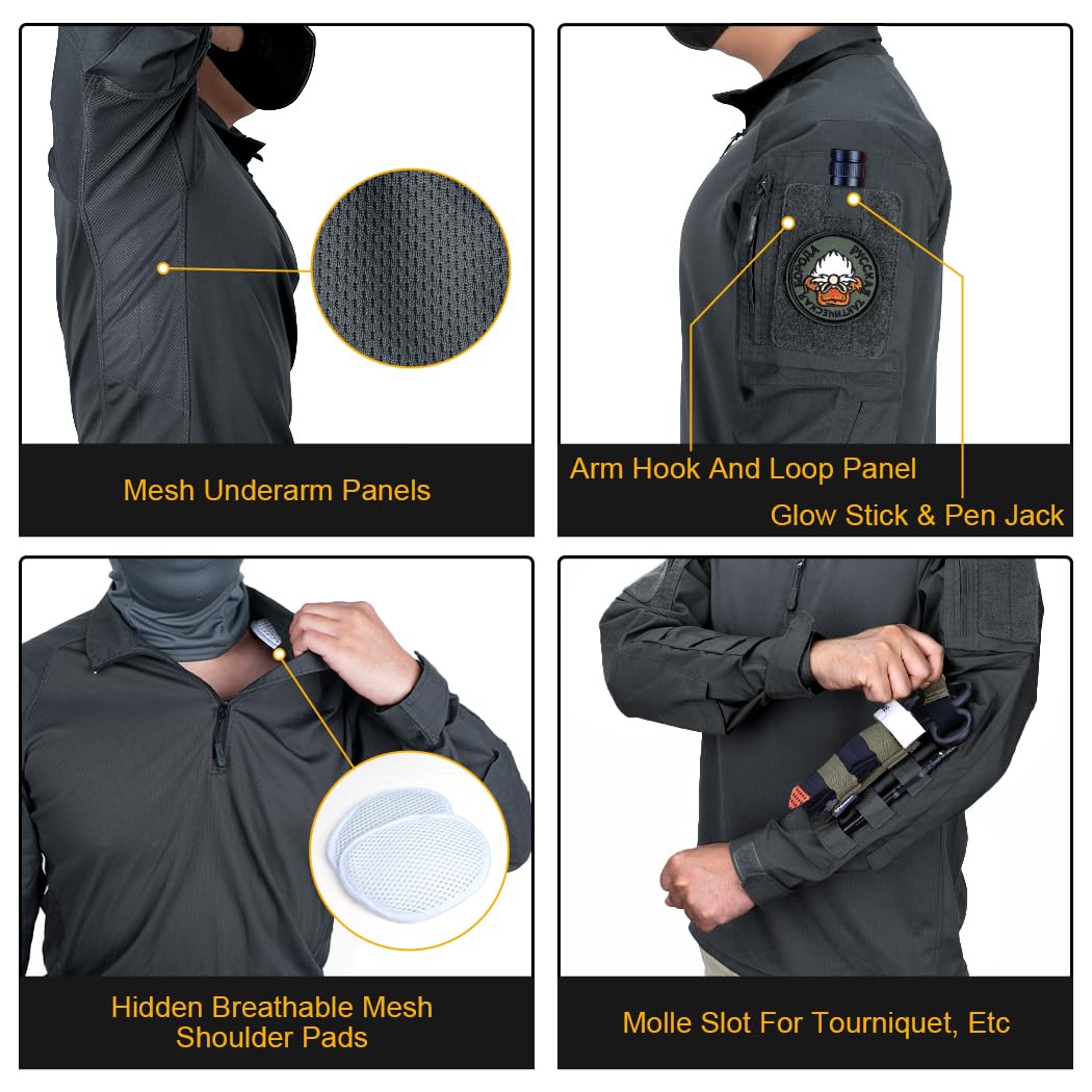 1.IDOGEAR Men's Combat Shirt is made from 100% polyester in the body, a 40% cotton, 55% polyester and 5% spandex blend in the arms, and moisture wicking mesh fabric made from 89%polyester and 11% spandex in the underarms to keep you dry during outdoor activities such as hiking, fishing and camping.