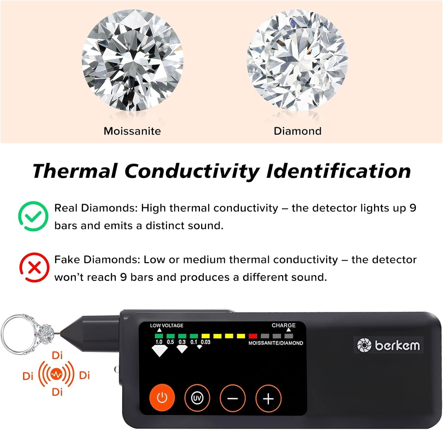 ✅💎High-Frequency Sound when Testing Metal -The high-frequency sound during metal testing is due to the test pen's operational principle, which relies on thermal conductivity to distinguish between diamonds and fake gemstones. Since metal possesses thermal conductivity similar to diamonds, it generates a high-frequency sound during testing.[Warm Notice]:Make sure to test according to the correct testing procedure, avoid using the diamond tester on unsuitable items(metal,skin,water and ect.), to ensure accurate testing results. Any improper operation may affect the accuracy of the test.