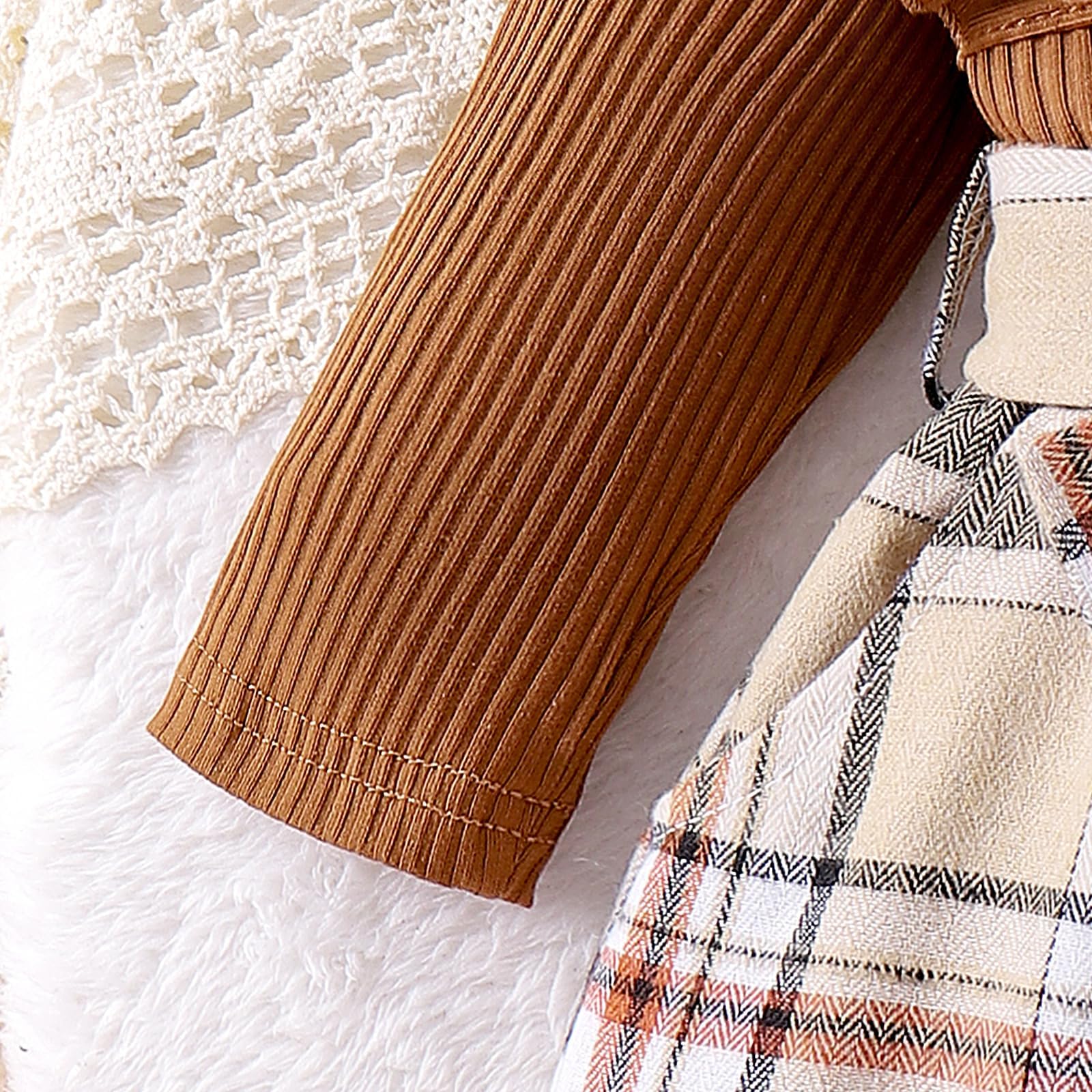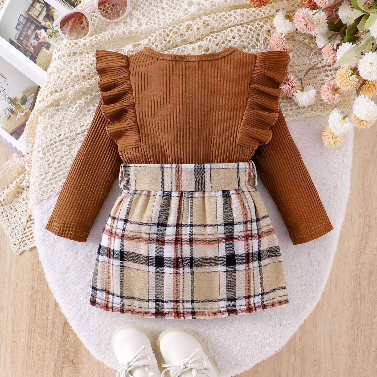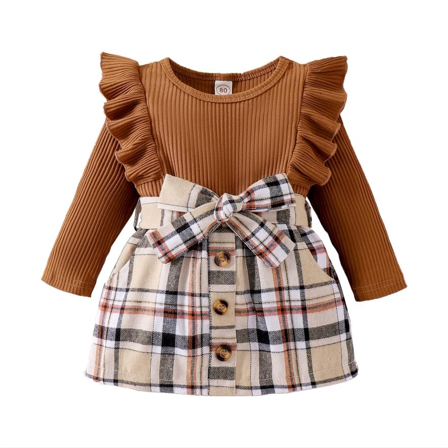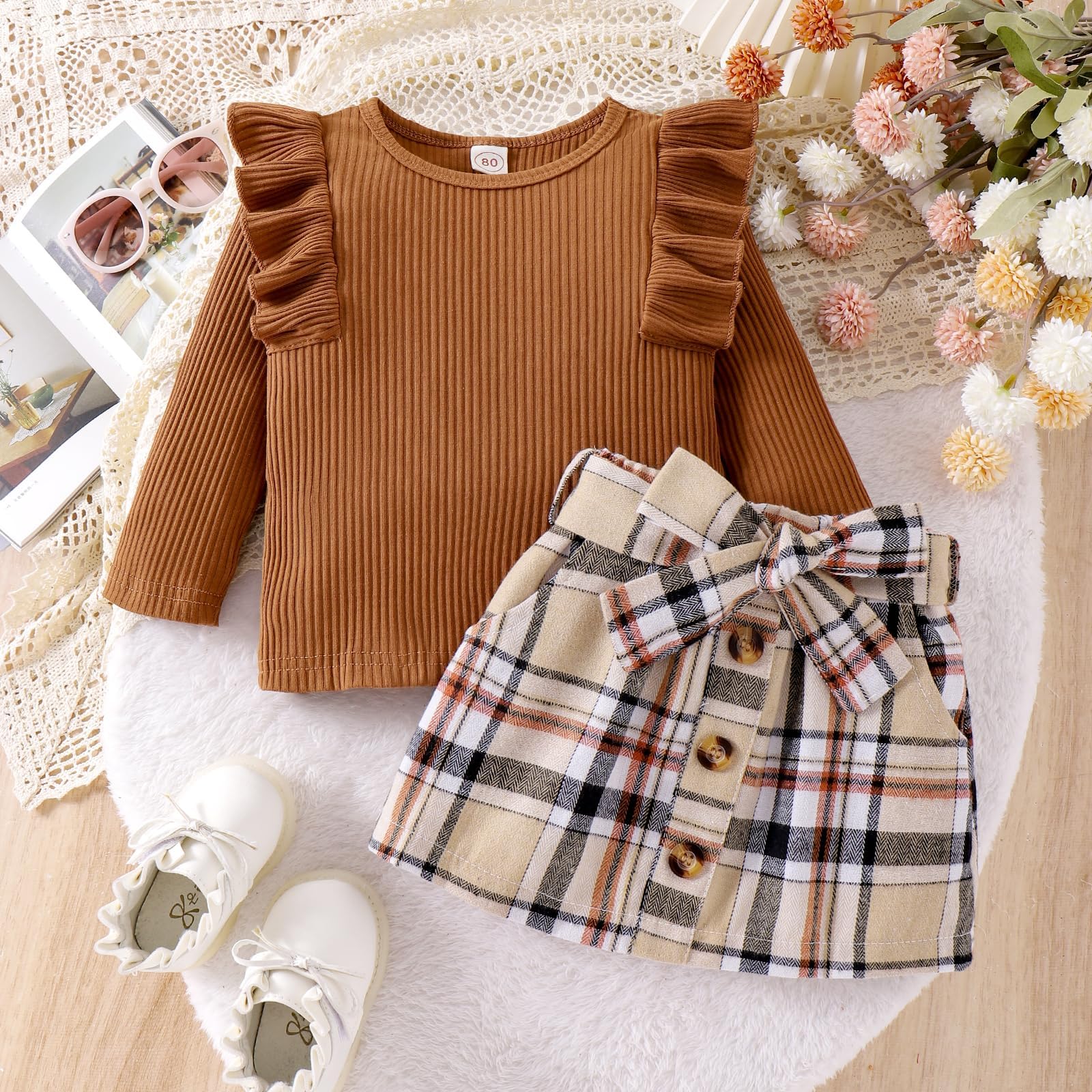 Feature: Baby girl fall outfits, long sleeve knitted sweatshirt top , crewneck, comfy ribbed shirt and tweed red plaid skirt set, adjustable belt skirt, lovely and stylish, Suitable for your little princess in autumn winter and Christmas wear.
