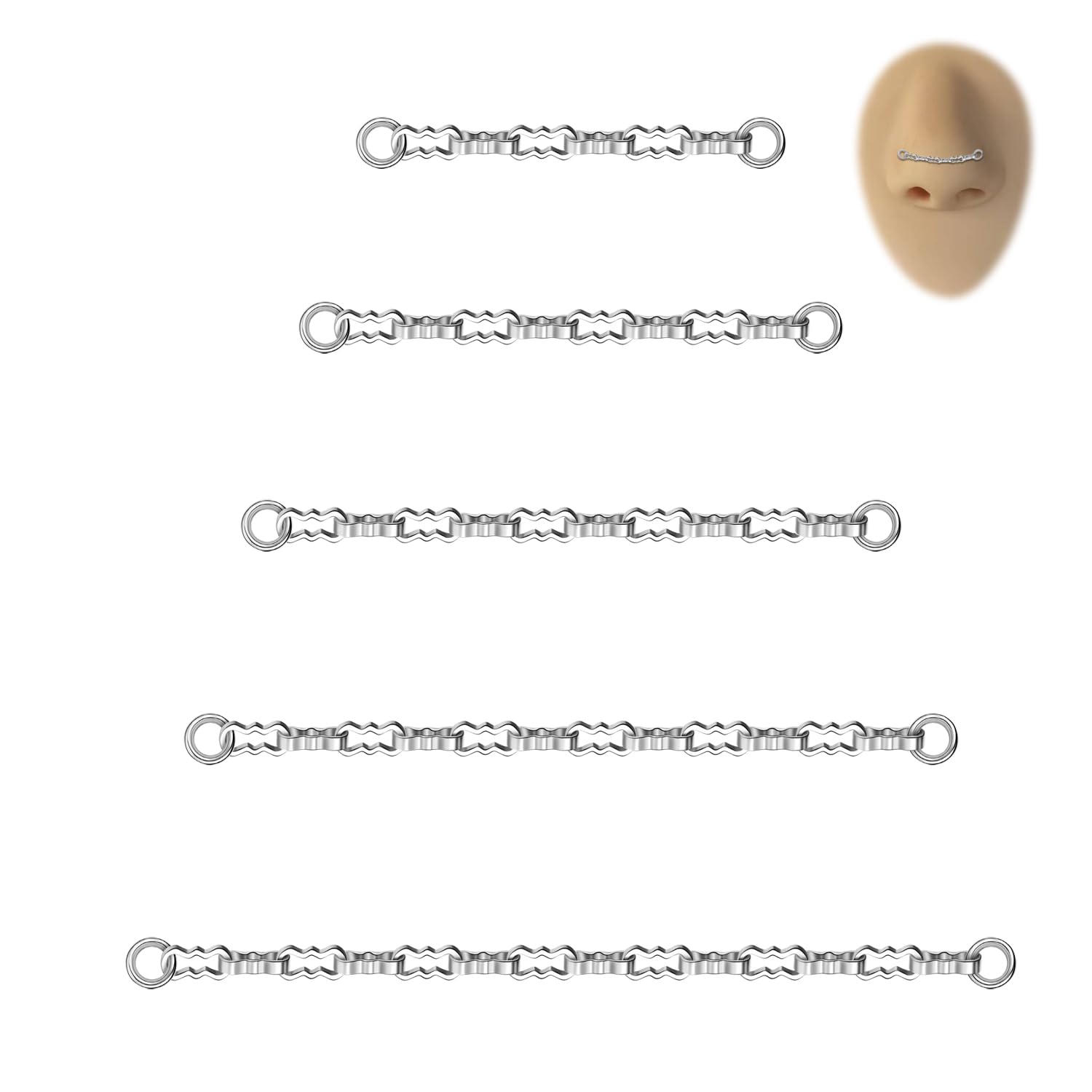 ★Packaging & Size: Five different sizes of nose ring chains, 32mm, 35mm, 40mm, 45mm, 50mm, meet your wearing needs for different parts. (This set does not include nose studs, nose rings, or earrings)