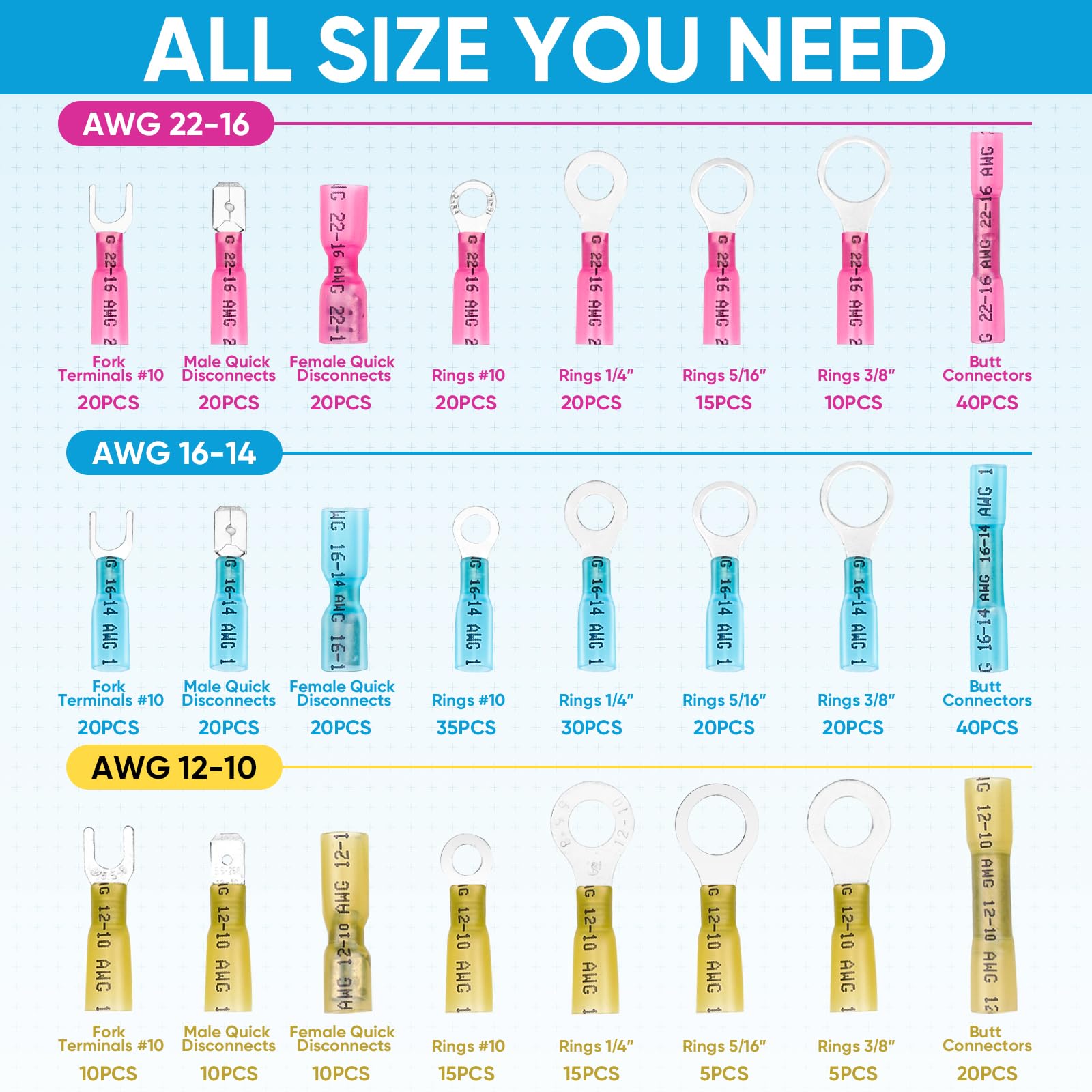 [TYPE and SIZE] The connector assortment includes red, blue and yellow connectors that can be used on wire AWG from 22 to 10. Five connector types: butt connector, ring connector (stud size: #10, ¼’’, 5/16’’, 3/8’’), female quick disconnect connector, male quick disconnect connector and fork connector (stud size: #10) are packaged in each connector kit.