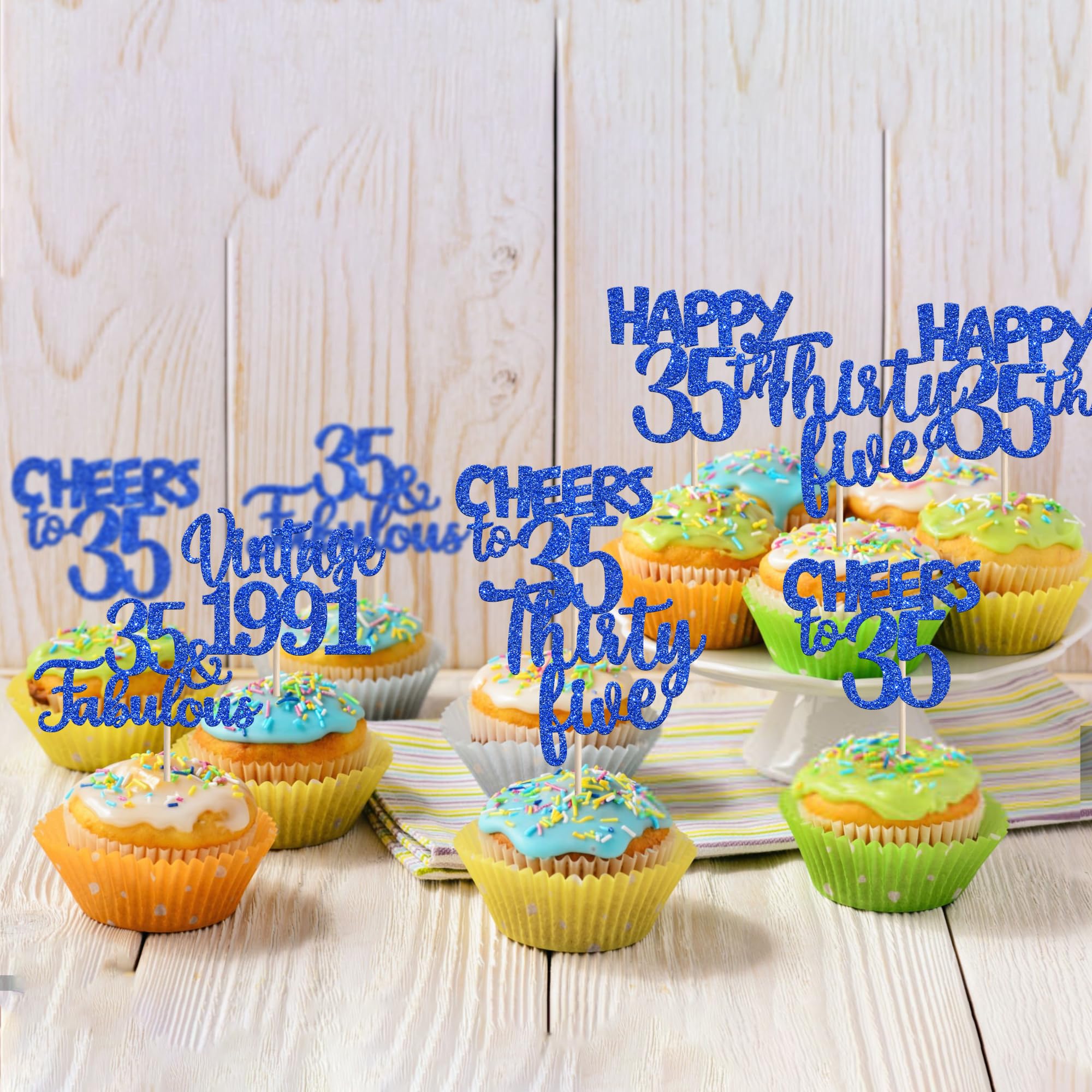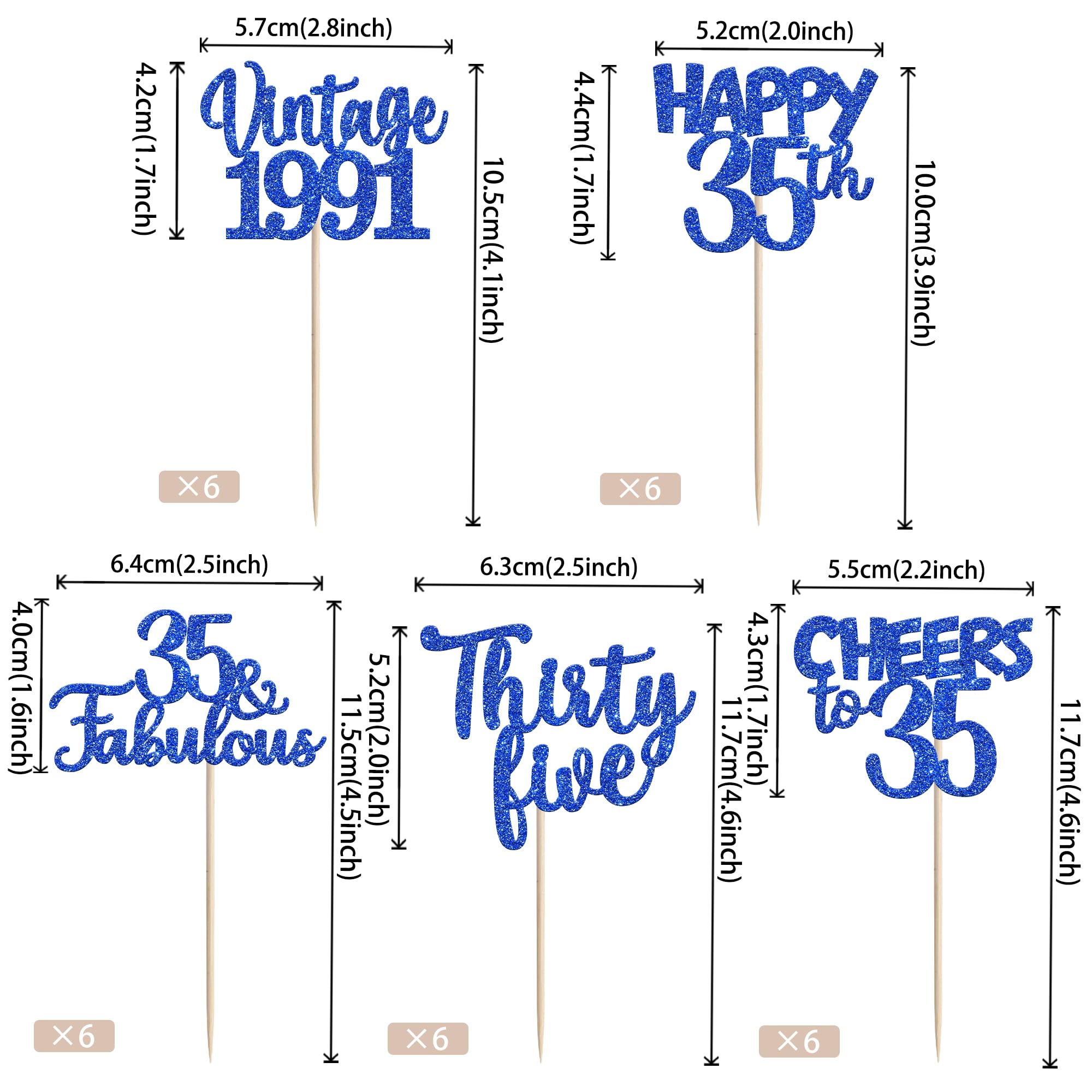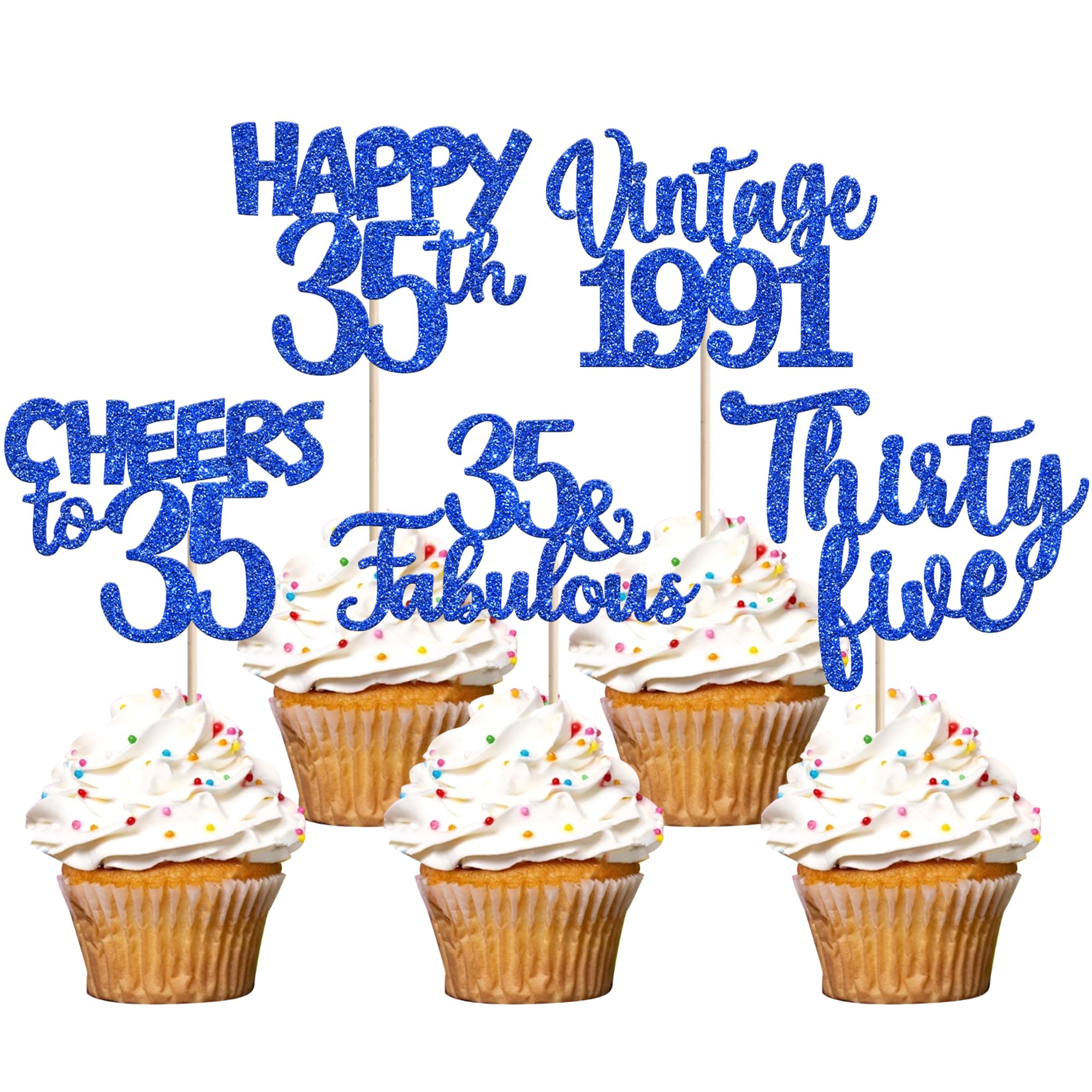 Vintage 1991 Happy 35th Birthday Party Cupcake Toppers Decoration Supplies Perfect for vintage 1991 theme party, 35th birthday theme party, 35th wedding anniversary theme party,cheers to 35 years theme party cupcake decorations supplies. Pack of 30 pcs,6 pcs of each design The size is 2.8*4.1/ 2.0*3.9/ 2.5*4.5/ 2.5*4.6/ 2.2*4.6 inch ( with stick ) Made of high quality paper card stock,thick and thick and sturdy. These vintage 1991 cupcake toppers are single glitter, the back is white, and they are intended for decoration only, please do not put them in oven or microwave. If the item you received has any defects, please contact us immediately.we will deal with it within 24 hours.