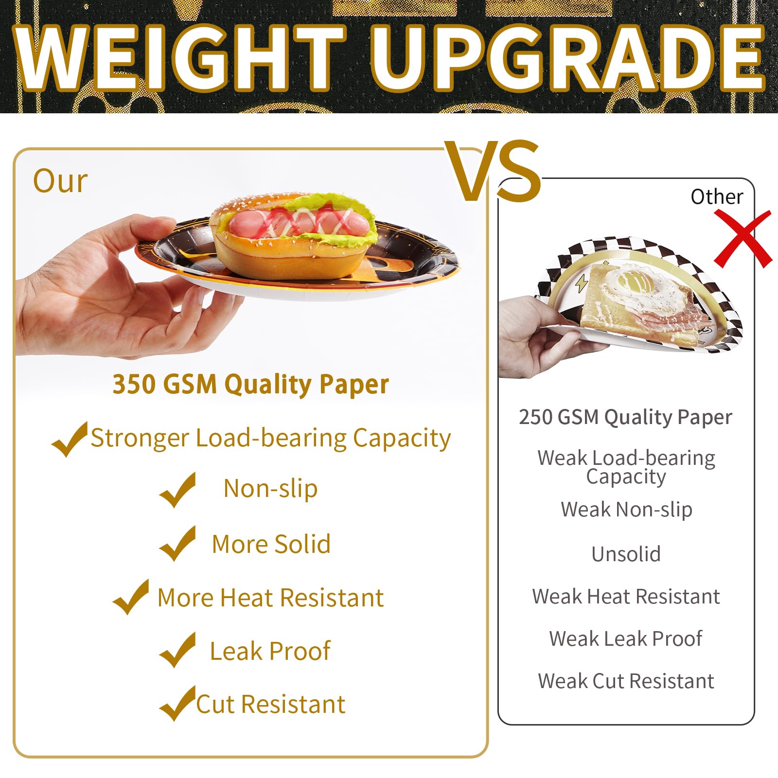 Upgraded Material: Our VIP plates and napkins are made of premium thick paper. The red carpet plate is upgraded to 350g, more solid and durable to resist cutting; the napkin is 3 ply, soft and absorbent more thick; the fork is not easy to break; the pattern is beautifully printed will not fade. Tip: Please do not microwave the plate