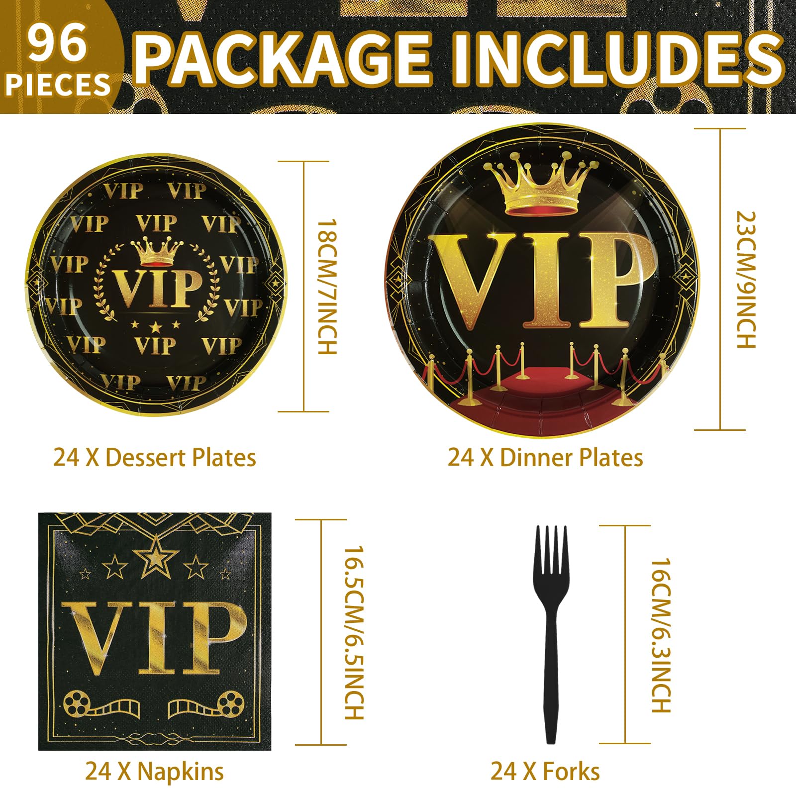 What You Get: Get the red carpet party decorations to elevate your celebration to the next level. VIP tableware set includes 24 9" VIP plates, 24 7" VIP plates, 24 VIP napkins and 24 forks for 24 guests. Movie night party supplies are enough to decorate your VIP party
