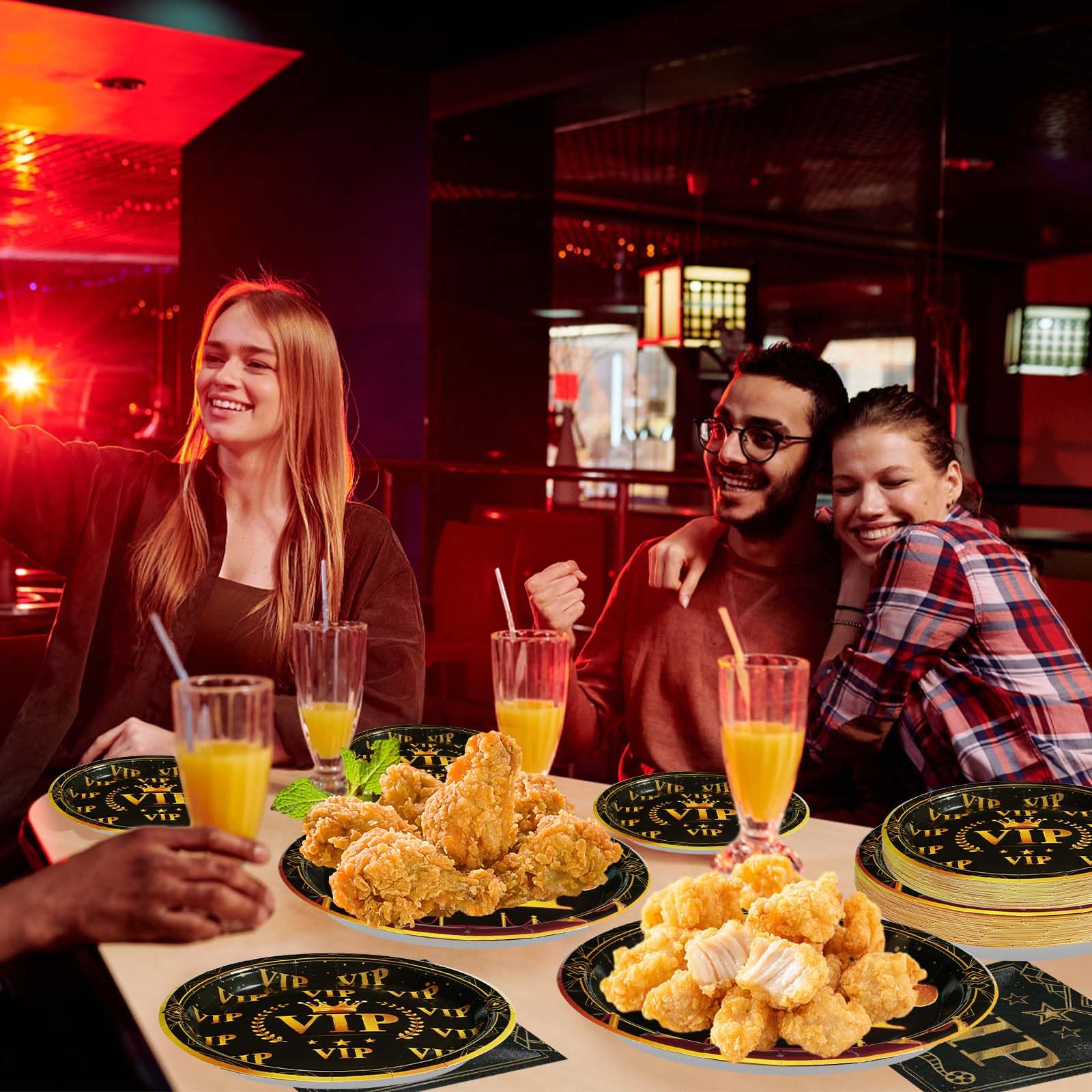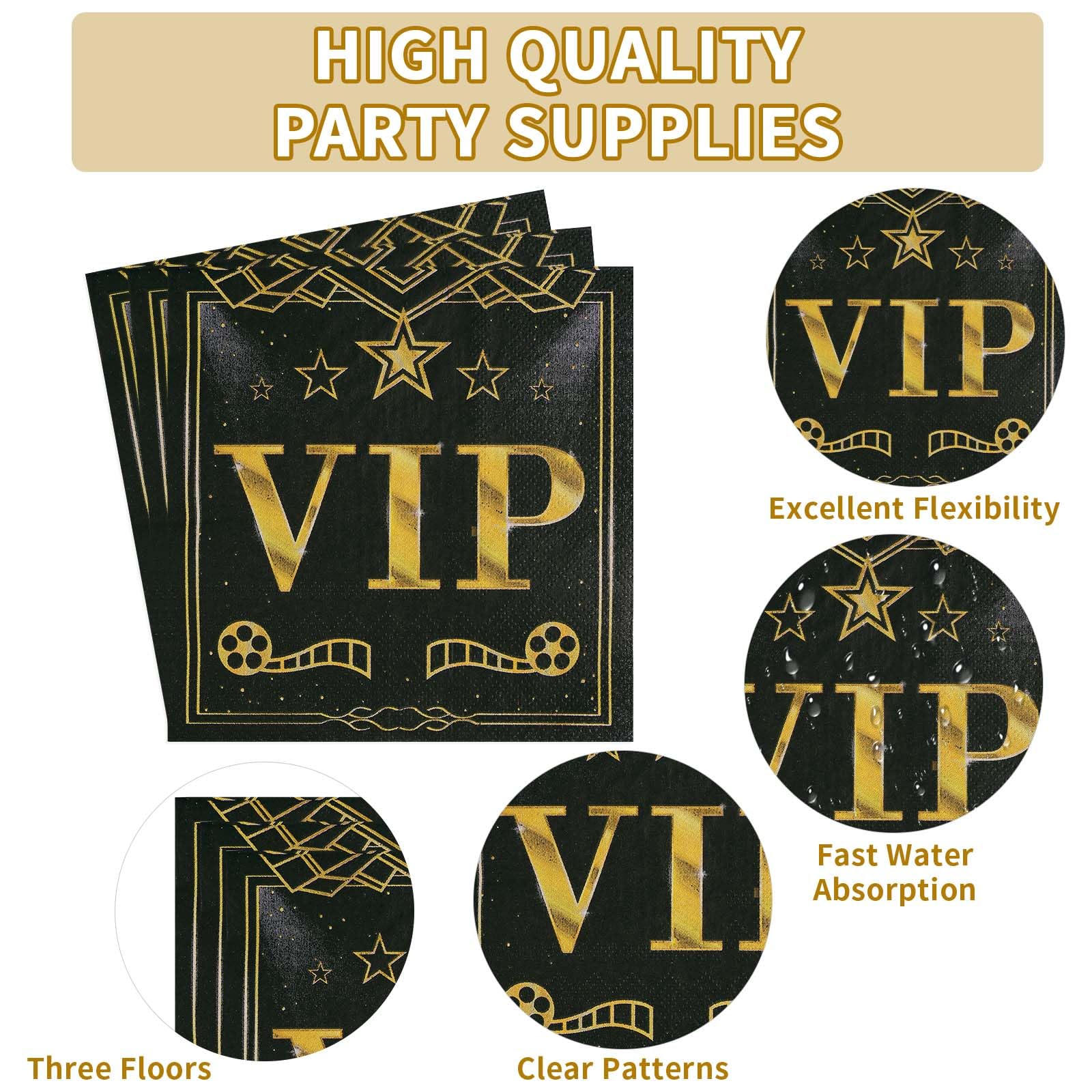 VIP Theme Design: Our movie night decorations tableware printed with eye-catching VIP word, make a statement with our attention-grabbing red carpet-inspired design, adorned with fine gold glitter and lighting. VIP party decorations kit will set the mood and add a touch of opulence to any important occasion