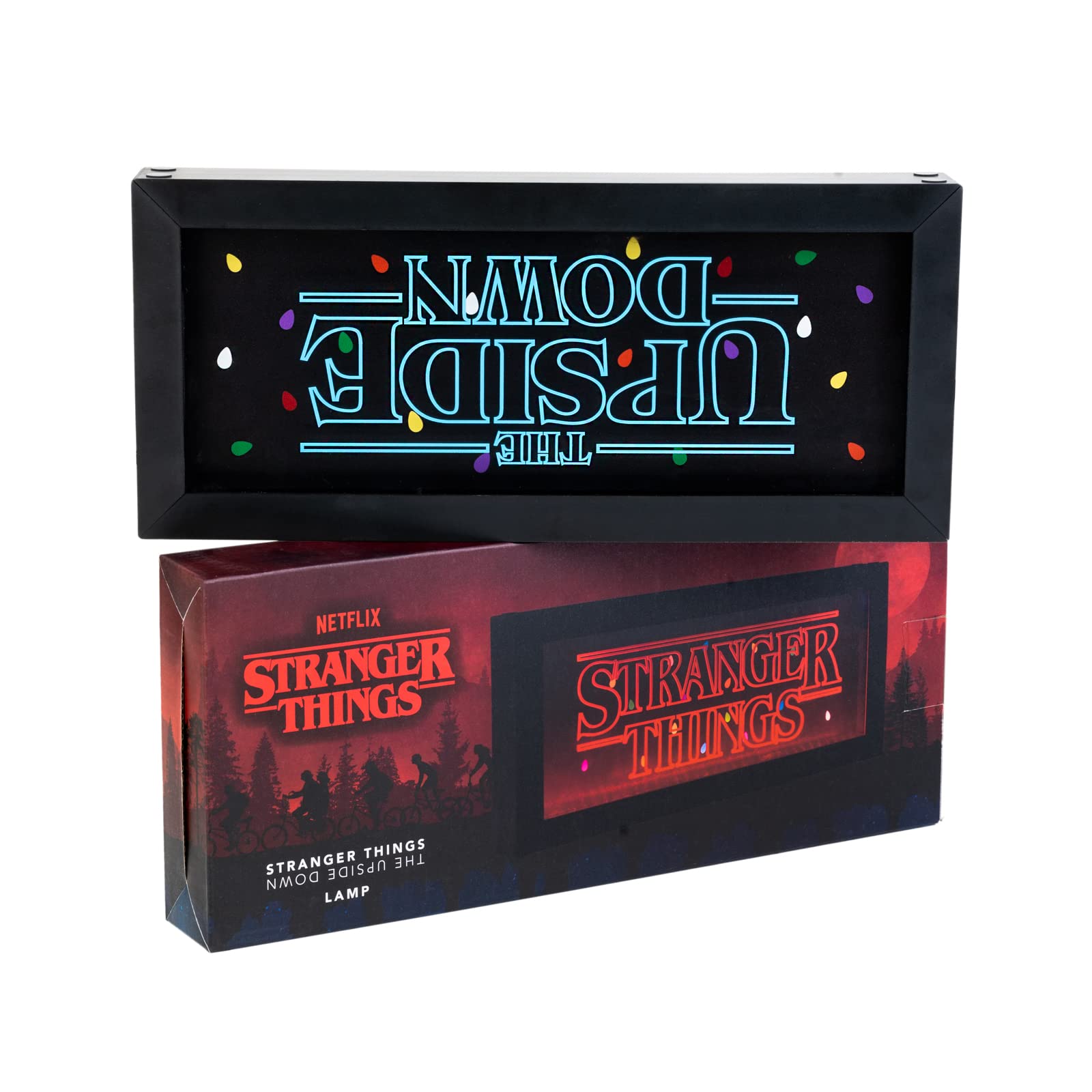 What's not to love about Netflix's hit sci-fi series Stranger Things? From the nostalgic 80s feels to the eclectic soundtrack; supernatural, spooky adventures in a small town to the uber-talented cast of kids and cult characters it's got all the ingredients for a truly explosive sci-fi series and turned our worlds Upside Down from the very first episode. WARNING: 1. For Indoor use only. 2. It is not a toy and please keep out of reach from the children. Batteries, battery cover & screws may be swallowed by children. 3. Please don't dissemble this product in order to avoid the abnormal operation. 4. Keep away from fire, water and humidity. Store in a dry and cool place. 5. Please install correct batteries (4.5V = 3 x AAA). Otherwise, it may cause short-circuited. 6. Please remove the batteries when not in used. 7. Please do not mix new and used batteries. 8. Please do not mix alkaline, standard (carbon-zinc), or rechargeable (nickel-cadmium) batteries. CLEANING INSTRUCTIONS: Wipe acrylic with a clean soft cloth. Do not use abrasive cleaners as it will damage surface. MATERIAL: ABS + Acrylic. BATTERY: 4.5V = 3xAAA (Batteries are not included). USB: Type C (included). NET WEIGHT: 667.5g.