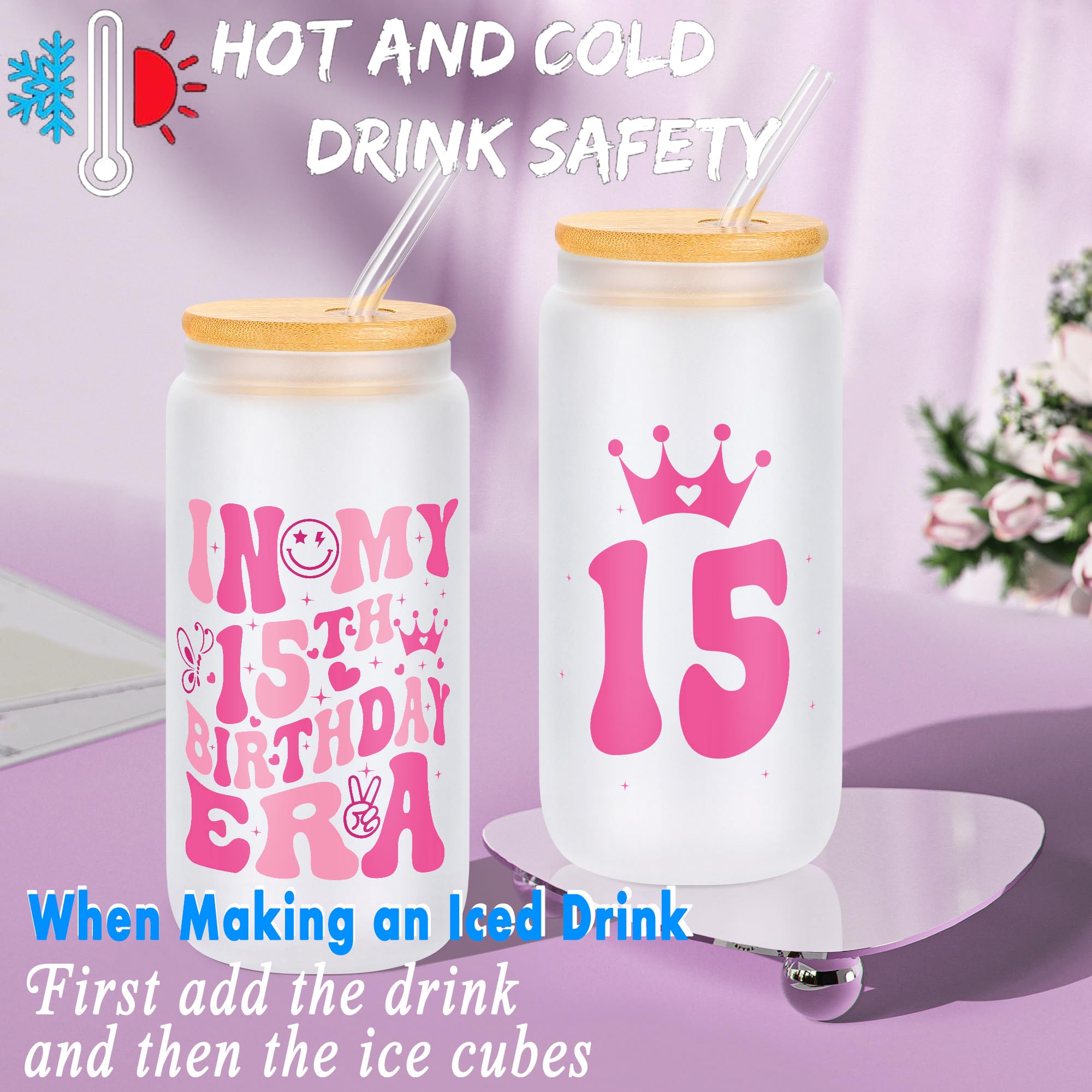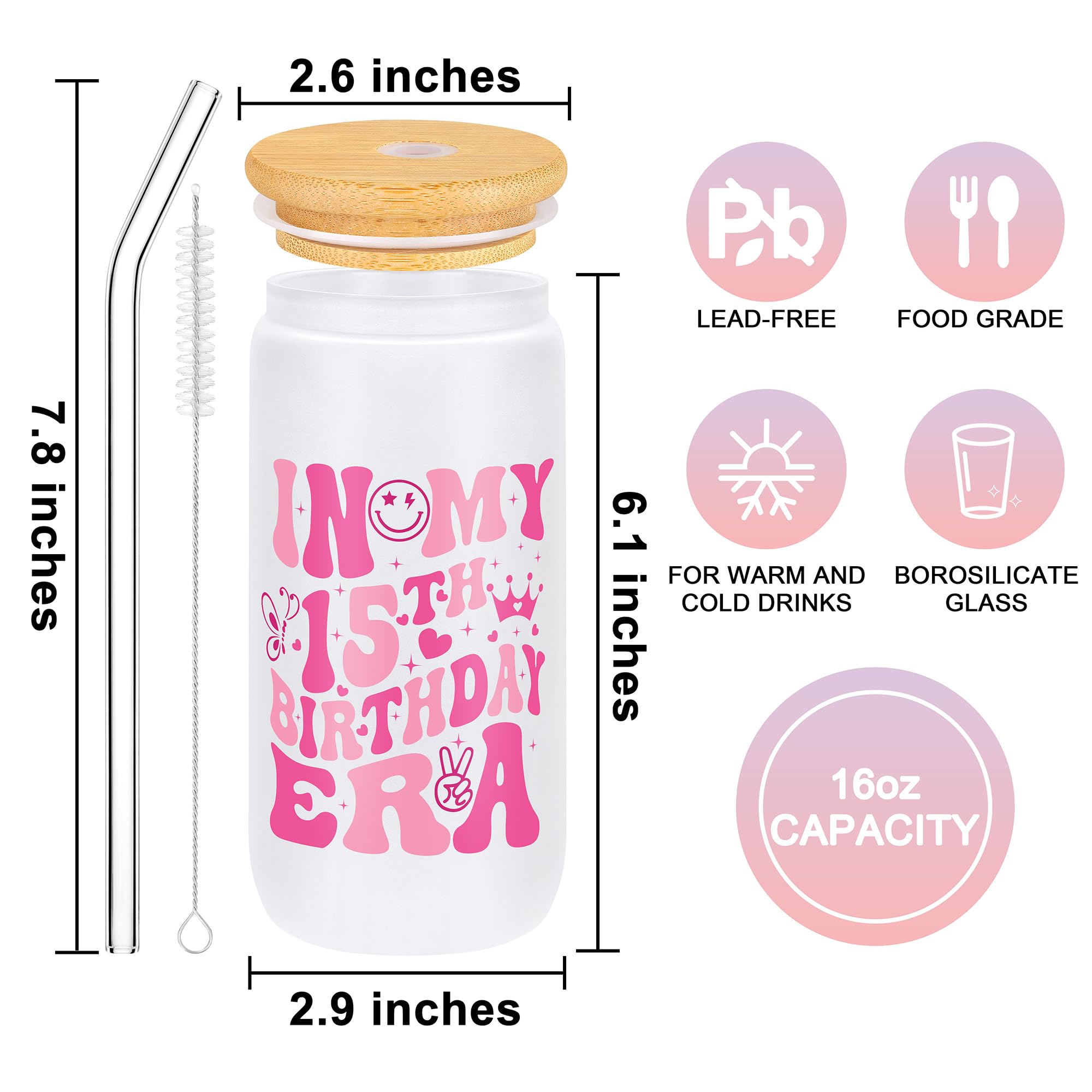 đăGifts for 15 Year Old Beautiful Teen GirlăBirthday 4 piece set includes 1 x 16 Oz can glass with lid and straw, 1 x Socks made of pure cotton, unique design and cute style, 1 x heartfelt congratulations card on kraft paper and 1 x stylish pearl necklace with a souvenir card.