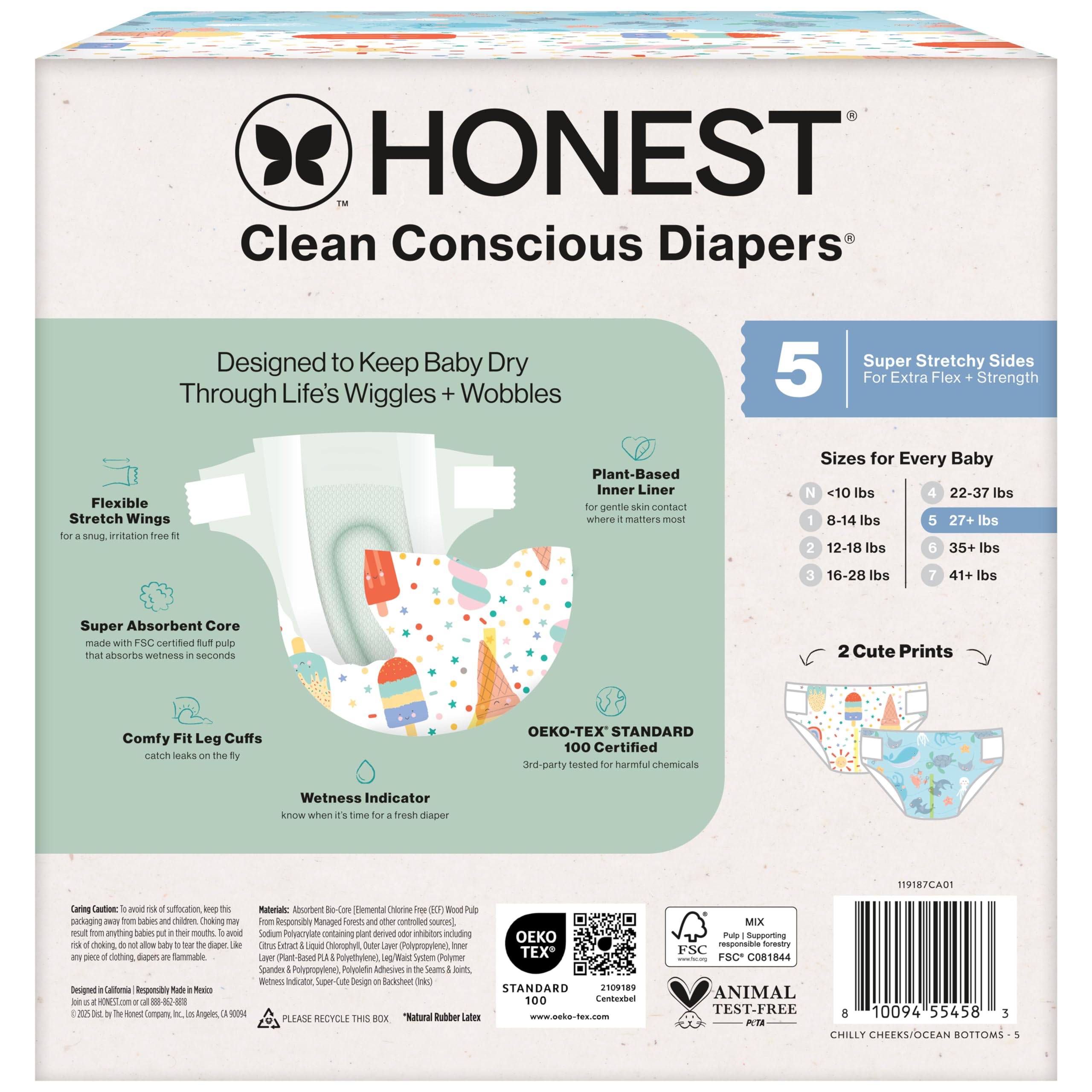 Designed to protect delicate skin, Honest Clean Conscious Diapers keep baby comfortable and dry through all the wiggles and wobbles! Our softest diaper yet delivers up to 100% leak protection with Comfort Dry Technology. The hypoallergenic, plant based inner liner, flexible stretch wings, super absorbent core, and channel technology provide a comfy, secure fit for all ages and stages. Because safety is top priority, these diapers are OEKO-TEX STANDARD 100 Certified, a 3rd party that tests for 350 harmful chemicals, and made with FSC Certified Fluff Pulp and other controlled materials. And for cuteness overload, each diaper features a super cute print!