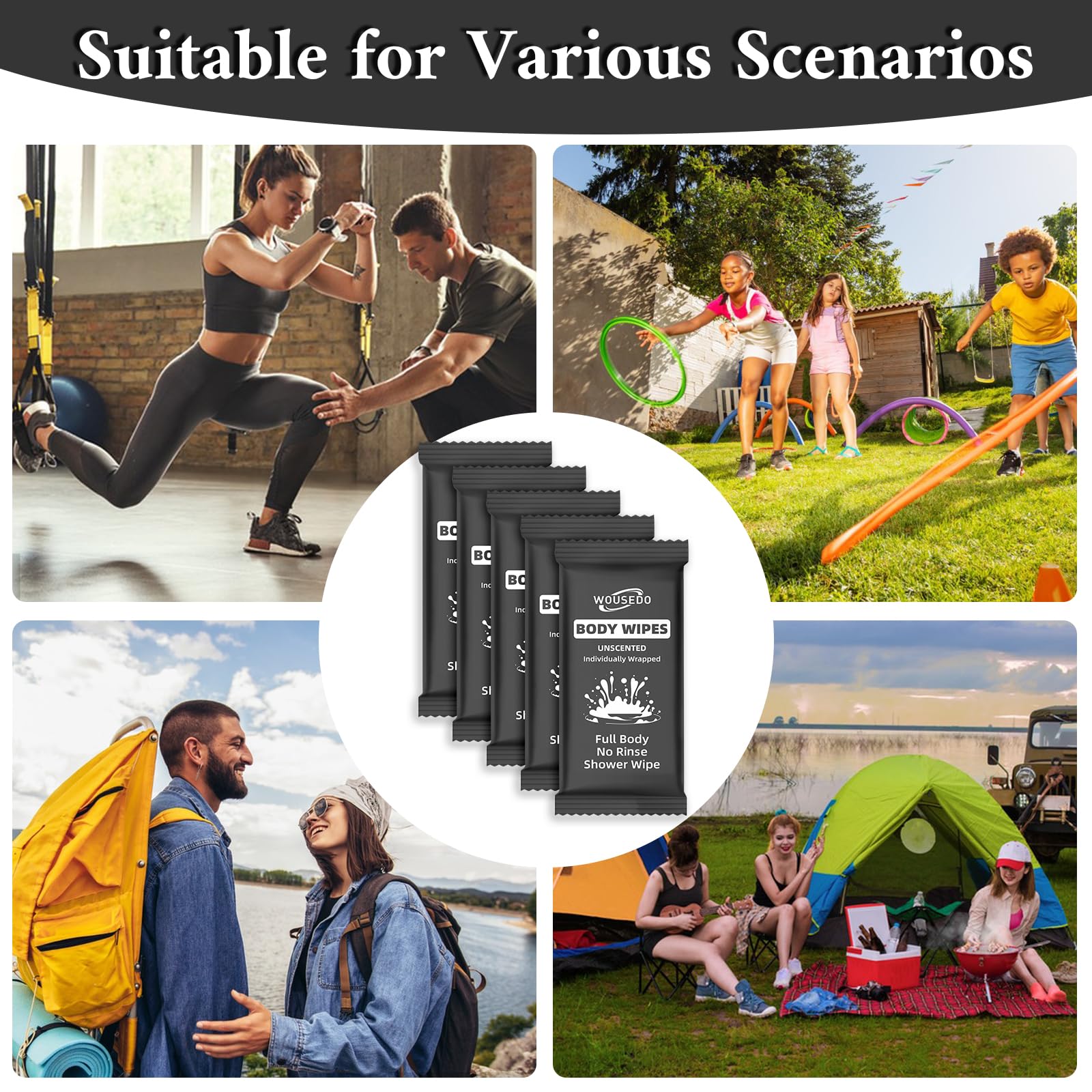 Wide Applications: Our body wipes are suitable for all age groups and can be applied in a variety of scenarios. Whether you are traveling, camping, exercising, or just need a quick refreshment during the day, our shower wipes are always handy. They are a convenient and efficient cleaning solution that fits your active lifestyle, suitable for home, office, gym and other outdoor settings.