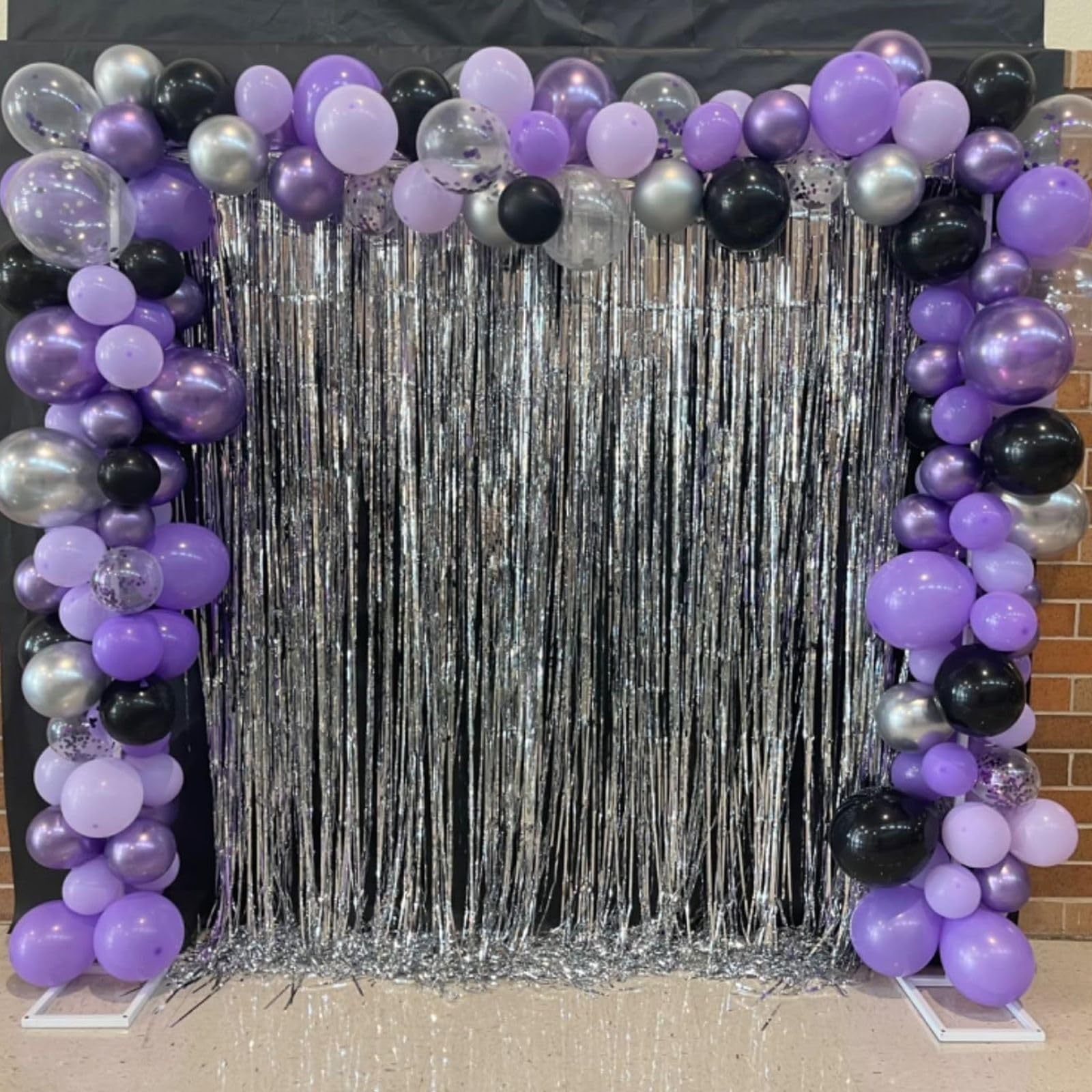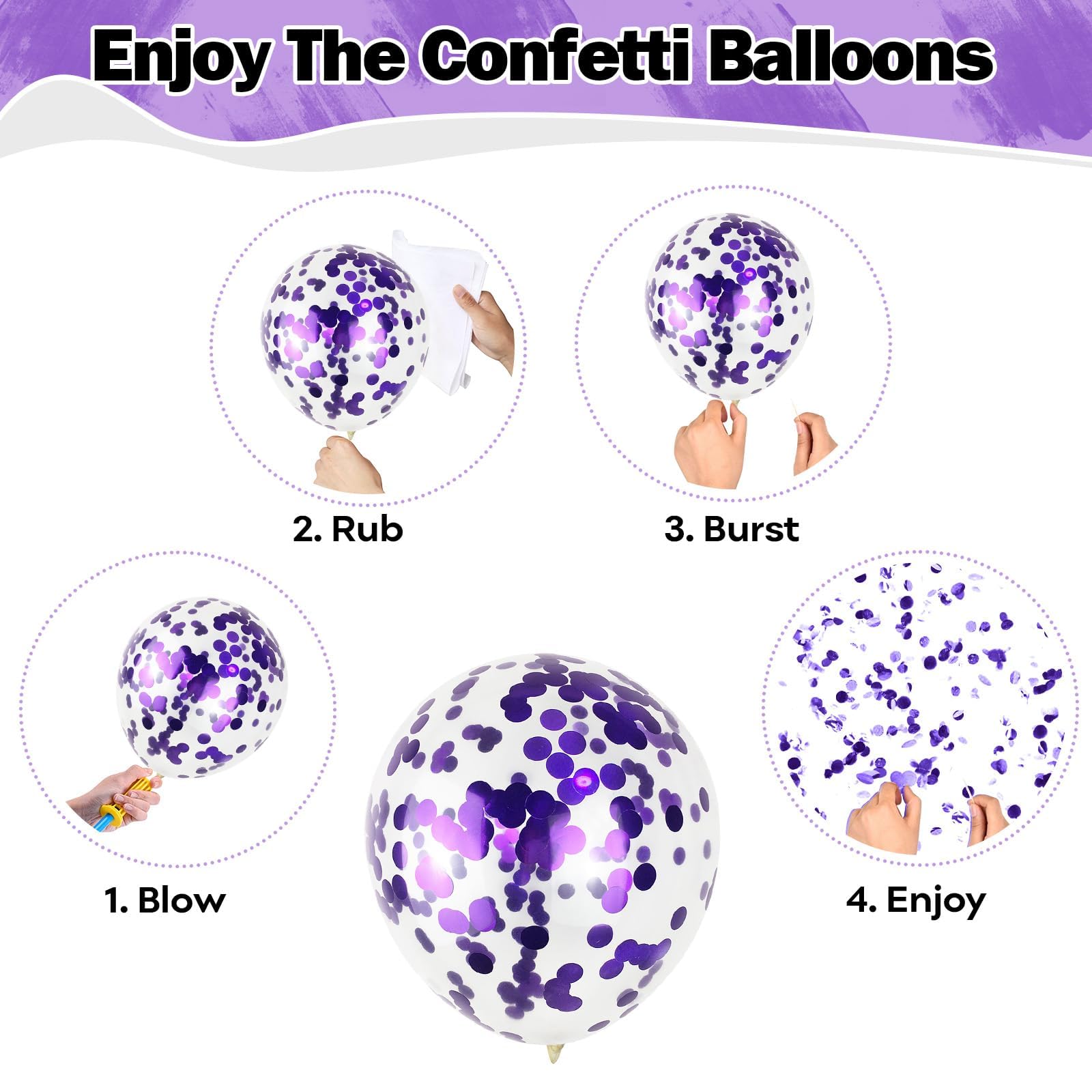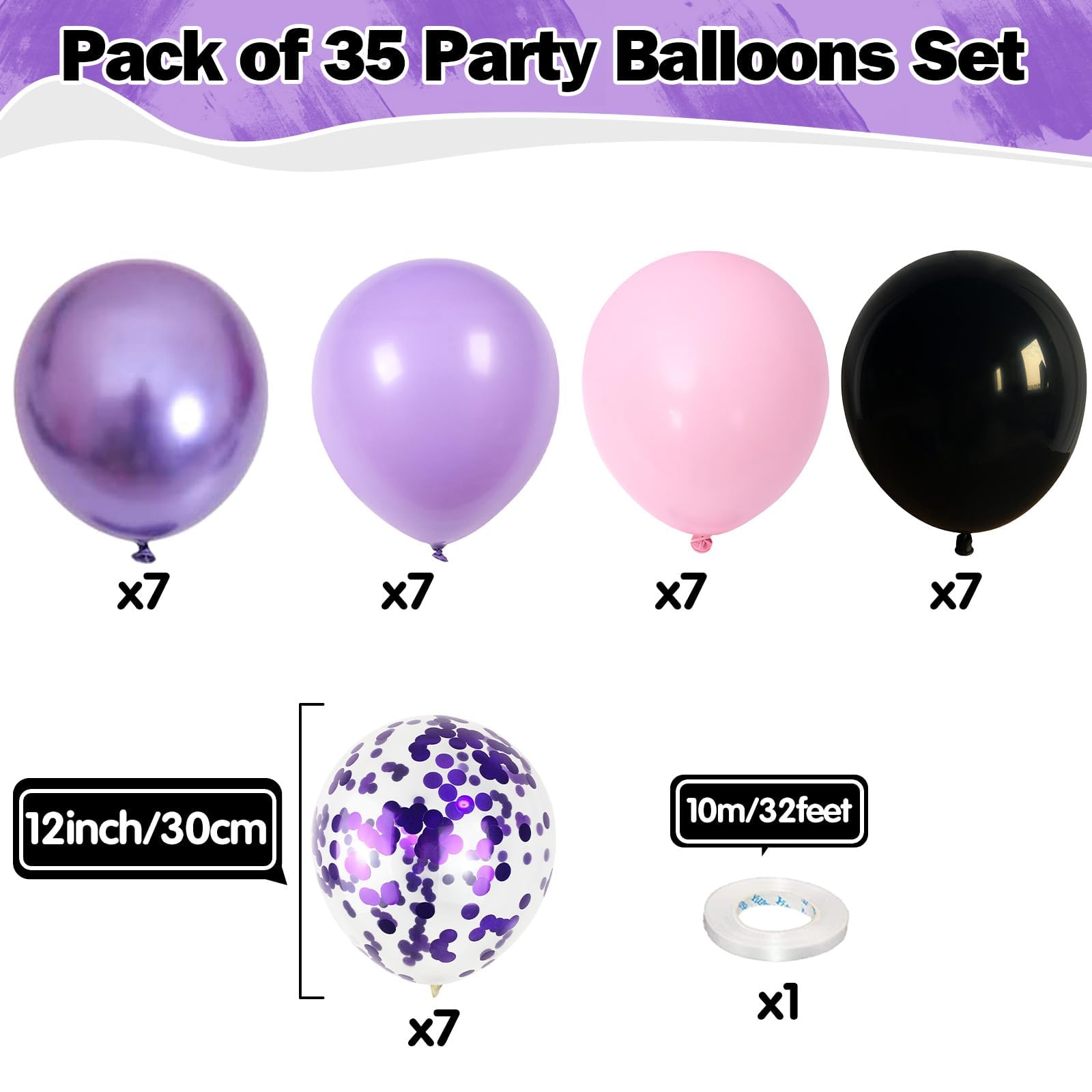 πPackage Includes - You'll get 35 pieces 12 inch party balloons (7pcs metallic purple balloons, 7pcs pastel purple balloons, 7pcs pastel pink balloons, 7pcs black balloons, 7pcs purple confetti balloons) and 1 roll of 10m ribbon, which are enough to decorate your party, these dazzling colors will make your party very attractive, a great way to decorate any theme party. You can make your balloon backdrop, balloon arch garland, balloon bouquet, home or table decorations and more.