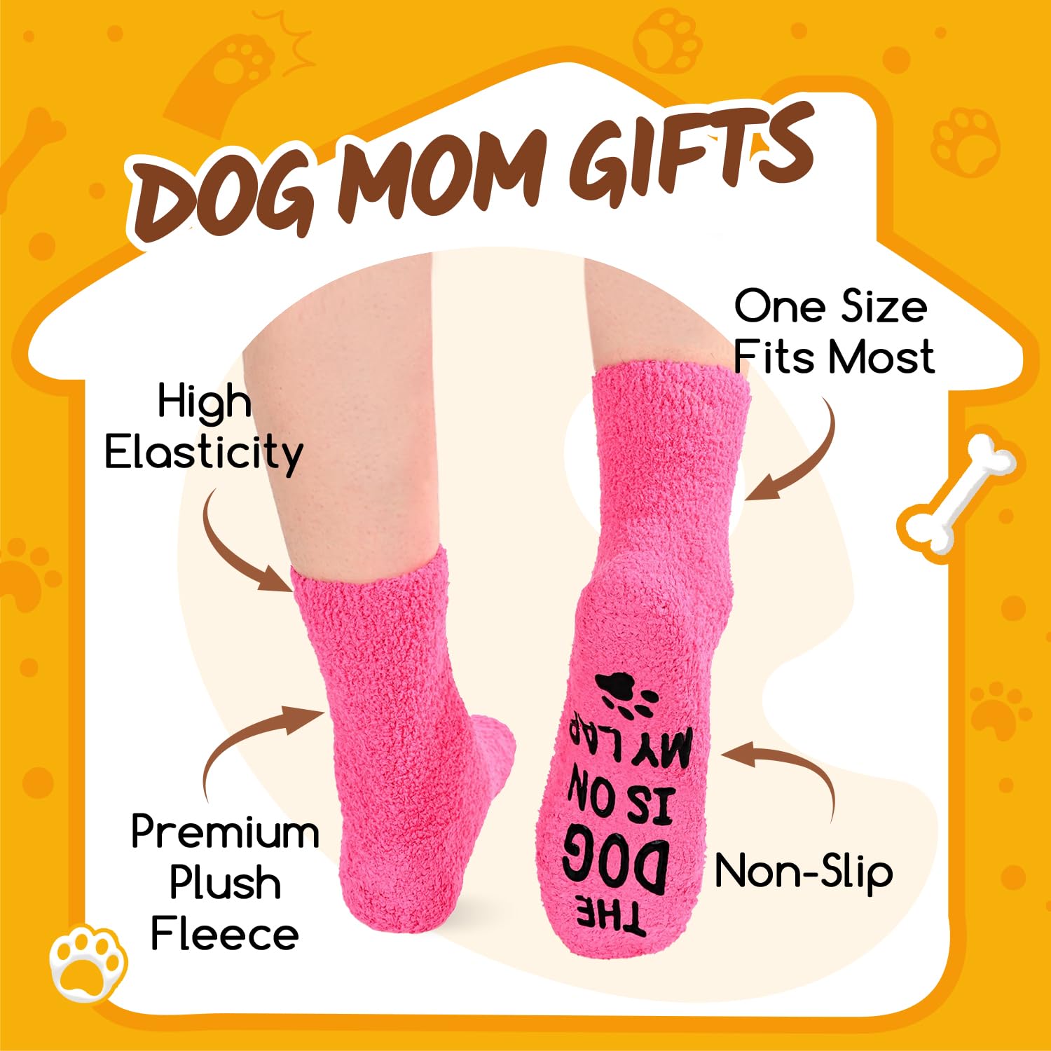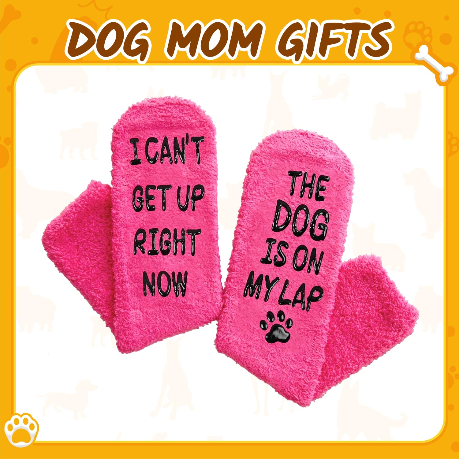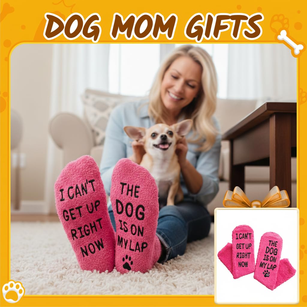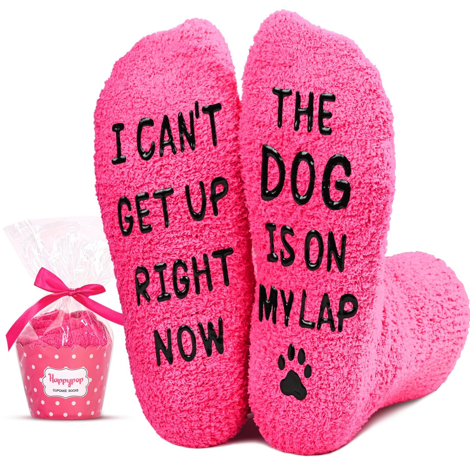 FUZZY DOG MOM SOCKS: These hot pink funny dog mom socks feature cute dog paws, grippers on the bottom and the humorous sayings "I CAN'T GET UP RIGHT NOW THE DOG IS ON MY LAP".