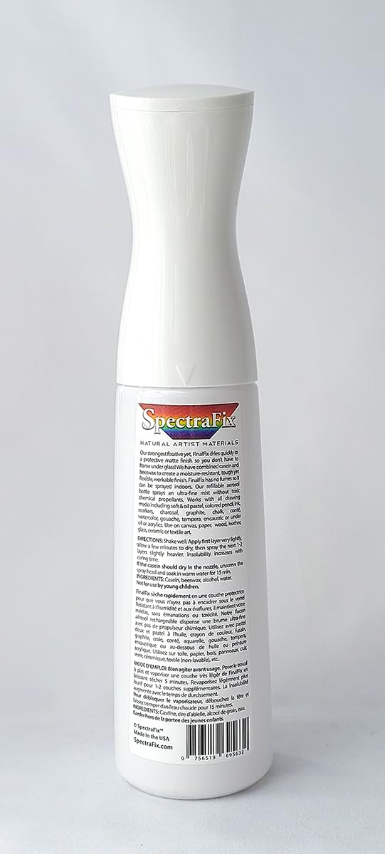 No more framing under glass! FinalFix is a casein-based spray fixative which contains beeswax and a few other natural ingredients to help the casein harden to a tough, moisture resistant finish. It is very similar to the Degas fixative, but provides a slightly deeper, semi-matte finish, and allows for damp cleaning and durable scuff-resistance. FinalFix contains beeswax and provides a slightly slicker surface than our Degas fixative, so if you desire plenty of traction to layer deeply, the Degas may be your best choice. Perfect for a final protective layer, or to be used throughout your project. Non-yellowing formula is all-natural with no fumes and is workable and archival. Combines well with all drawing (not oil pastel) and painting media and may be used after SpectraFix Degas fixative, or by itself. Works beautifully to bring out depth in gouache paintings, and to finish mixed media works, or try brushing on our Natural Glass Varnish and Medium. Please be aware that the non-drying mineral oils in oil pastels do not combine well with beeswax, and we suggest the Degas fixative for oil pastels, which works beautifully. FinalFix should not be used as a final layer on top of acrylic or oil paintings, unless sealed with a final layer of acrylic or oil varnish. This is because it absorbs atmospheric moisture and acrylics and oils do not, and as a result it is possible that it may eventually delaminate from their surfaces.