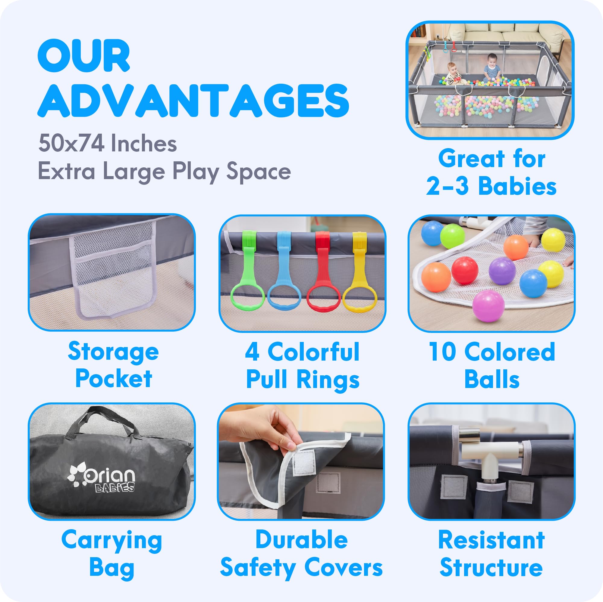 [EXTRA LARGE Baby Play Pen] – Watch your toddlers step into a world of fun with Orian Baby Playpen! It is Extra spacious and roomy 50"x74"x27" design. The baby play area is perfect for two toddlers to play comfortably side by side – the BEST baby playpen playard for tiny toddlers to explore, giggle, and create endless memories!