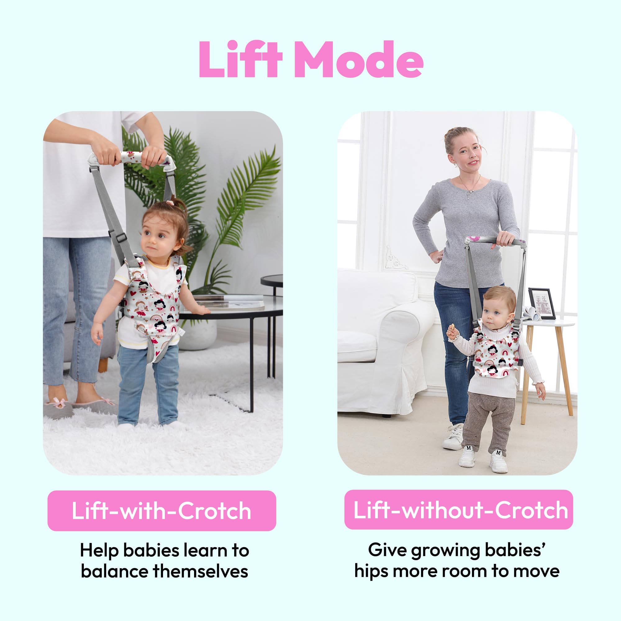 Multi-Functional Design: This walking assistant is specifically designed to provide more control, not just for you, but for your baby. With its 4-in-1 multifunctional style, you can adjust the walker according to the needs of your baby’s age. Its functions are as follows: Lift-with-Crotch for Start-to-Stand, Lift-without-Crotch for Ready-to-Walk, Pull-with-Crotch for Walk-with-Stumble, Pull-without-Crotch for Self-Walking.