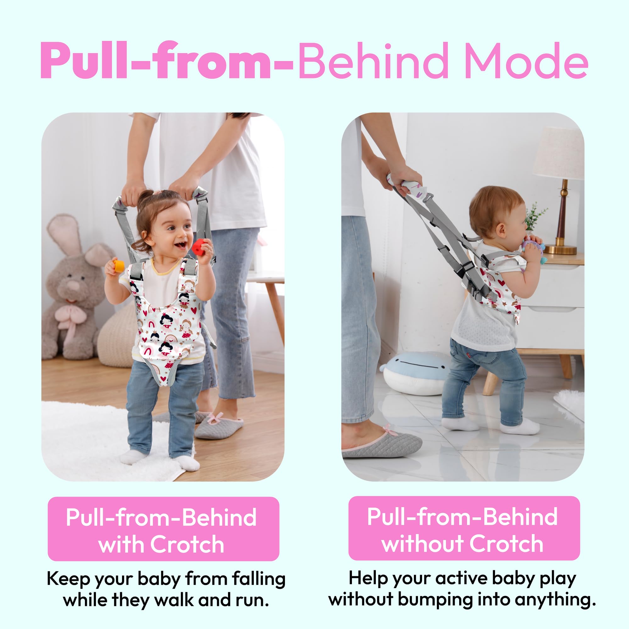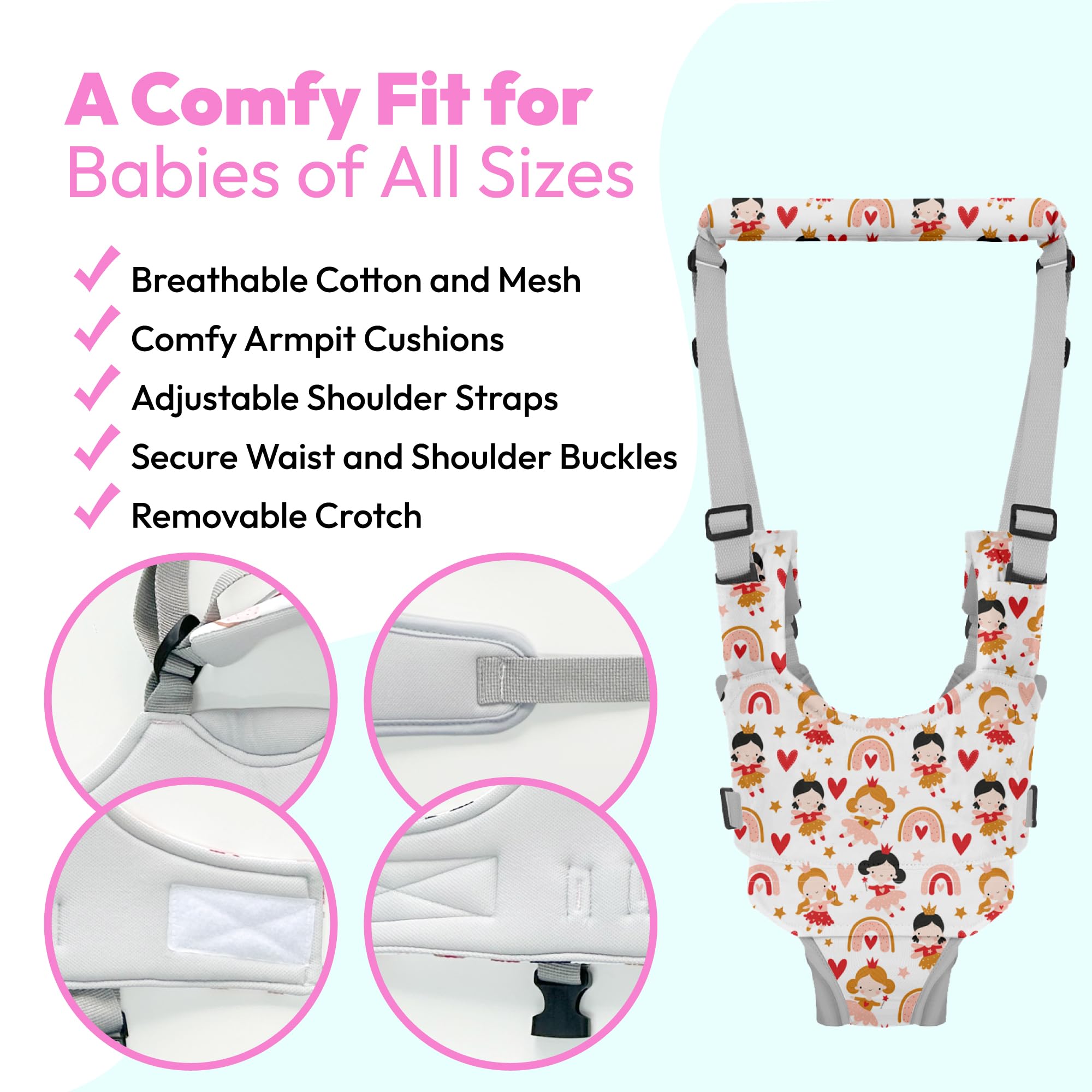 High-Quality Material: Made with 100% cotton, inner 100% polyester, filler 100% polyester, this safety handheld walker assures not just the safety of your baby while learning to walk, but also assures that the baby is comfortable and the material can ventilate air. It is made with strong and durable material- no tears or breaks from continuous walking practice.