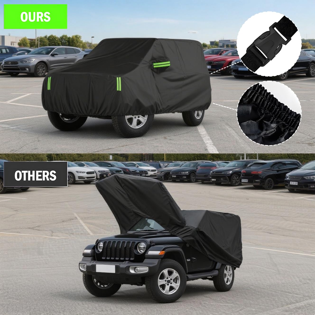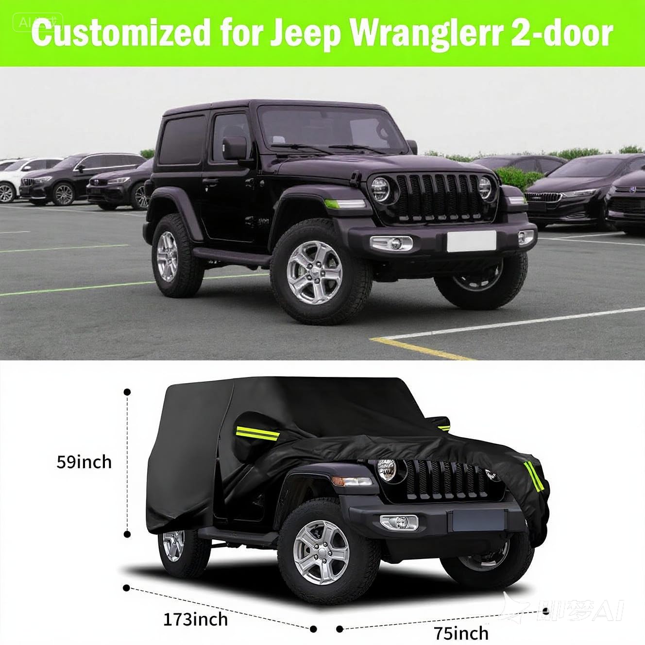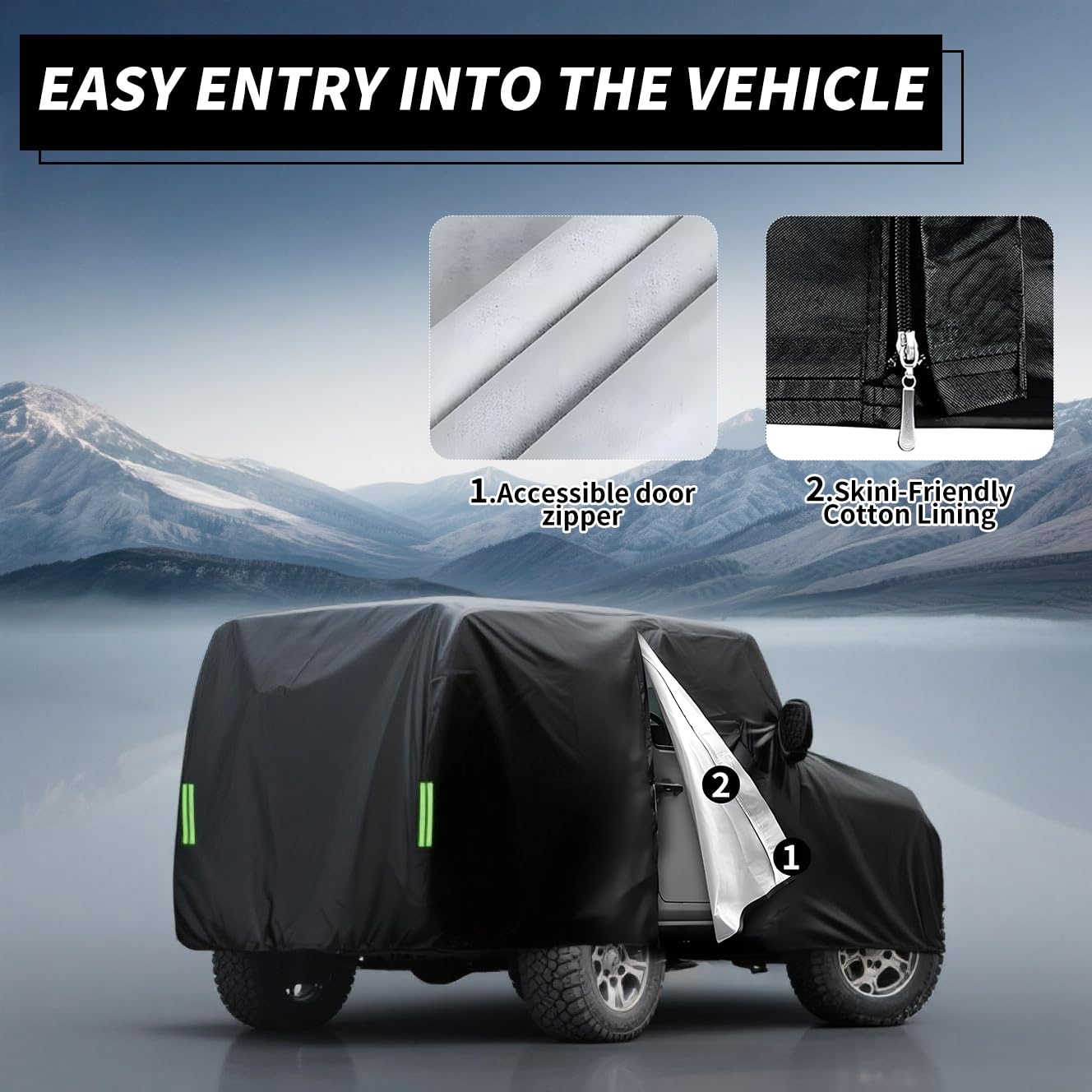 APPLICABLE MODELS: Cover size 490x190x150cm / 193"x74.8"x59"(L*W*H). SUV car cover for Jeep Wrangler 4 door JK JL, 2006-2025