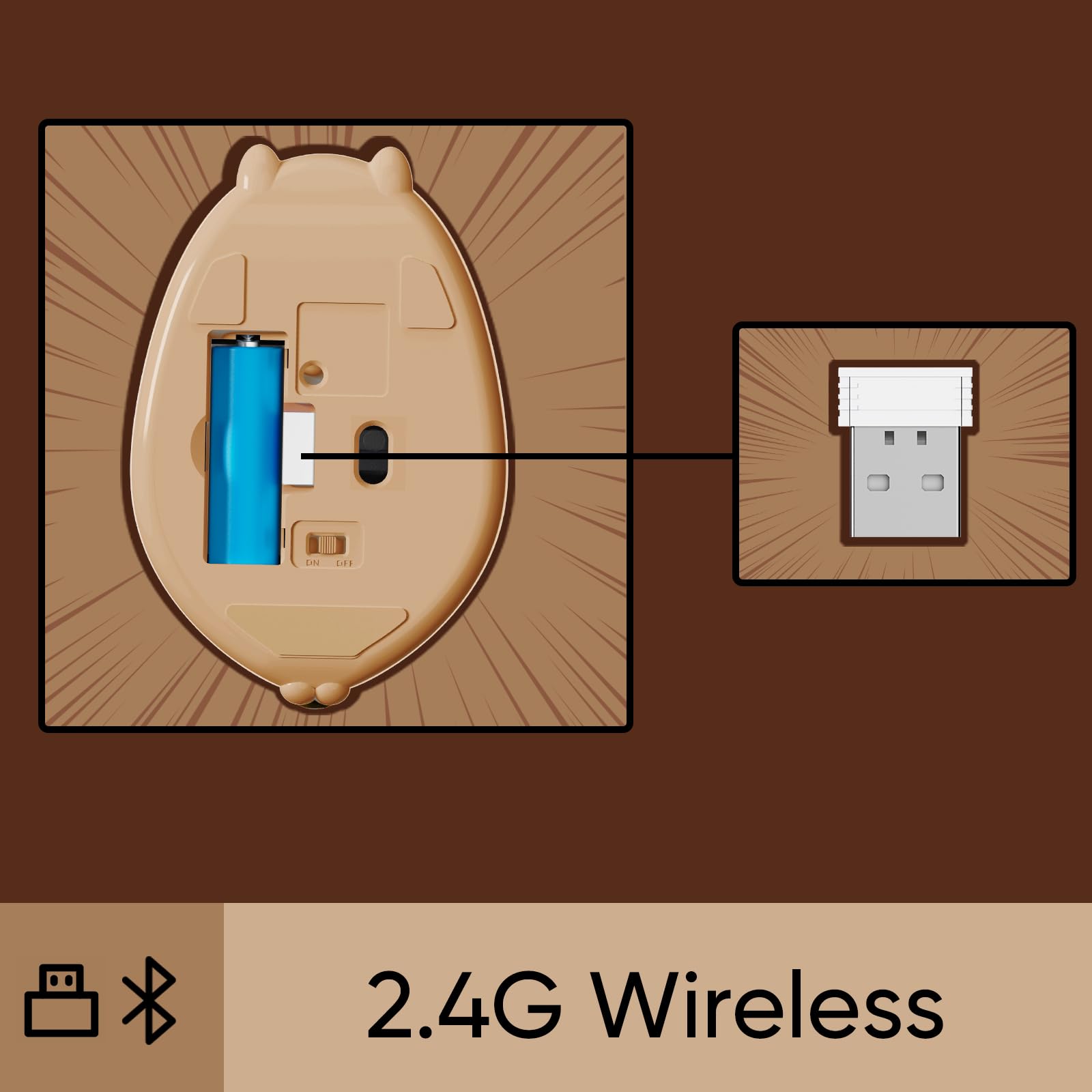 Plug and Play: The wireless mouse comes with a 2.4G receiver stored in the mouse. Install the battery, insert the receiver into the USB port of the device, turn on the switch, and enjoy immediate responsiveness without any additional setup steps. Or liberate your laptop ports entirely with seamless BT connectivity