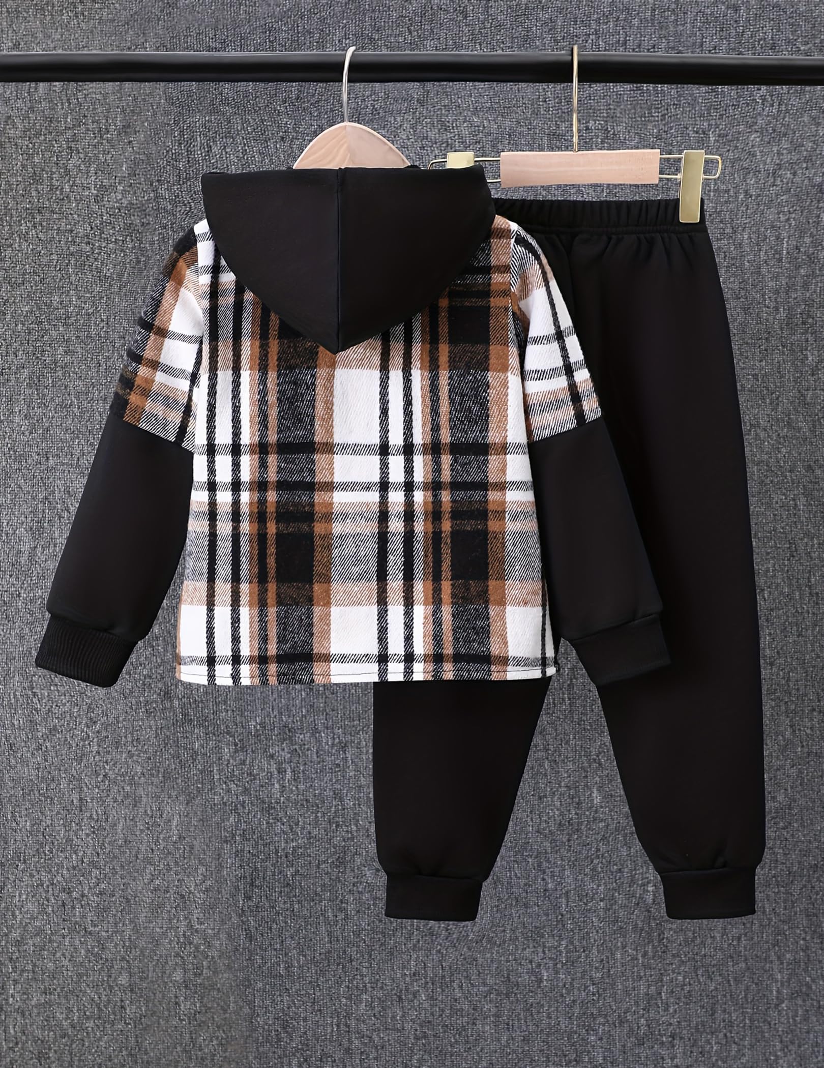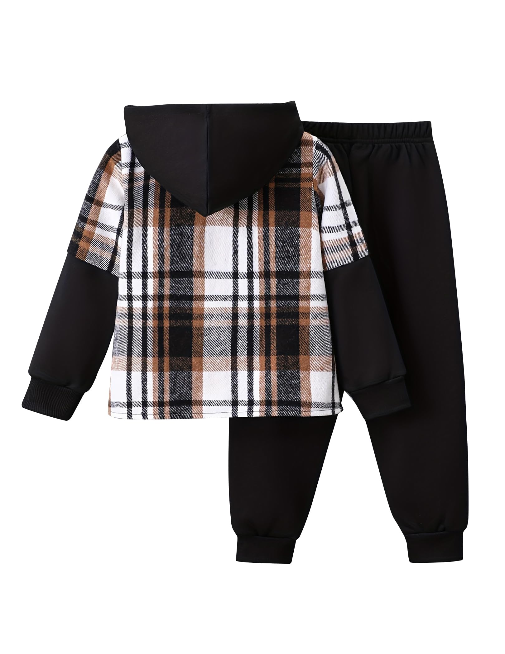 Package: 1 x kids' boy flannel plaid hooded sweatshirt + 1 x long Sweatpants.