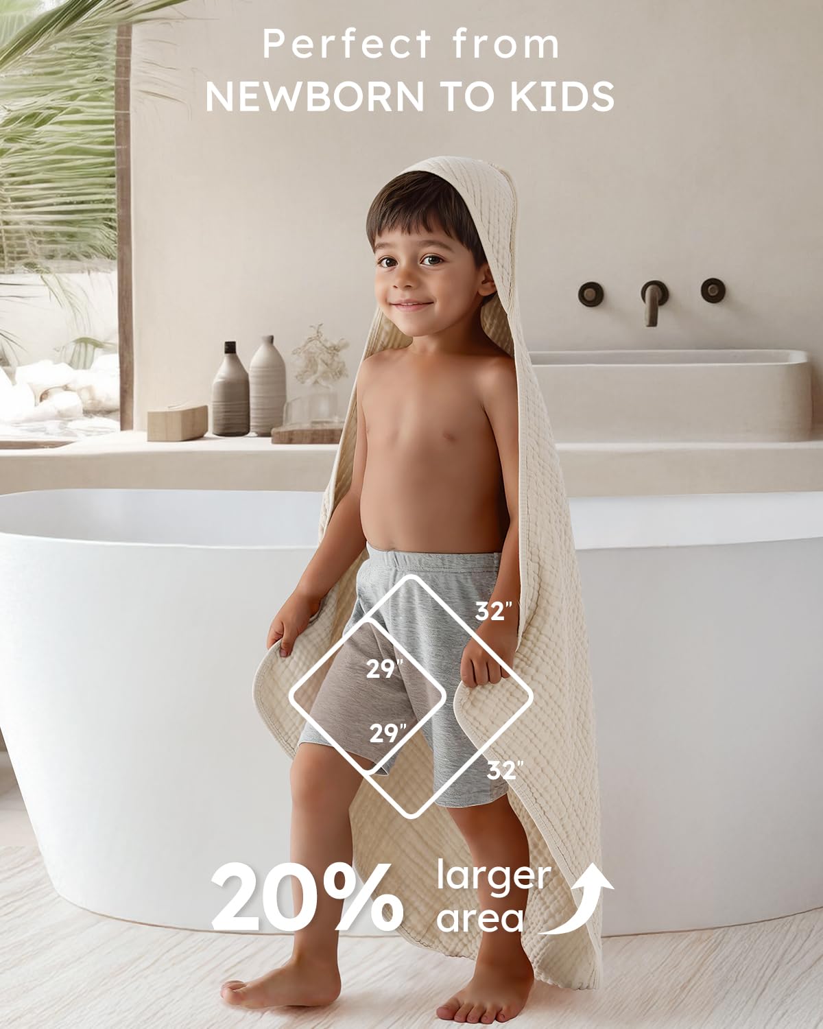 [Excellent Durability] - The 6 layers thickness muslin design is long-lasting enough for everyday use. Sized in 32 x 32 inches, the hooded baby towels are suitable for newborns, infants, toddlers, and small kids up to 3 years old.