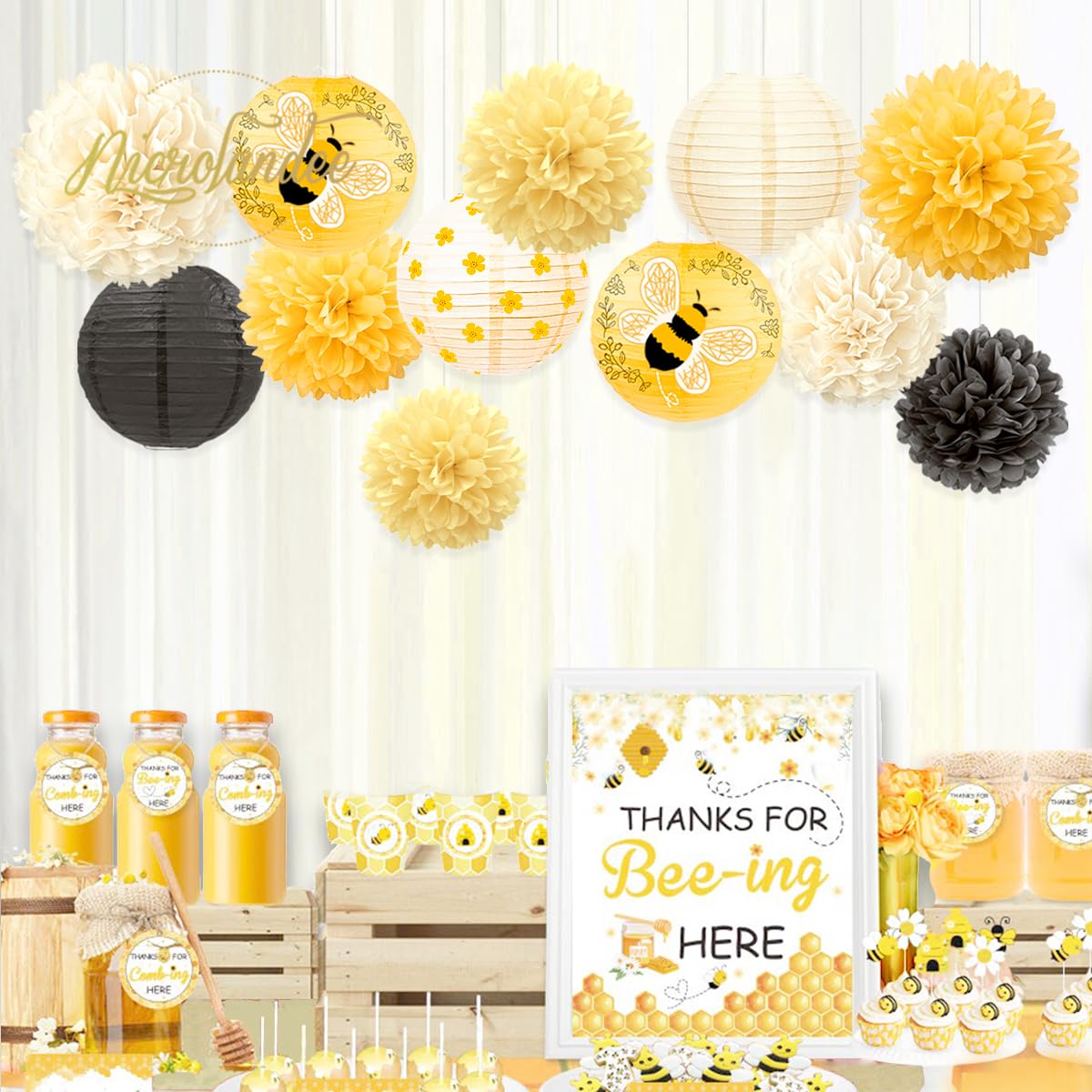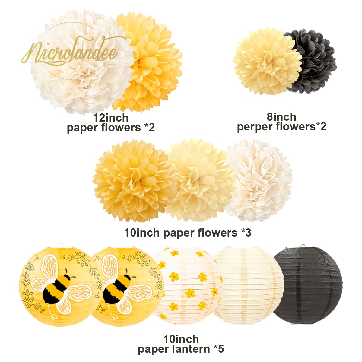Package Included: 5 PCS tissue paper pom poms and 7 PCS paper lanterns. Adorable 12 PCS bee paper decorations kit for bee themed baby shower party