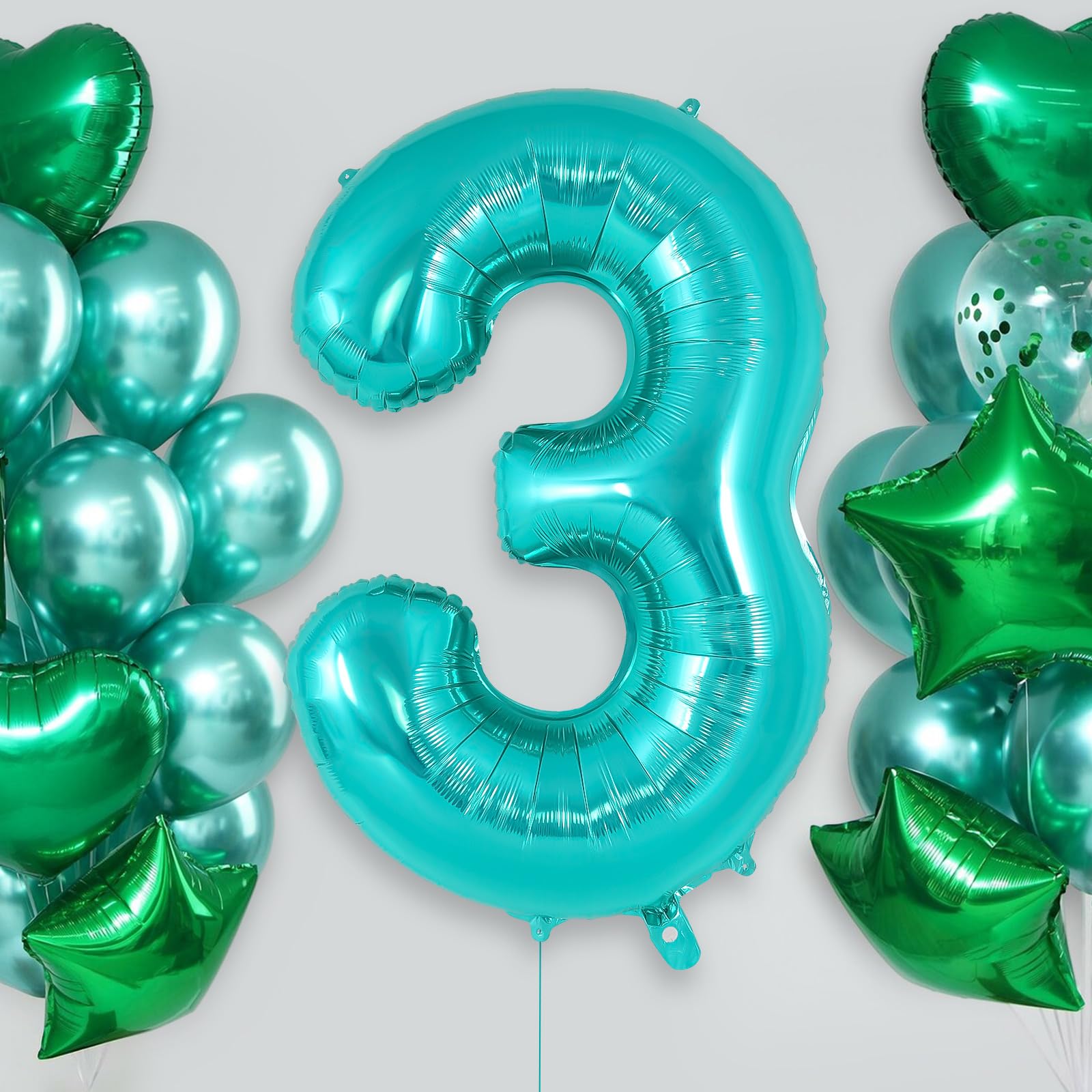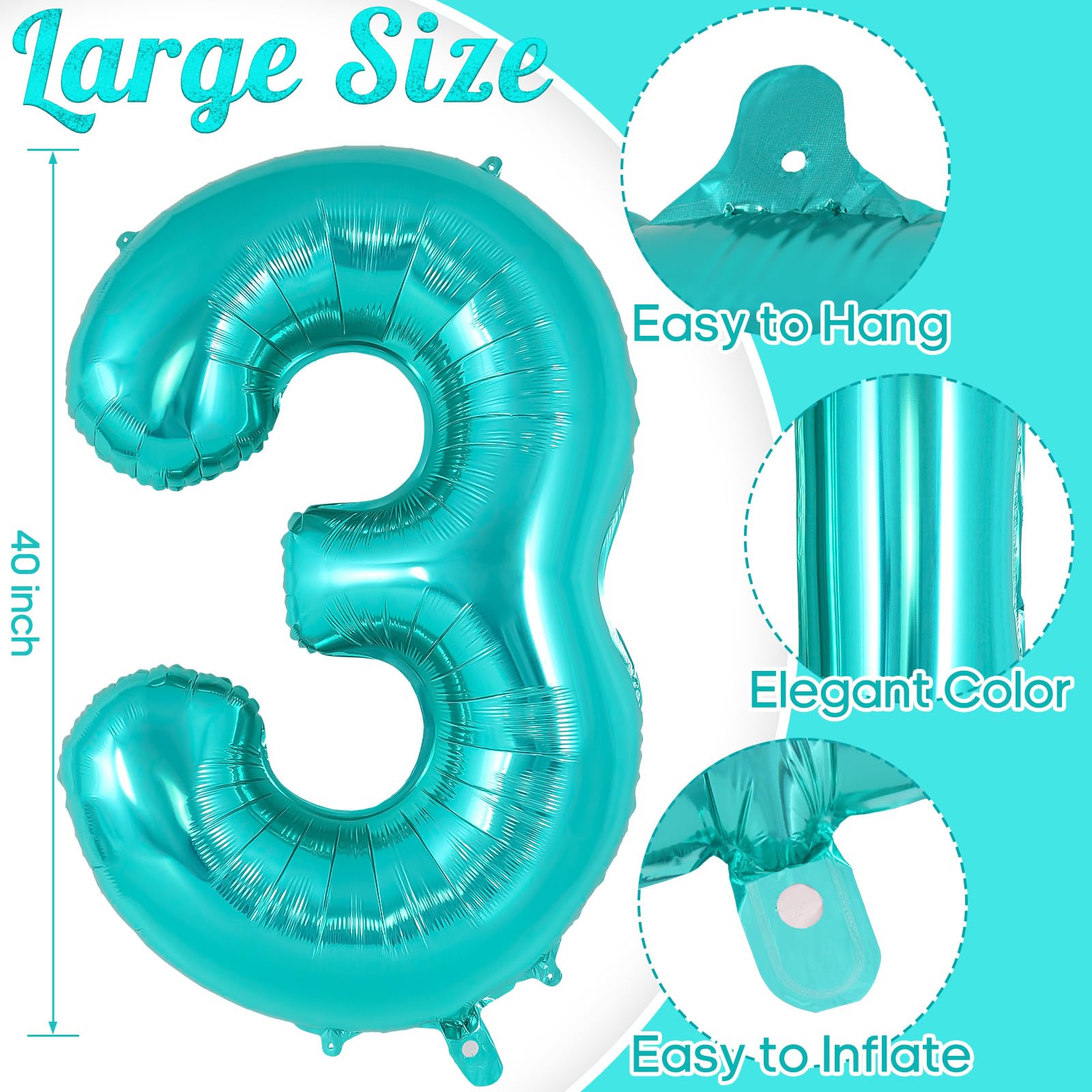 PACKAGE CONTAINS: 1 piece of teal number 3 balloon, measures around 40 inch long. The balloon has 2 loops on top and 2 on the bottom. Pretty color and giant size makes it really eye-catching.