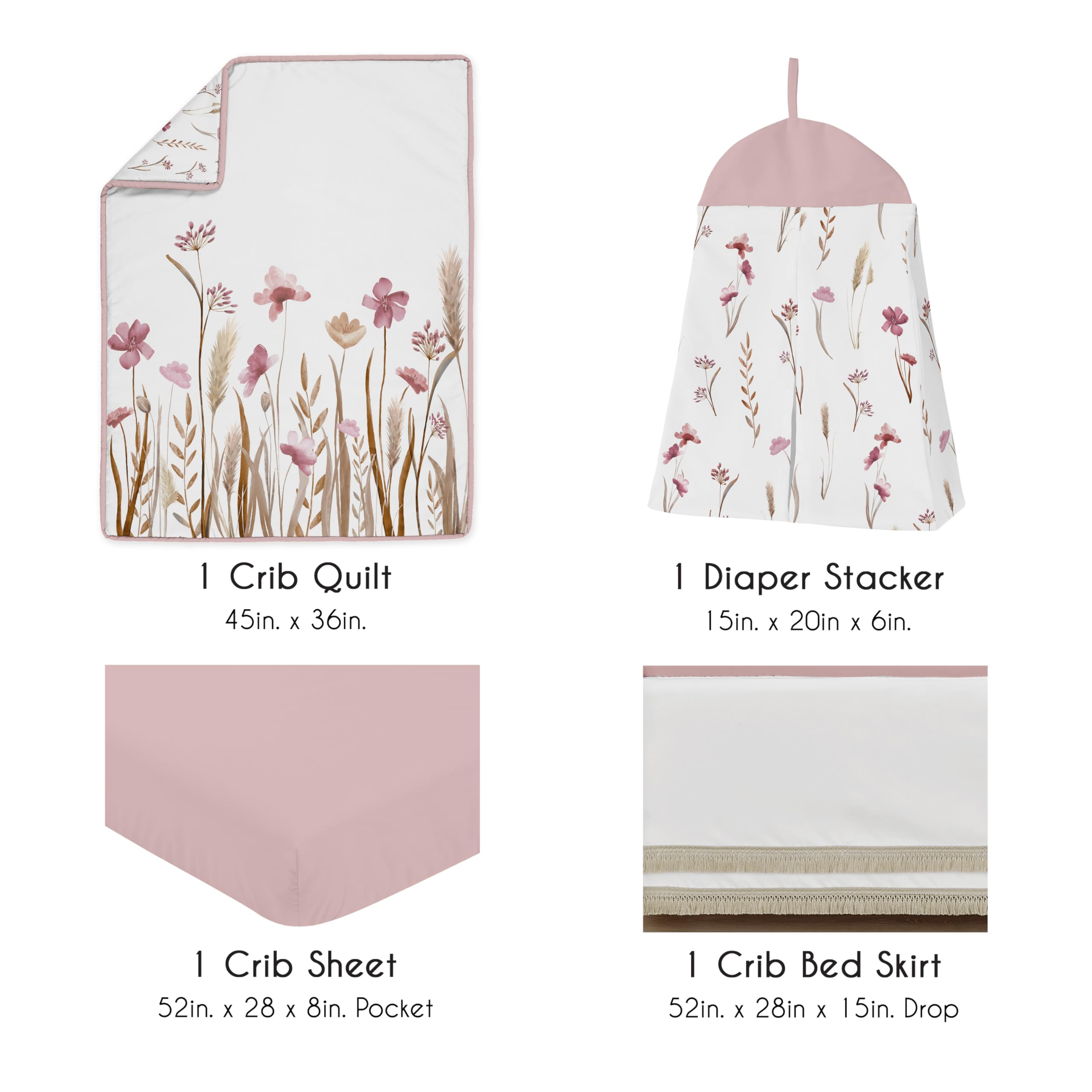 4 PIECE CRIB BEDDING SET INCLUDES: Crib Comforter (45in. x 36in.), Fitted Crib Sheet (52in. x 28in. x 8in. Pocket), Crib Skirt (52in. x 28in. x 15in. Drop) and Diaper stacker (15in. x 20in. x 6in.). An infant crib set including all the baby essentials is a great value compared to purchasing pieces separately. This baby crib set is made of soft microfiber fabric and features the earthy color palette of blush pink rose, mauve, beige wheat & taupe to bring your shabby boho chic baby room together.