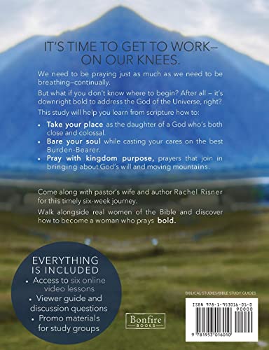 It's time to get to work. On our knees. We need to be praying just as much as we need to be breathing—continually. But what if you don’t know where to begin? After all—it’s downright bold to address the God of the Universe, right? In this study, learn from scripture how to: Take your place as the daughter of a God who’s both close and colossal. Bare your soul while casting your cares on the best Burden-Bearer. Pray with kingdom purpose, prayers that join in bringing about God’s will. Come along with pastor’s wife and author Rachel Risner for this timely six-week journey. Walk alongside real women of the Bible through their overwhelming obstacles and overcoming prayers, and discover how to become a woman who prays bold. What women are saying about Rachel's studies: "My favorite Bible study by far...The study was actually enjoyable to do!" ~Monika P. "One of our favorite studies we have done so far.... Thank you Rachel for this amazing study. We can't wait for your new one!!!" ~Leilani H. "EXCELLENT study! Can't wait for her to write another!!" "I am enjoying this study - it is the best!" ~Irene S. "I am LOVING this study!" ~Megan S. Includes: Online video lessons to stream - no separate Leader Kit needed! Promotional materials for Bible study group use. Discussion questions and viewer guides. Rachel is recommended by author and speaker Melissa Spoelstra: "I see in Rachel a soul ignited to write and teach the Bible with a heart to serve women." From the author: In this study we’ll learn to pray boldly with kingdom purpose, prayers that move our hearts, grow our faith, and shape our lives. Prayers that God uses to bring about His will. Because just like Hannah and Miriam, just like Deborah and Mary, we’re praying to the God who sees us and knows us by name, the God who shakes heaven and earth to give us the impossible victory, the God who provides for our every need—friends, it’s time to pray bold. because of Jesus, Rachel