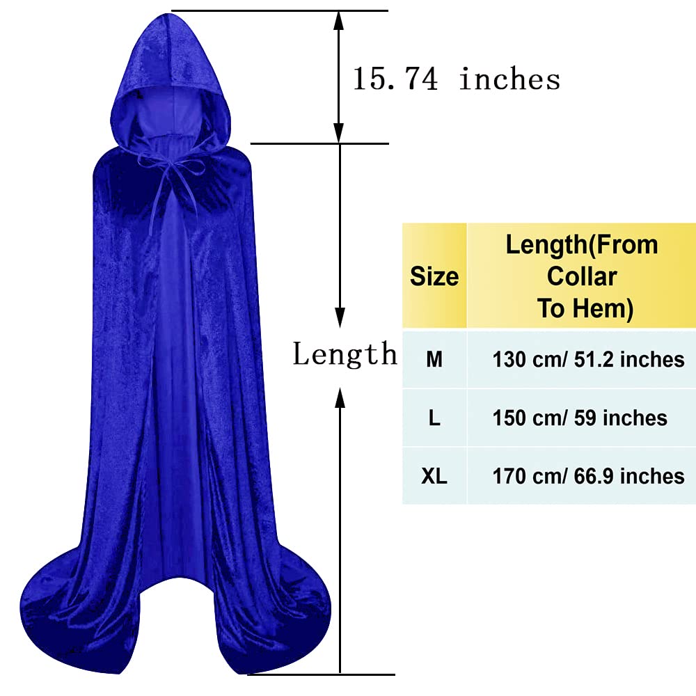 Description Tips: Please carefully check the size chart below before placing your order and choose the size that suits you. If you are unsure of the size, you can email us your height, we can help you choose the right size. In addition, all the clothes are measured by hand flat, please allow 1-2cm error, thank you for your understanding! Specifications: Size XL: Length 170cm /66.9 inches, fit For height 74.9-82.7inch / 190-210cm Size L: Length 150cm /59 inches, fit for height 66.9-74.9inch / 170-190cm Size M: Length 130cm /51.2 inches, fit for height 59.1-66.9inch / 150-170cm Package Included: 1 x Unisex Full Length Hooded Robe Cloak Long Velvet Cape Cosplay Costume