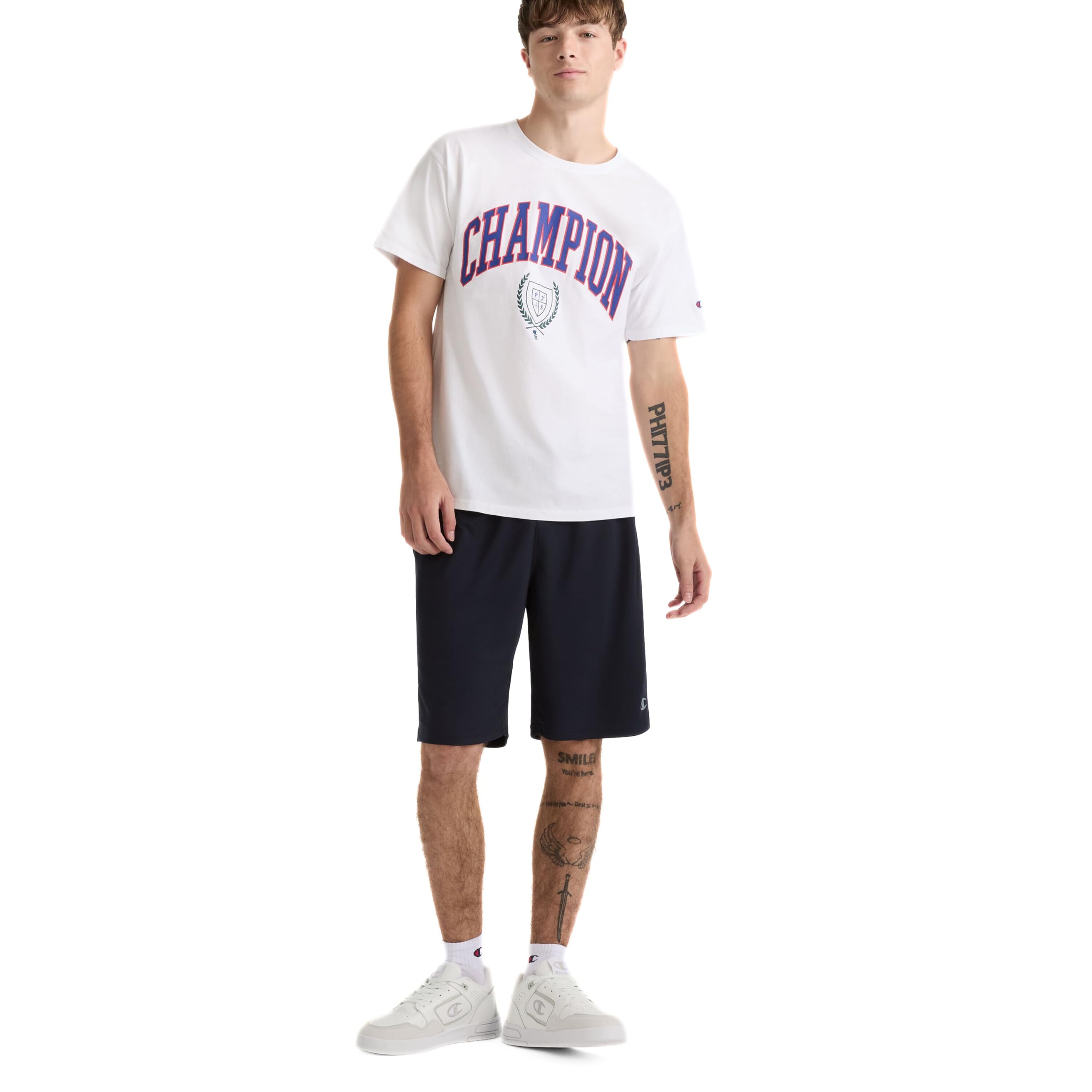 Description Our Champion heritage tee, available in solids and prints, is heavyweight 7 ounce. Jersey fabric. Champion graphics are truly inspired by our archives and our long history of athletic wear. Champion - a step above.