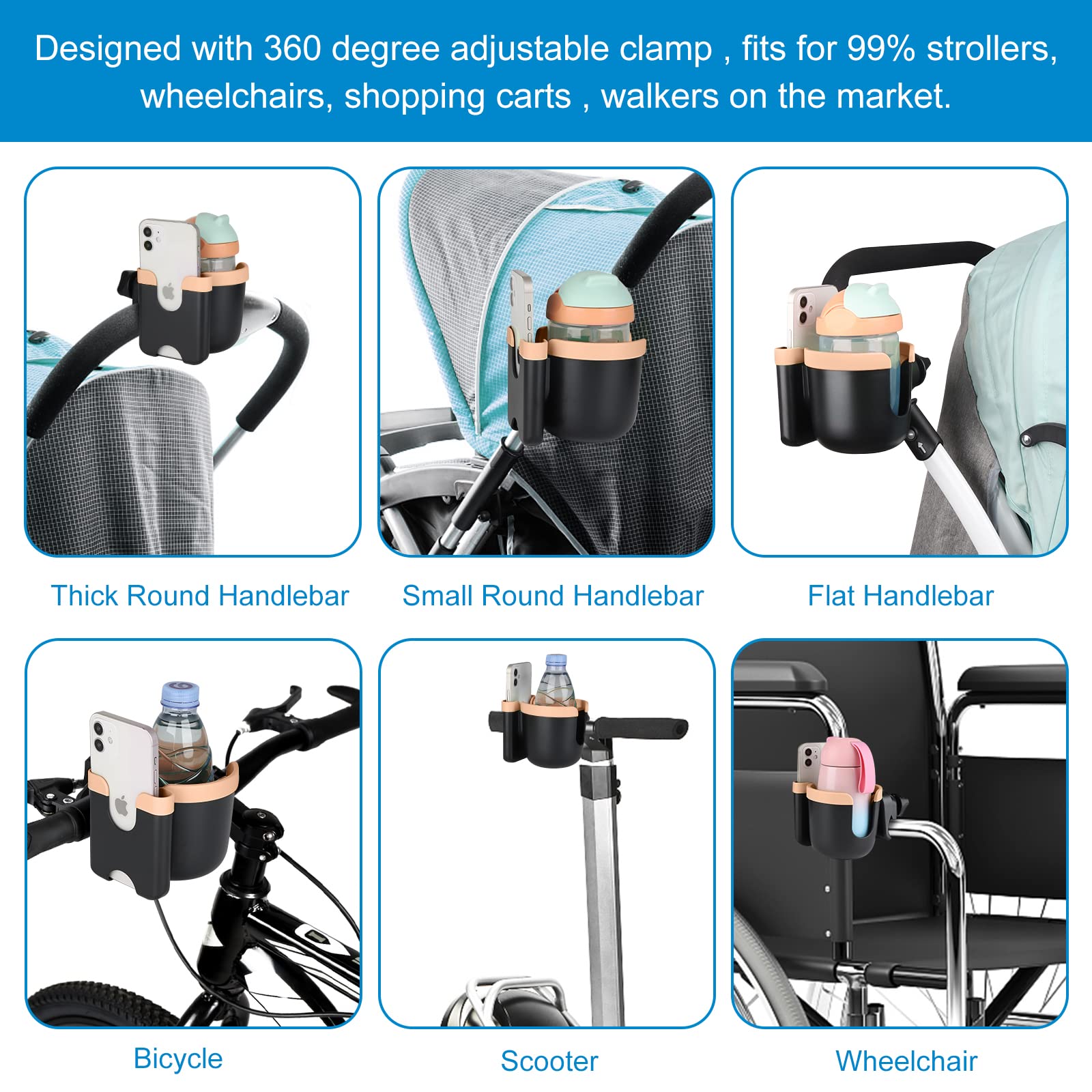 Wide Compatibility: This universal cup holder with phone holder compatible with most baby strollers, walker, wheelchair, rollator, bike, scooter, boat handle bar, shopping cart, kayak, ATV, lawnmowers, motorcycle, treadmill, golf push cart and so on.