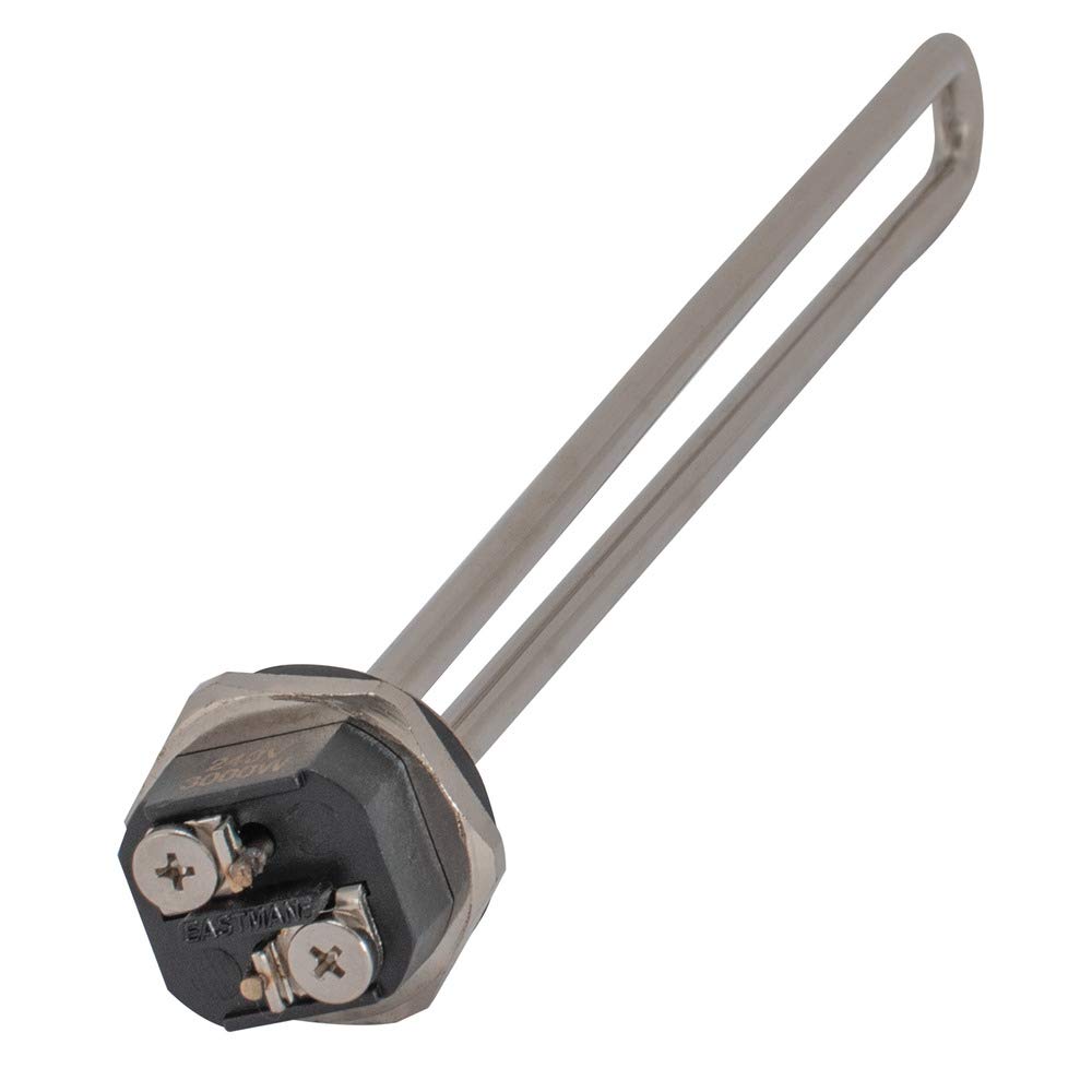 The Eastman Straight Water Heater Element has a high watt density and has a wattage and voltage of 240V x 3000W and has an 9-inch minimum tank diameter. It features a screw mount with gasket and is coated with a copper sheath which helps in resisting corrosion. It has a straight element design. The water heater element is designed for use in all replacement situations if the same wattage and voltage are used. This element is the most commonly used in most water heaters. Do not exceed the rating listed on the water heater.