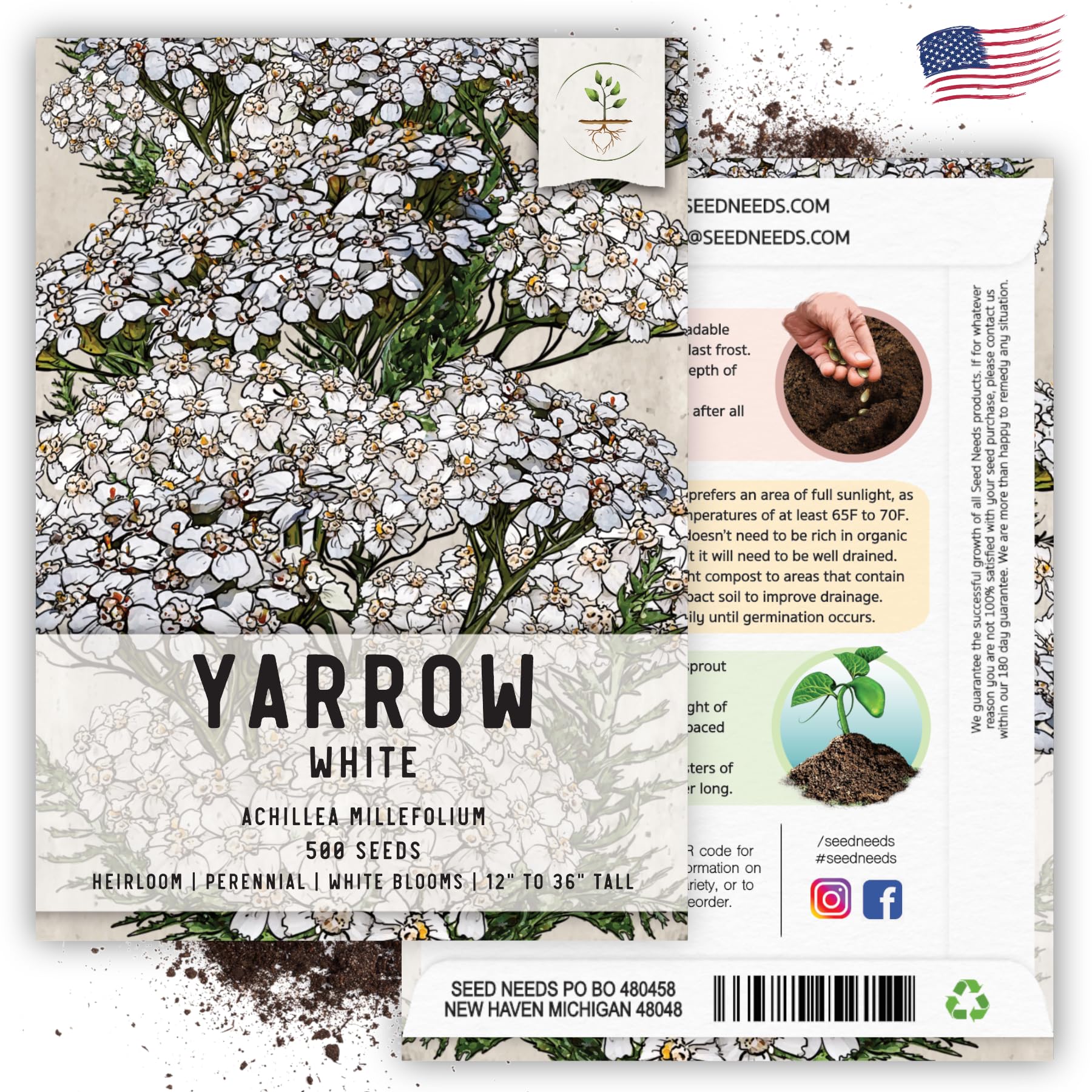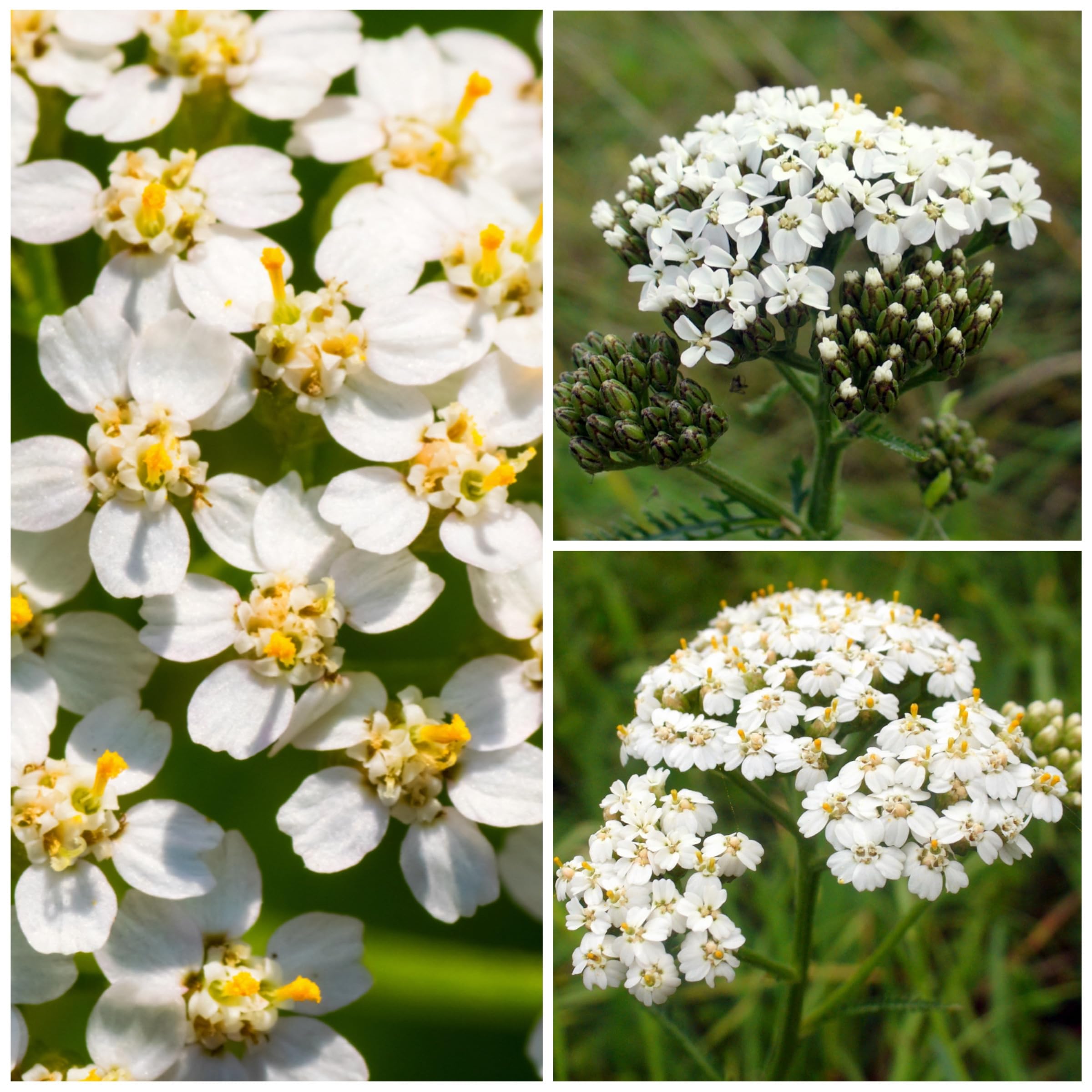 Botanical Characteristics: White yarrow, scientifically known as Achillea millefolium, features clusters of small, white flowers atop fern-like, aromatic foliage. Each flower head is actually composed of numerous tiny florets, forming a flat-topped corymb.