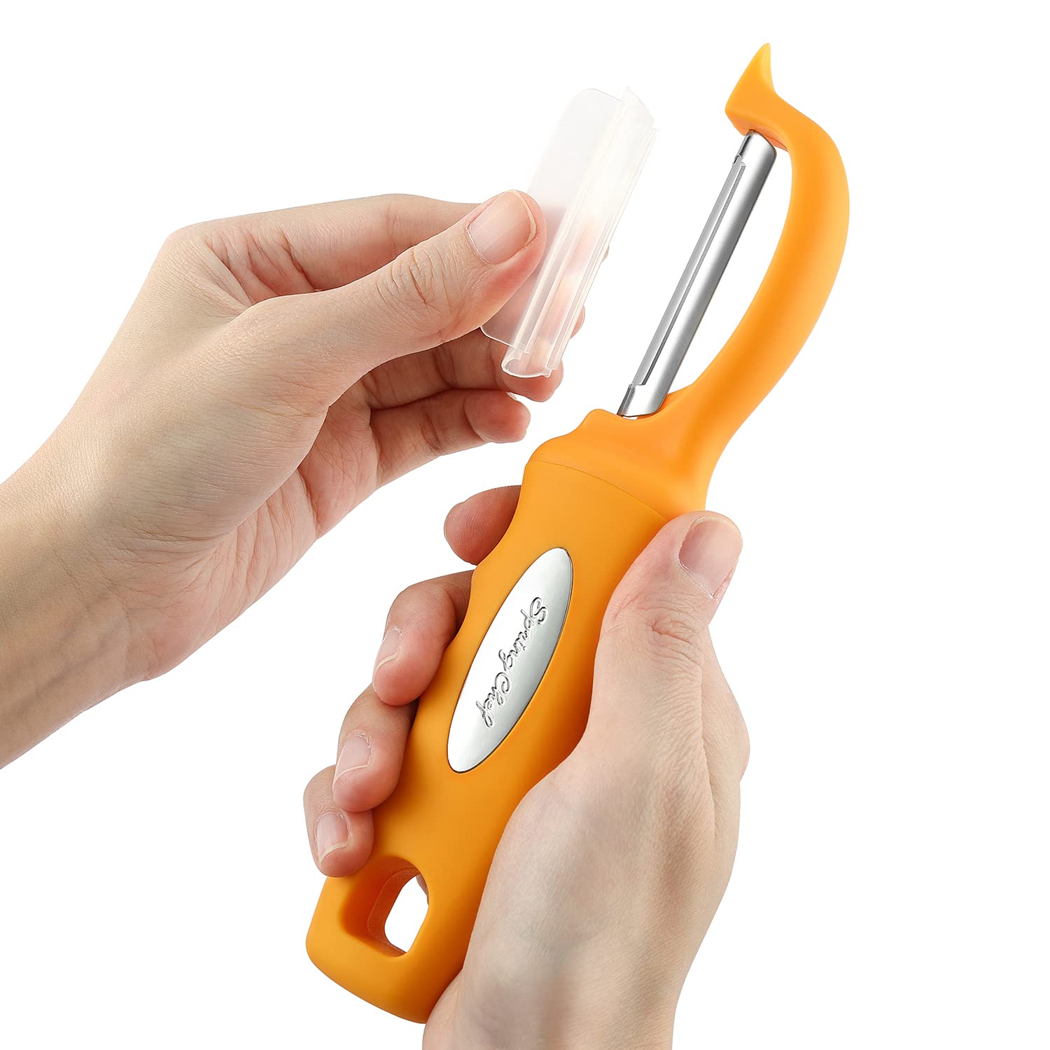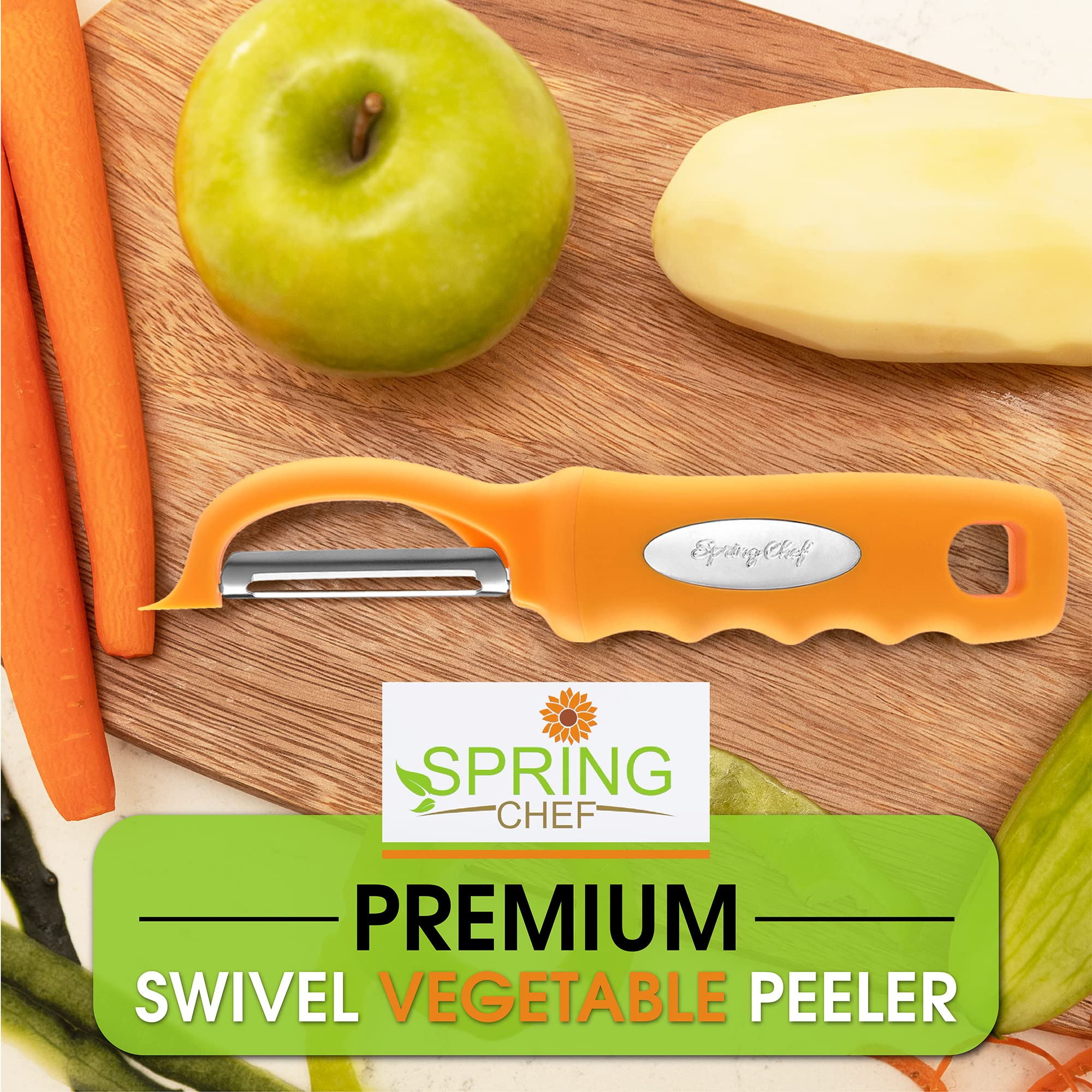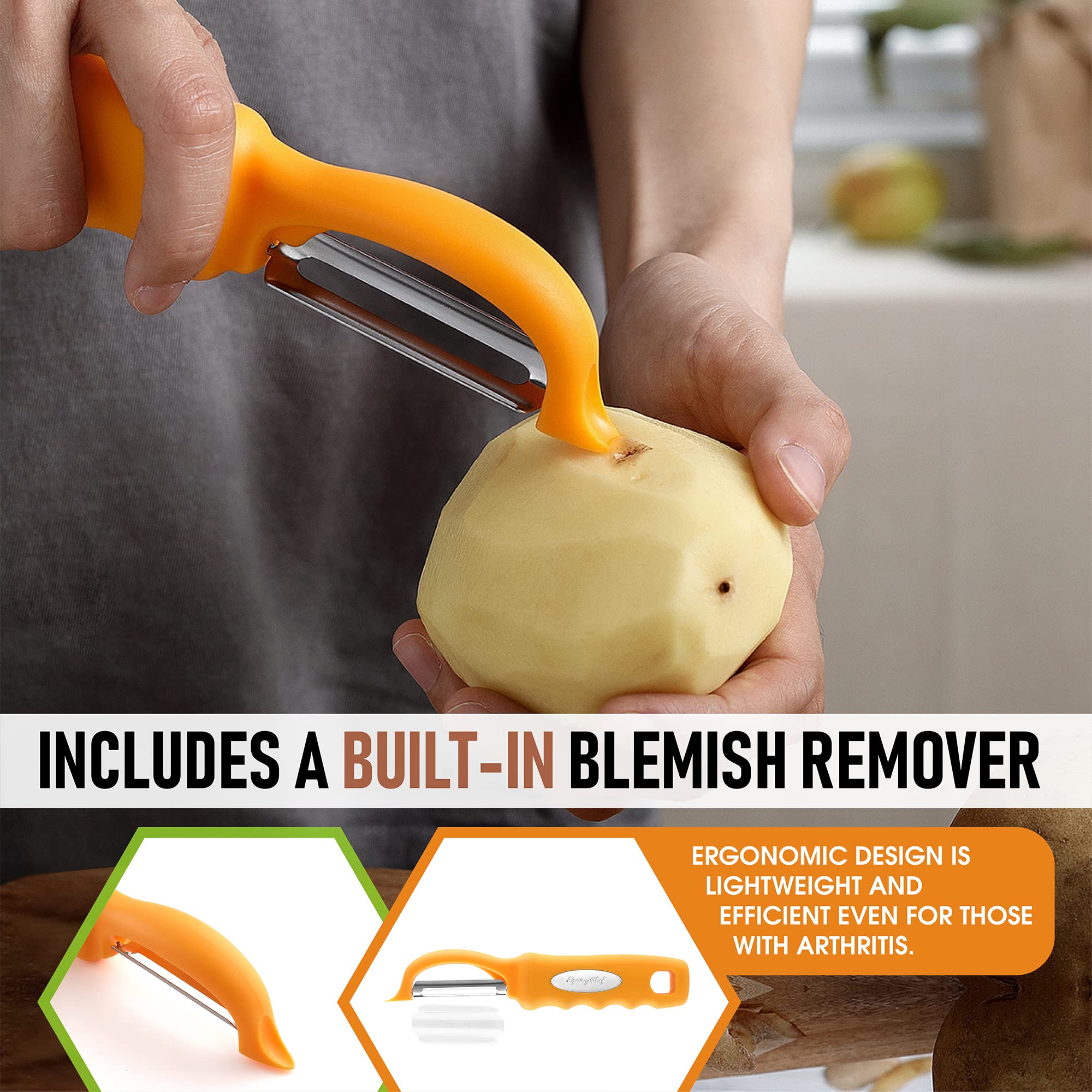 Smooth, Effortless Peeling - Dual Stainless Steel blades stay ultra sharp and swivel to glide along fruits and vegetables easily. Includes a built-in blemish remover.