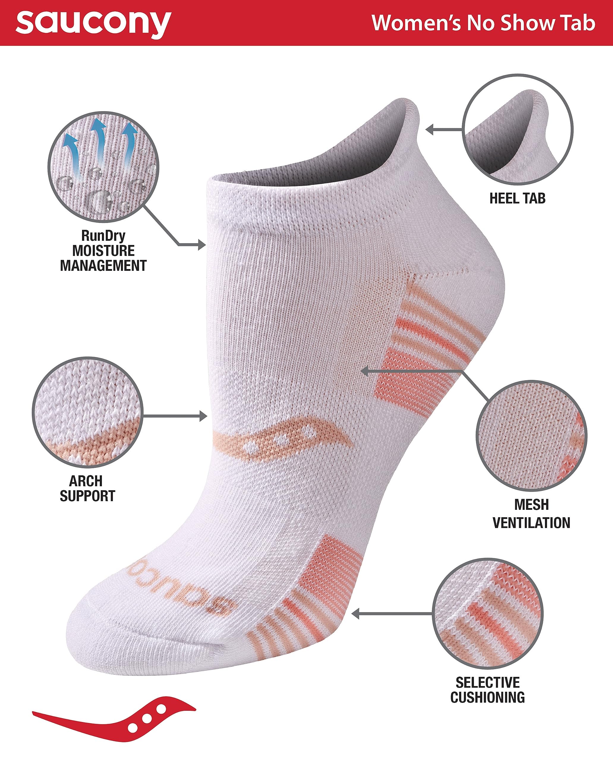 Description Saucony Women's Performance Heel Tab Athletic socks are a perfect combination of comfort and support. Great for the toughest training sessions. Features include heel tab design for added protection and comfort, RunDry moisture management to keep feet dry, arch support for an improved and secure fit, Mesh ventilation that enhances breathability and comfort, targeted zone cushioning in high impact areas for added comfort, and comfort toe seam for reduced irration.
