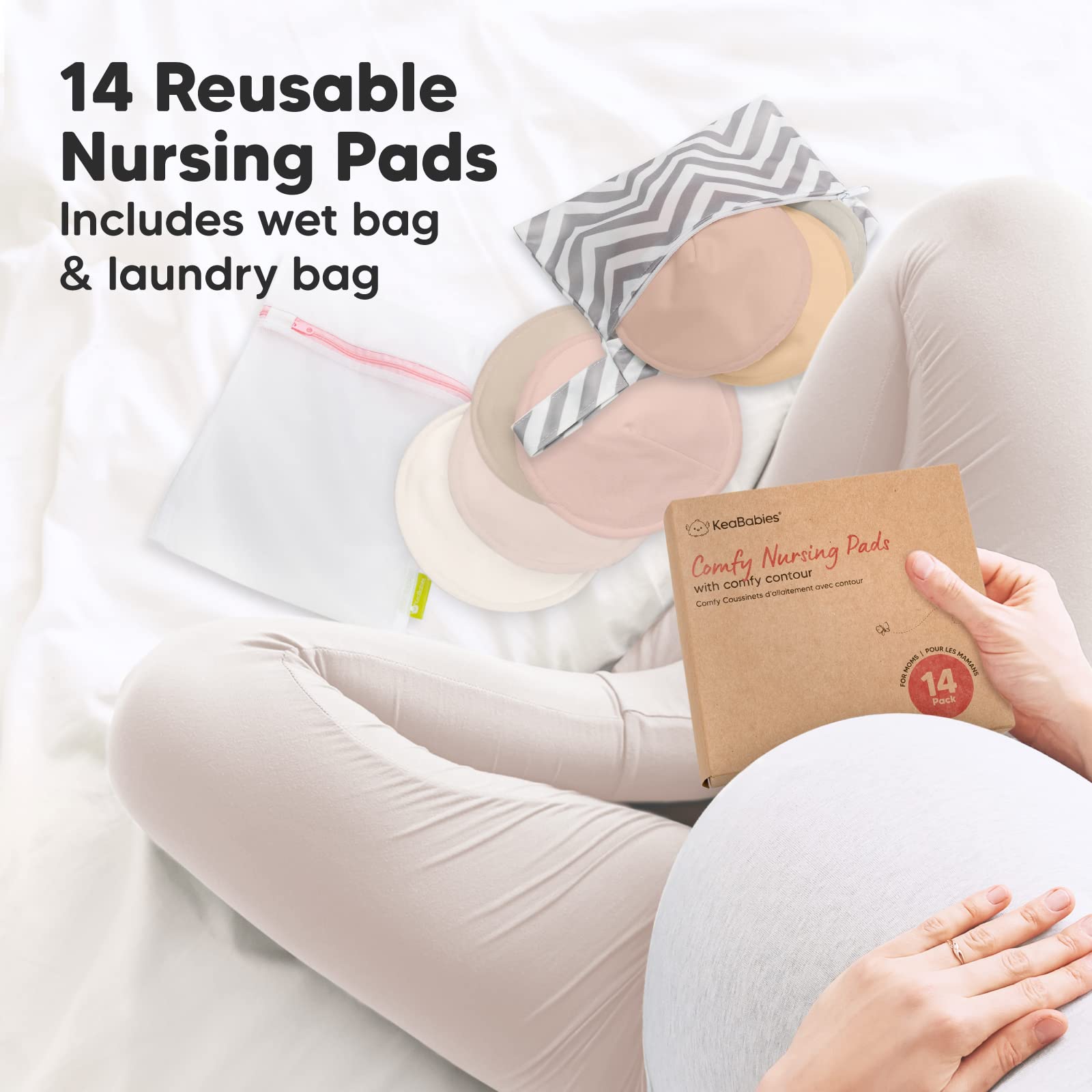 14 Highly Absorbent Nursing Pads + laundry bag + wet bag. Your week’s supply of nursing pads that offer optimum protection and a simplified washing experience. No more worries about missing breast pads!