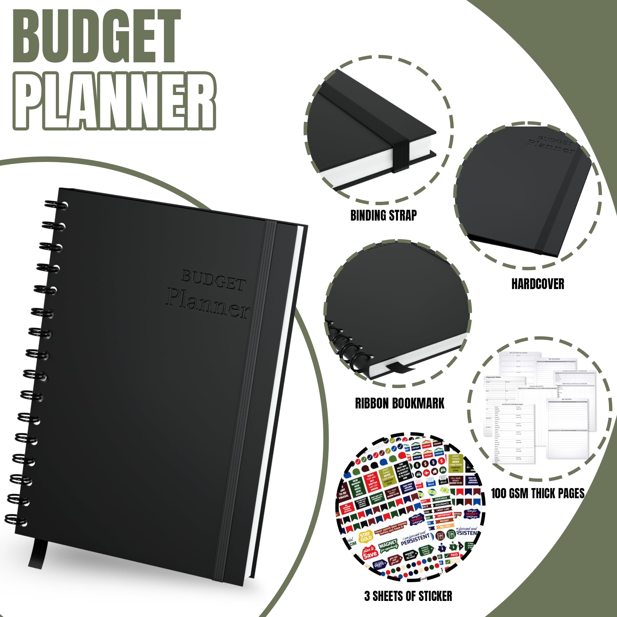 A5 Hardcover Budget Journal With Premium Features – Includes elastic band, ribbon bookmark, 3 sticker sheets, and durable 100gsm paper. This weekly and monthly budget planner is ideal for planning at home, work, or on the go.