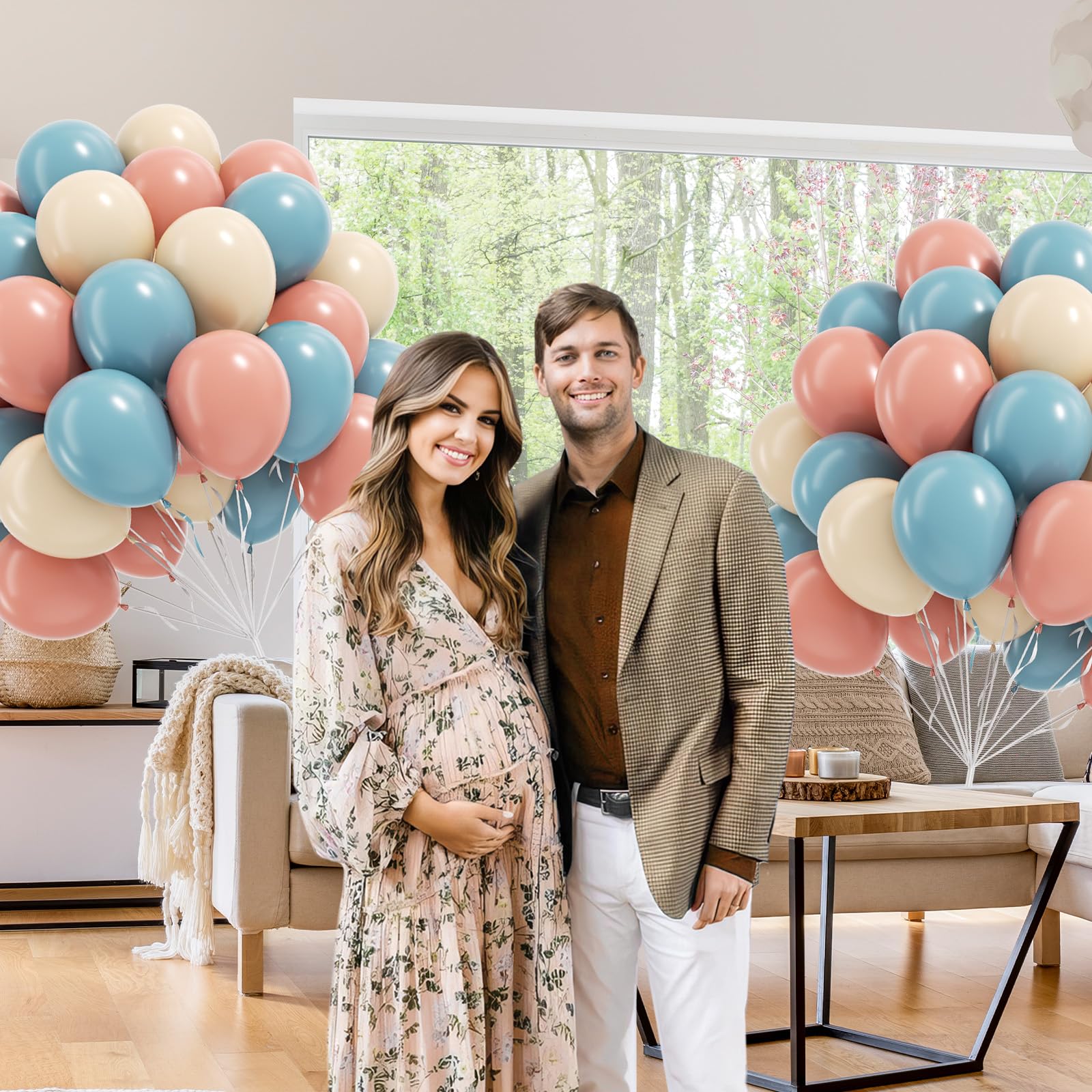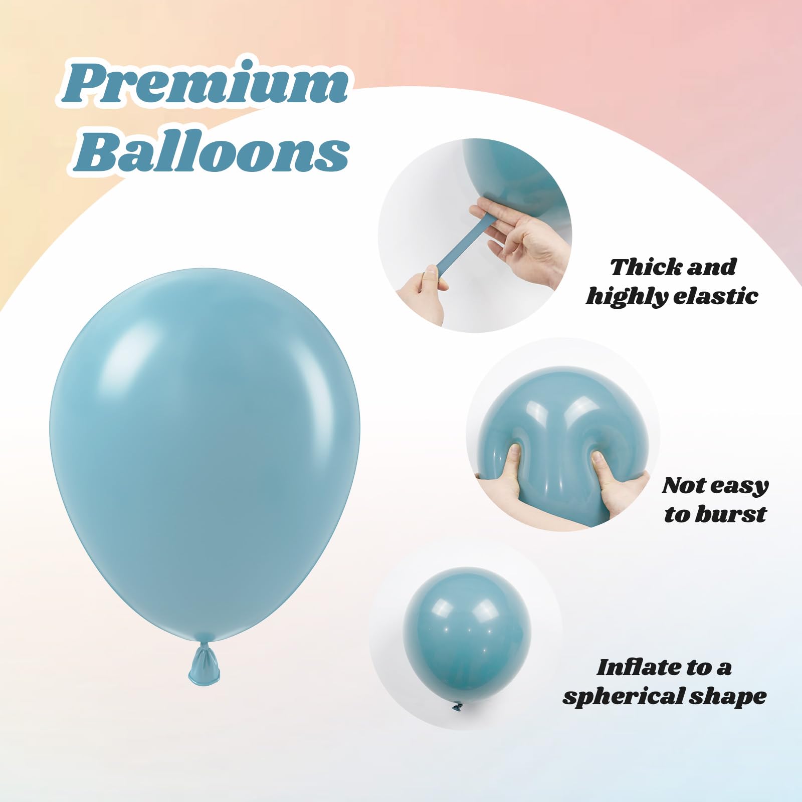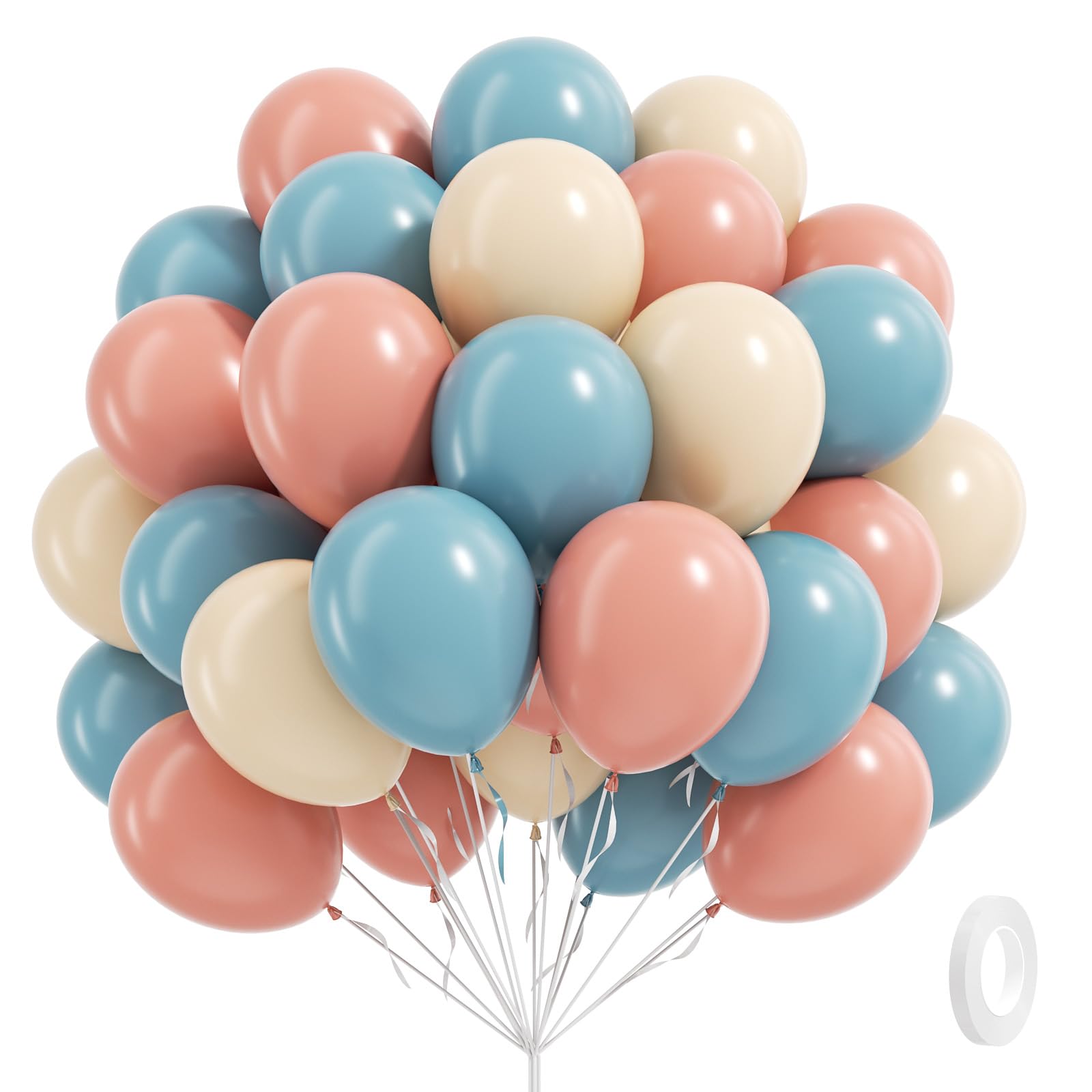 Package Include: The pink and blue balloons include 12inch dusty pink balloonsx20, 12inch dusty blue balloonsx20, 12inch sand white balloonsx20, glue dotsx20, white ribbonx1