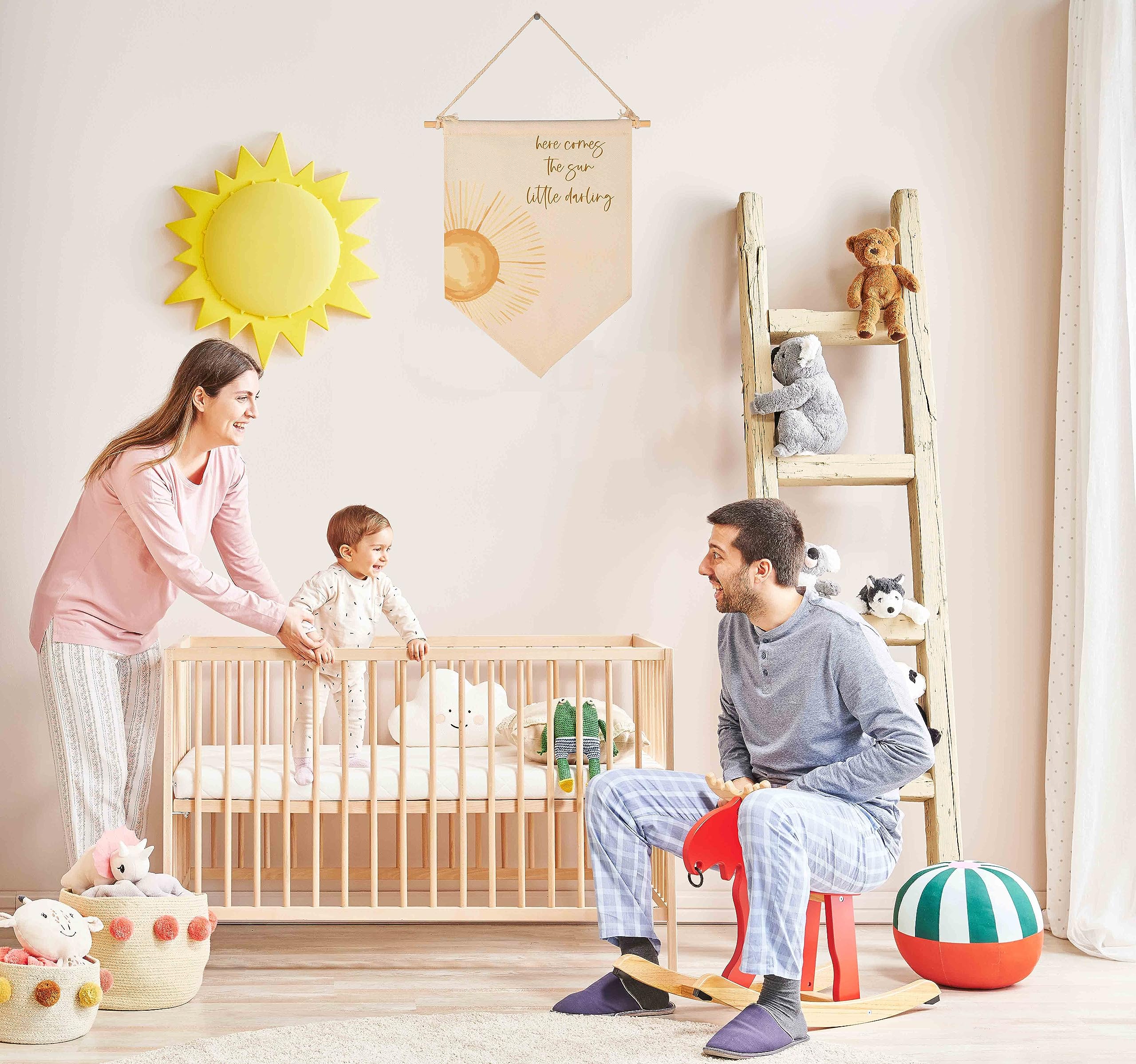 Crafted from natural cotton canvas, this 15.4 x 11 inch nursery wall banner brings a soft and calming touch to baby room, above crib or toddler space. The durable fabric keeps its shape with a natural texture, while the clear print stays bright with everyday use. Lightweight and easy to hang, it comes with a wooden dowel and pre-tied twine for quick setup on walls, doors or shelves. The versatile size fits small spaces without feeling crowded, making it perfect for creating a cozy nursery atmosphere. A thoughtful gift for baby showers, newborn arrival or first birthday.