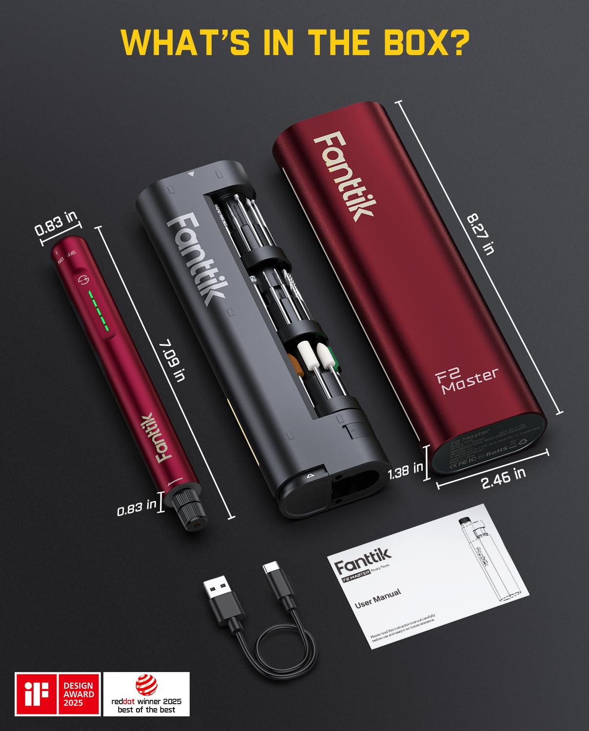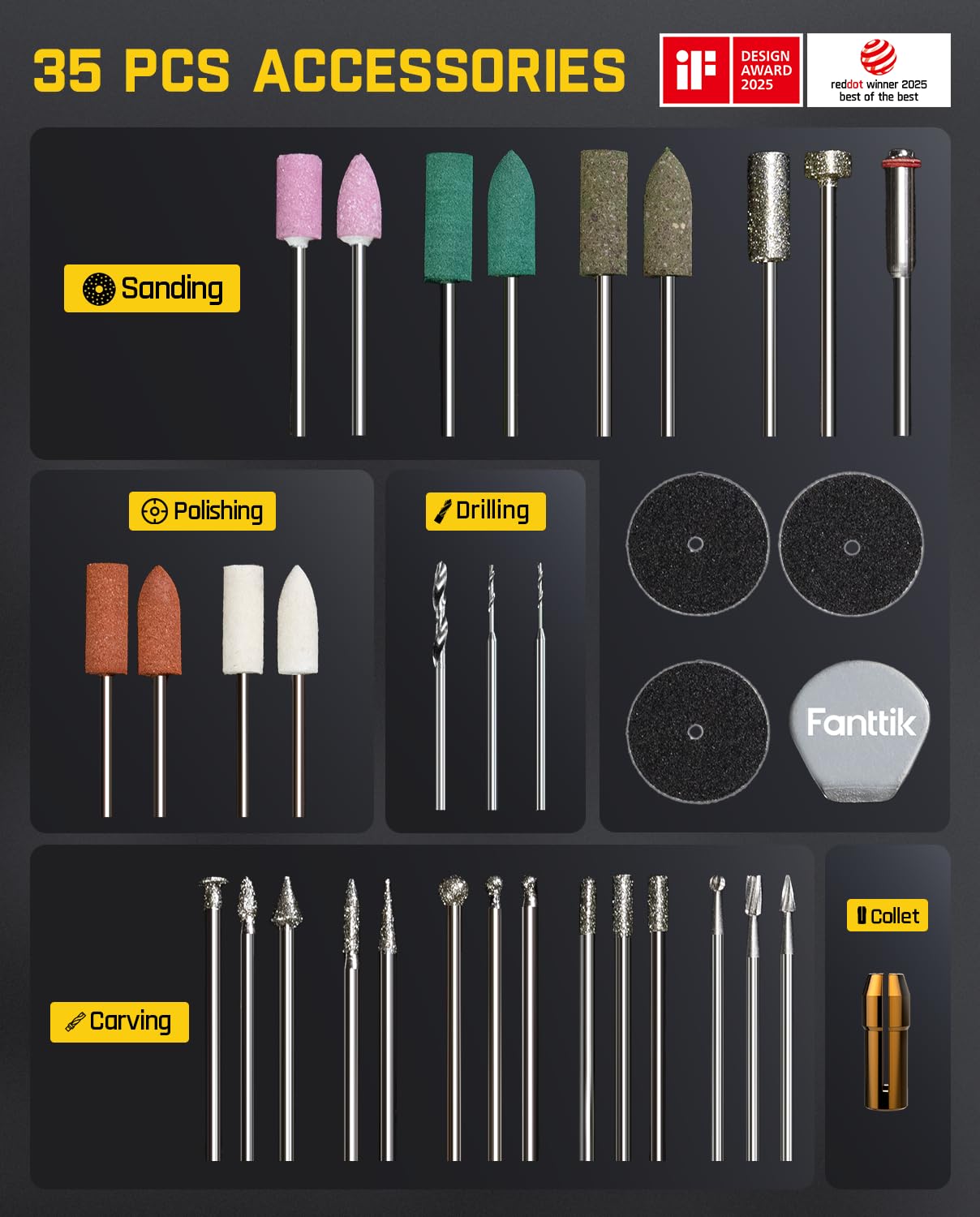 Revostor Hub: No more searching for attachments! The F2 Master features a 360° rotating magnetic stand with 35 organized accessories (3/32" / 2.3mm), making DIY tasks like grinding, polishing, drilling, engraving and 3D printing finishing easy and convenient