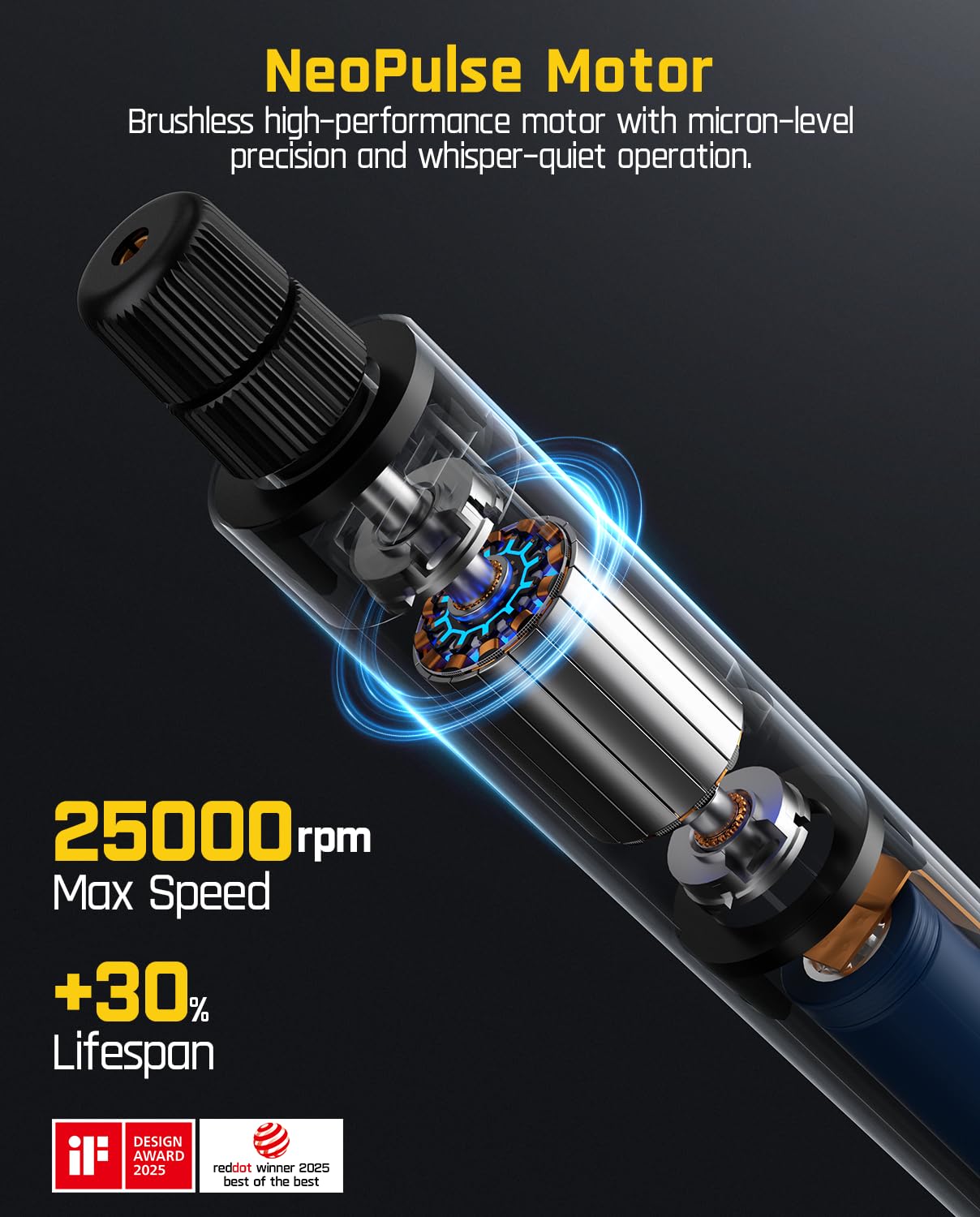 Whisper-Powerful: The Fanttik F2 Master features a brushless hollow cup motor that reduces noise by 30% compared to standard motors. Maximum speed: 25,000 RPM, it delivers stronger performance and less heat. 5 adjustable speed settings make it easy to handle various precision tasks