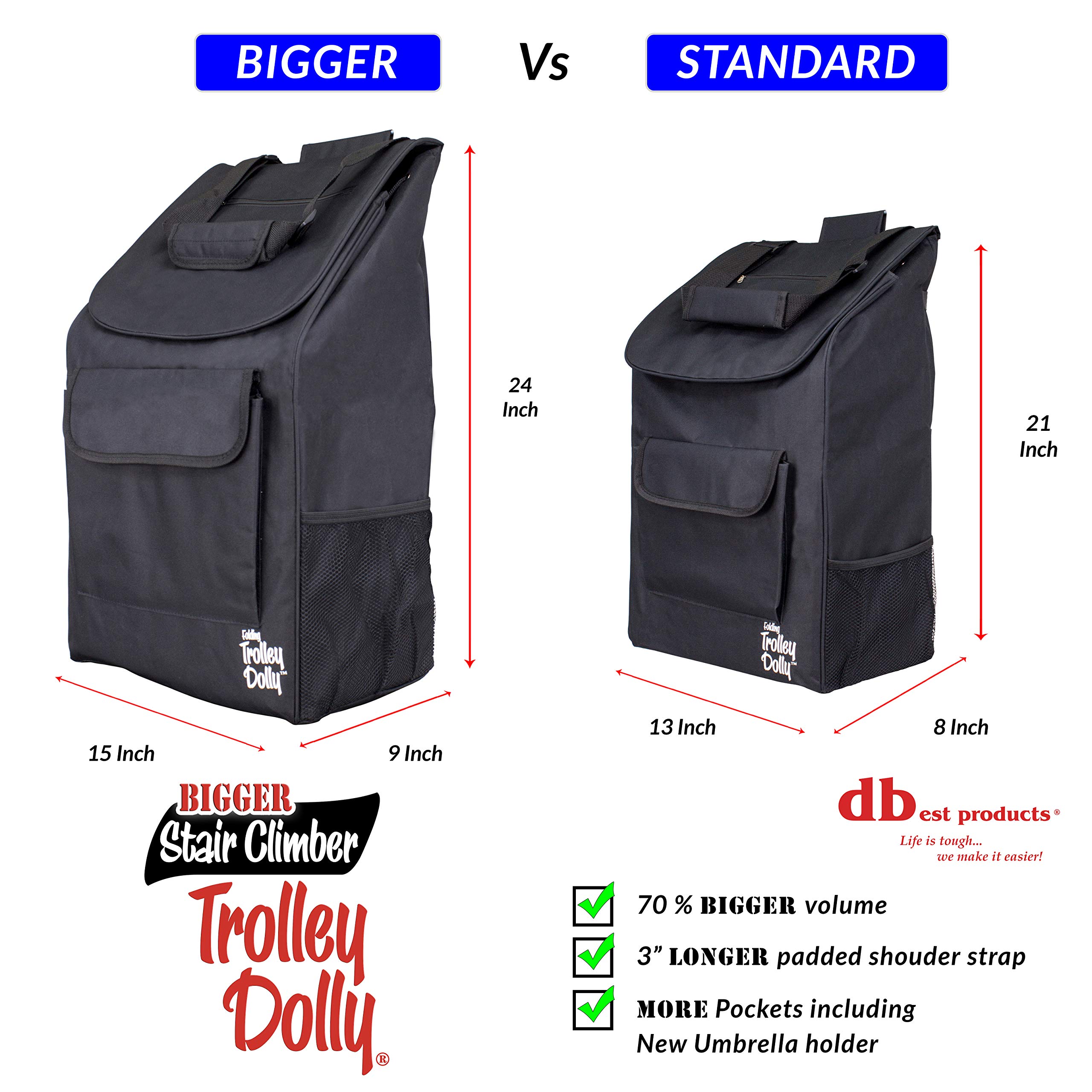 Stair Climber Bigger Trolley Dolly is the ideal Multi-Purpose hand truck to help you carry your groceries and other items up a flight of stair, curbs, sidewalks and other terrains. The Stair climber cart is collapsible for compact storage or it can become your easy to use portable Dolly while on the go. Whether you are running errands, shopping, moving boxes of supplies this dolly can help you carry it all! Stress-free without worrying how you will transport all your belongings or other goods. Our Trolley Dolly bag is able to carry all your items in ONE LARGE BAG IN ONE TRIP!! Let our new fully functional 6-wheel design do all the heavy lifting for you. It can lift all your belongings upstairs, downstairs, curbs or uneven paths. Take it to the supermarket, flea market or the beach; Capable of climbing high curbs and sidewalks with ease. The weatherproof material of the trolley bags keep contents dry from the rain, snow and the other forces of nature; Also includes soft ergonomic cushion handle which reduces the stress on the hands; Ideal for mobile seniors or shoppers without vehicles.