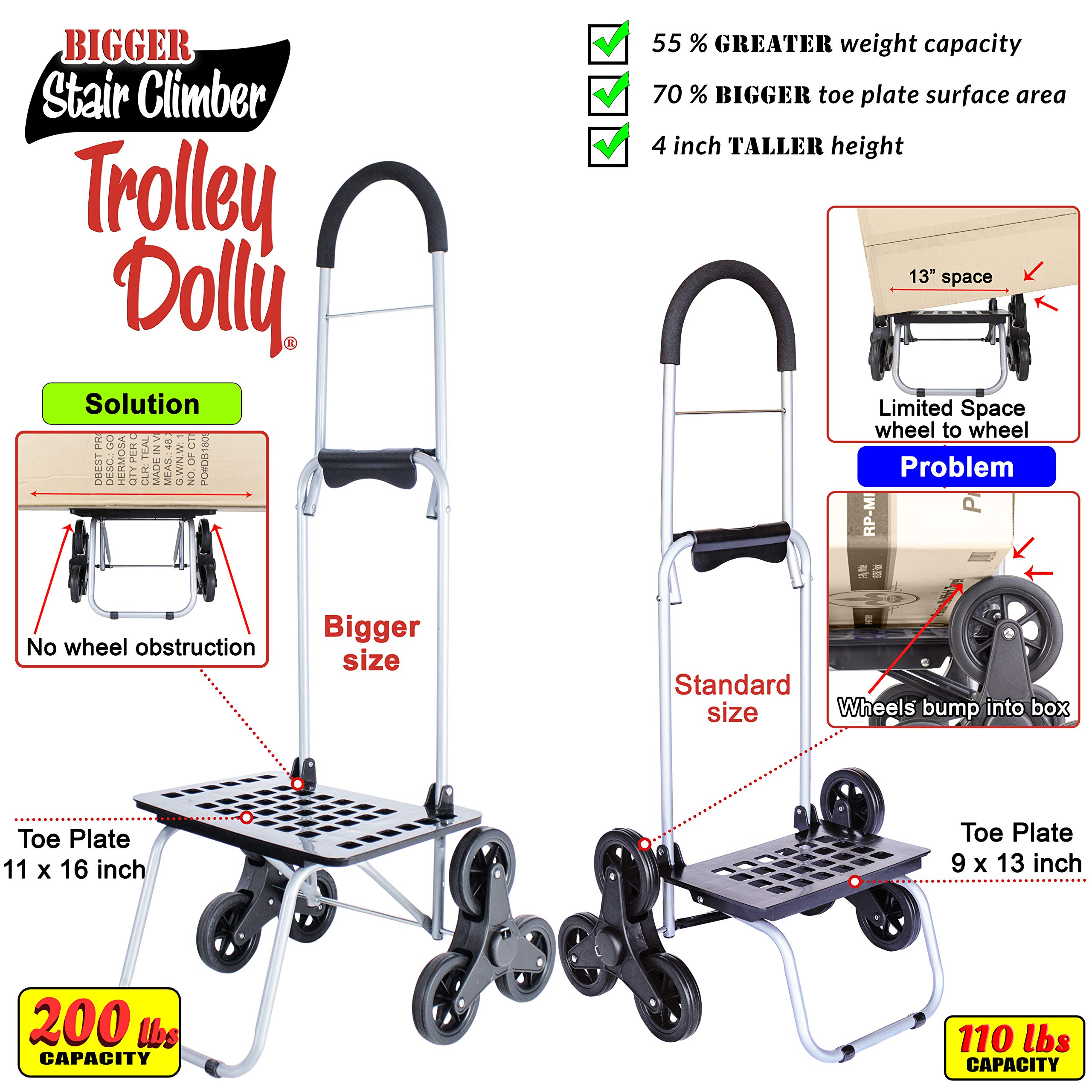 Our folding stair climber bigger trolley dolly cart perfectly balances lightweight capability with durability and features 6-wheel design that glides up and down stairs with ease. Take it to the supermarket, flea market or the beach