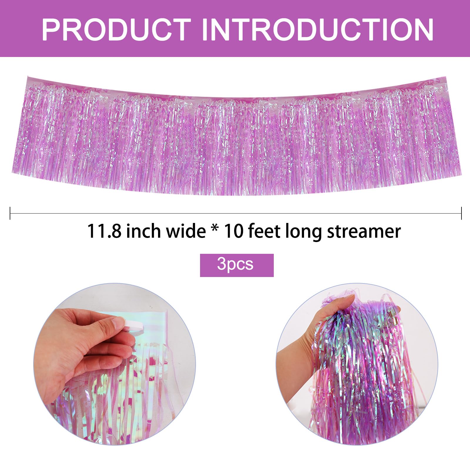 【Product name】Foil Fringed Garland 【Product includes】 △ 3 Packs Metallic Foil Fringe Garland (30 Feet in total) Sufficient length can meet your different parties decoration needs. 【Easy to install】 △ 1. It comes with double sided tape on the top, peel plastic strip off and it would be very easy to paste on smooth surfaces such as wall, window, table, door or anywhere you like. △ 2. Hang the banner to anywhere you want,which can be easily glued to the wall or table, and can be easily cut into any size to decorate your party. 【High quality】High quality metal foil △ We highly recommend this shining metal foil curtain / metal tassel garland,which is the perfect decoration for any birthday or party so that your party will be bright. △ You can choose from a variety of bright colors, such as ,purple,blue,black,pink,white,green,rainbow. Choose the color that matches your party. I'm sure that no matter which color, it will become the most dazzling decoration in your party. 【Perfect For Party】Perfect as party backdrop for birthdays, graduations, New Year's Eve, sweet 16, movie night, farewell party, retirement party, and so on.