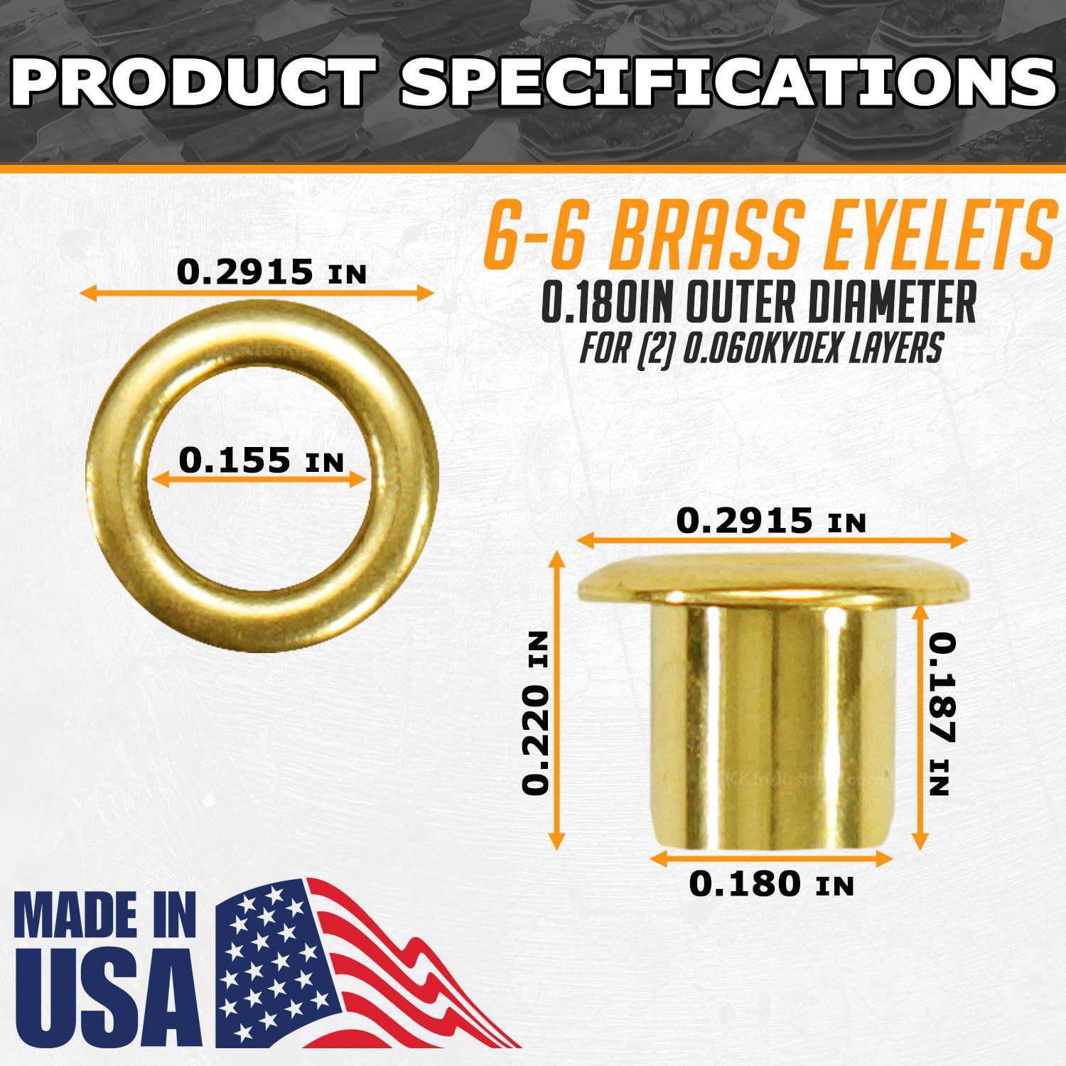 These are the industry standard (#6-6) 3/16 inch barrel diameter kydex eyelets (sometimes called kydex rivets) that are used in DIY Kydex, Holstex, and Boltaron holster and knife sheath making. They are also commonly used in making leather knife sheaths and gun holsters, and can be used in upholstery and garment manufacturing. The #6-6 eyelet length is designed for binding materials with a combined thickness to 0.120 inch. This allows for the proper roll-over head flaring needed to securely bind the combined materials. The through-hole needed for this eyelet is 0.1875 inches. With this diameter, the eyelet will press through the hole with minimum side-to-side play. This ensures that the materials being bound do not shift or misalign. Holstex professional-grade kydex eyelets are designed to roll-over (or "flare") perfectly when used with quality Kydex eyelet flaring tools and will create the perfect head finish demanded by professional and DIY holster makers when used for material binding. Holstex polished brass binding eyelets are the best-quality and most precise in the industry. They are used daily by top custom kydex holster makers and government contractors around the world. We have been supplying our polished brass kydex eyelets to custom kydex and leather holster builders, military suppliers, and law-enforcement professionals for over two decades. Holstex brass eyelets have been tested and approved by the most demanding consumers on the planet, those who put their lives on the line every day.