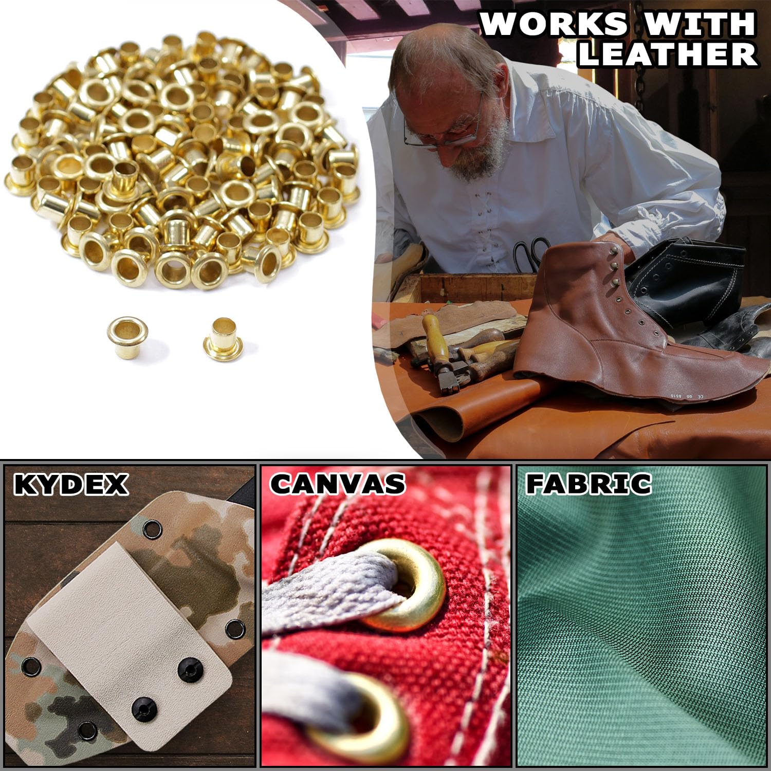 Material: Brass | (USA Made/non-corrosive) | HolsterSmith professional-grade KYDEX eyelets are designed to roll-over (or flare) perfectly when used with quality eyelet flaring tools, and will create the perfect head finish demanded by professional and DIY holster makers when used for material binding.