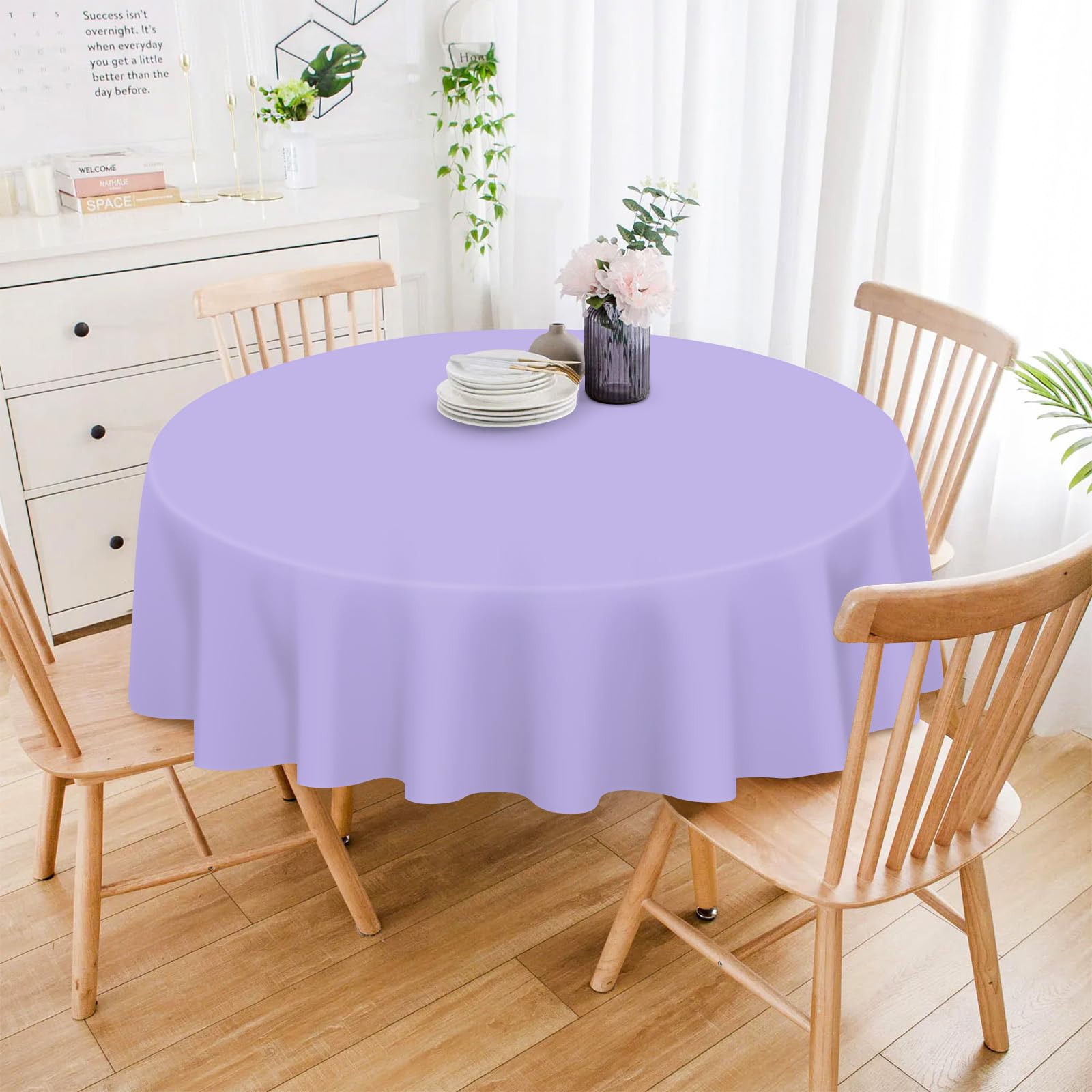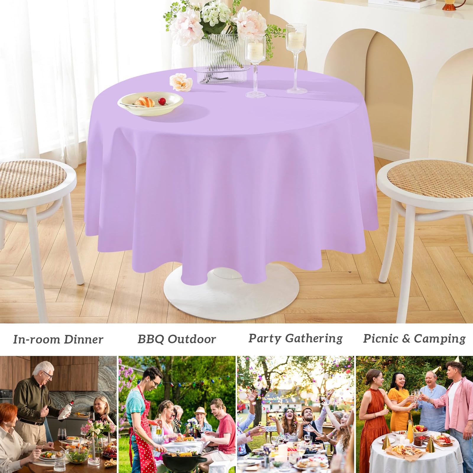 Excellent Quality: Light Purple round tablecloth for parties are made of premium durable PE material. Perfect for indoor-outdoor to provide a relaxed and minimalist space for dining and enjoying your party time