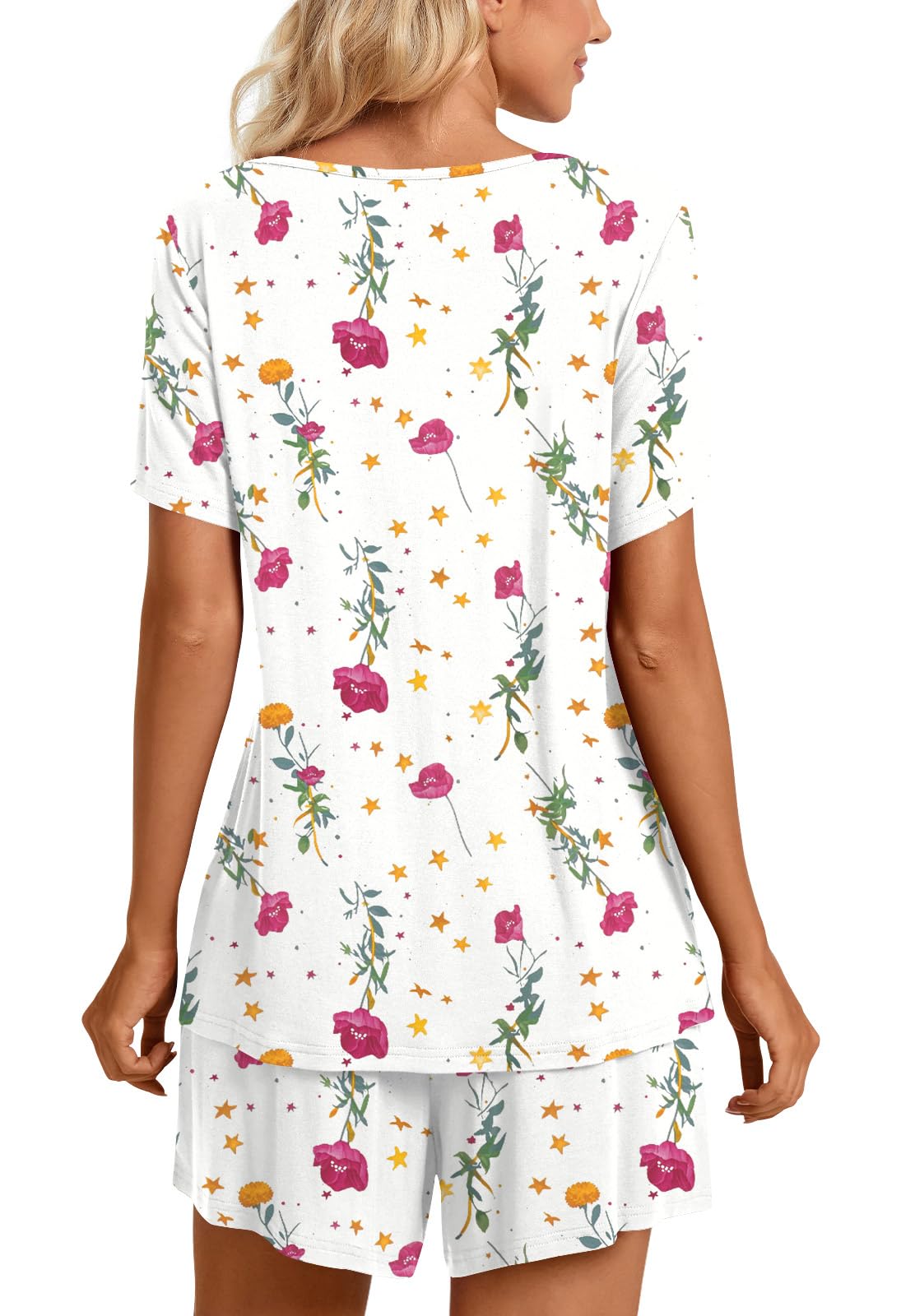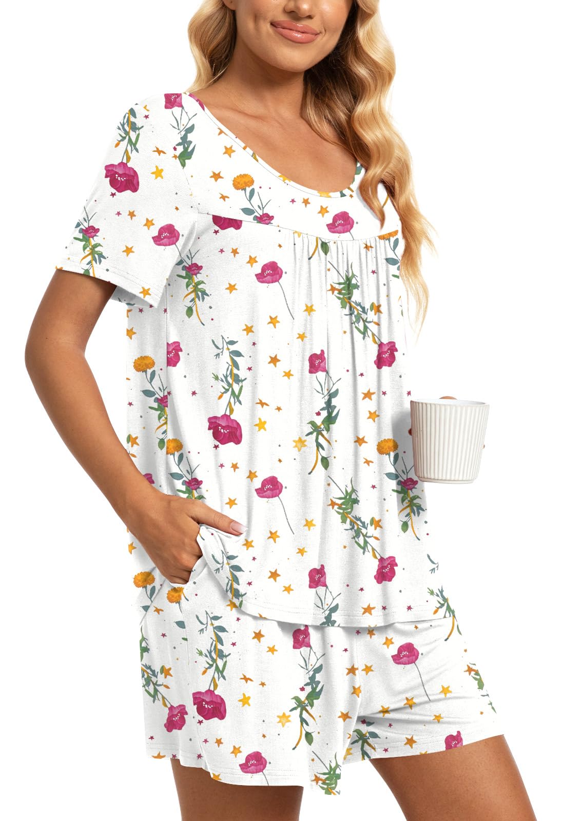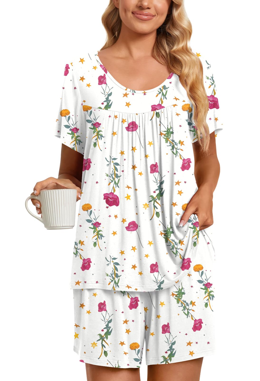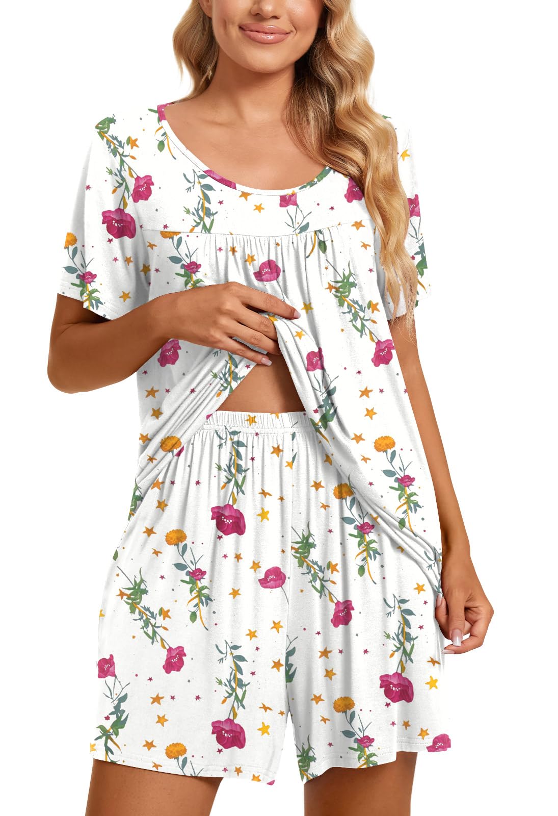 Fashion-Simple Design: Cute two piece outfits, short sleeve tops, soft nightwear, scoop neck and front pleated detailed design. Elastic waistband shorts, casual loose comfy, graceful and easeful