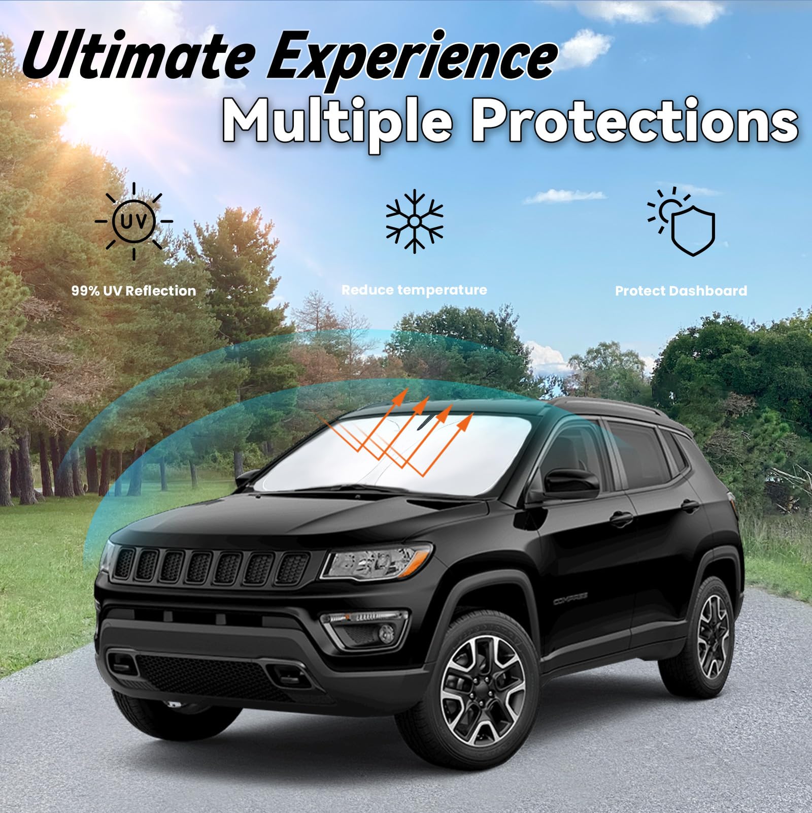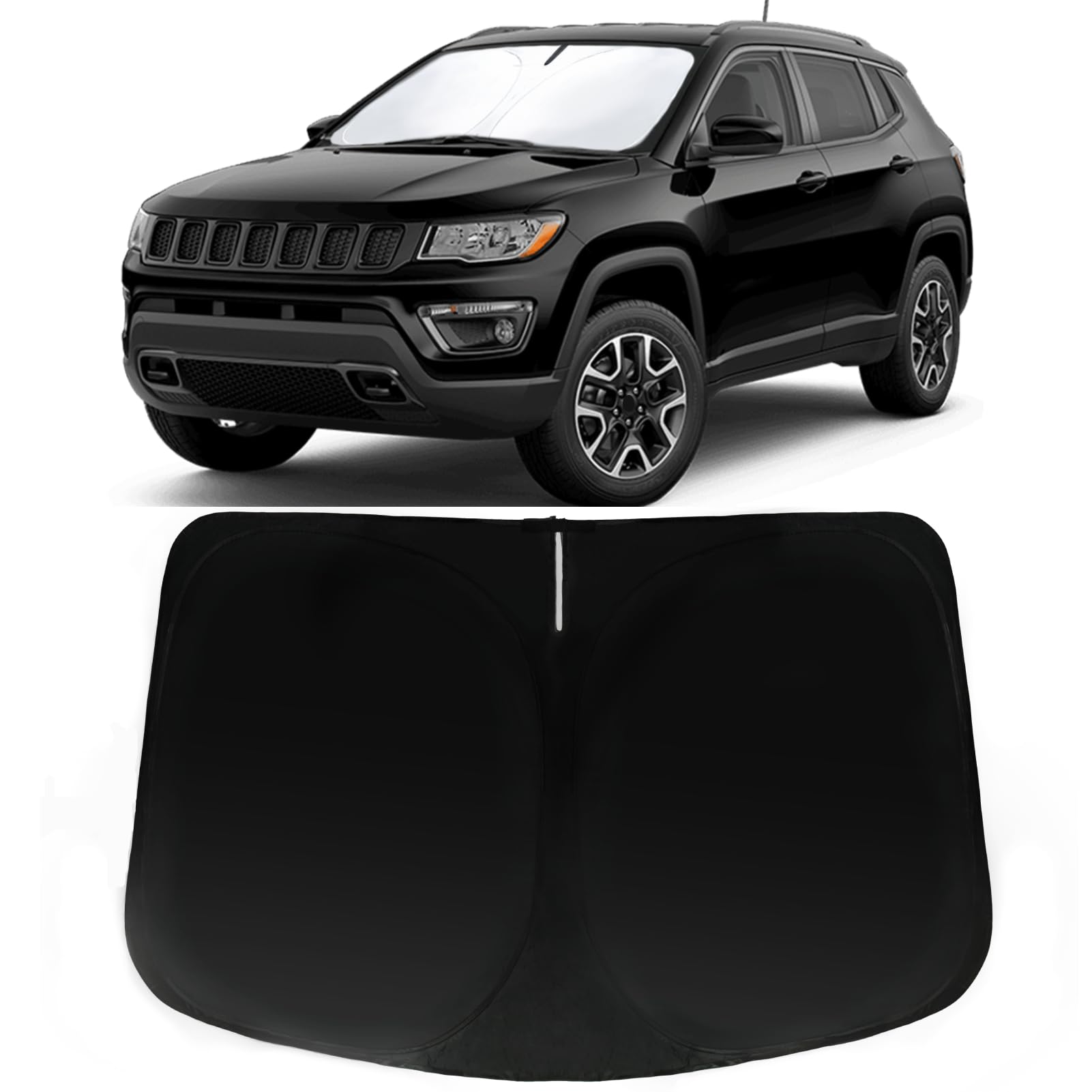 【Precise Fit】: Car sun shade for Jeep Compass 2017-2025 is custom-fit for a precise installation; It fits perfectly to your window without the need for suction cups; It won't sag or collapse, making it ideal for outdoor camping adventures